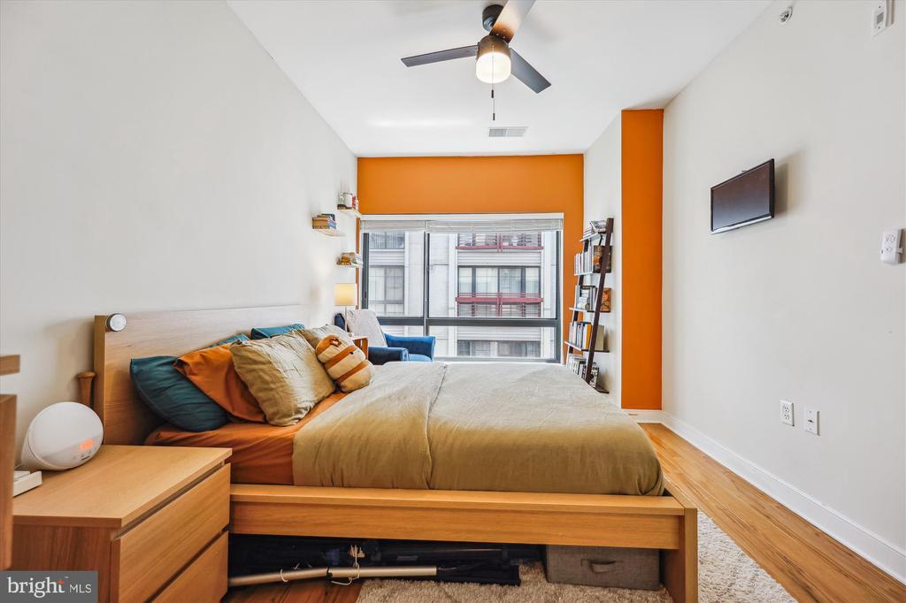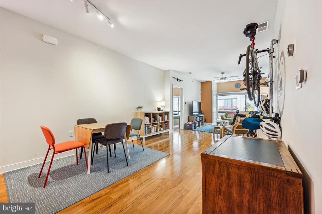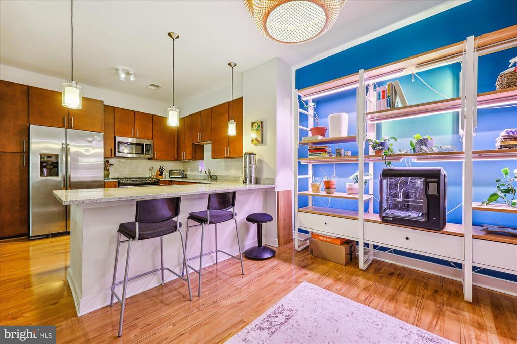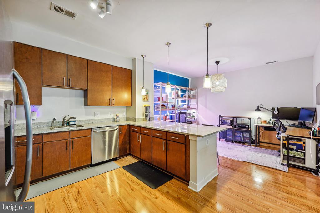 Welcome home to this modern and luxurious 1BR, condominium with 1.5 BAs, located in the heart of downtown Silver Spring. Enjoy the open concept, updated kitchen with gas cooking, stainless appliances and granite counters with breakfast bar, adjacent to a spacious dining area, while gleaming hardwood floors adorn the entire unit, except for the bathrooms, which feature ceramic tile floors. Both bathrooms are updated with granite topped vanities and the large primary bedroom also includes twin closets. The open living room includes office space and there is significant natural light throughout. Additional features include ceiling fans, track and pendant lighting and washer/dryer in unit. Lots of building amenities. Reserved Garage Parking only $75 a month. The Orion building has a beautiful lobby and is secure 24X7 and amenities include a wonderful fitness/exercise room, party room, and for entertaining, a rooftop deck with grill and fireplace. The building is also pet friendly. Walk to Silver Spring Metro and everything downtown, and there are two bus stops right around the corner on Eastern Ave. and another just down the block by Kennett Street. You will love living in this area there is so much to do and see. Shopping is also close by. Be sure to click the camera above the main picture to view the video tour, first one is audio and second is short and just music.