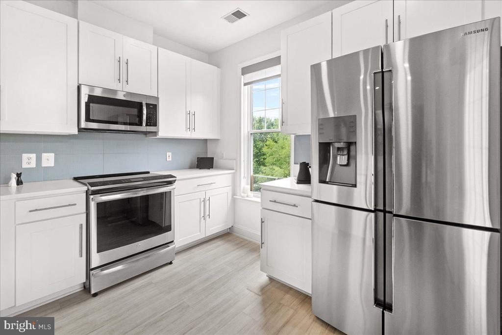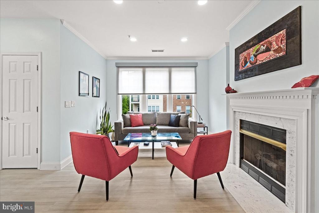PRICE IMPROVEMENT! Welcome home to 110 Chevy Chase St #301—an exceptional corner-unit condo offering 2 bedrooms, 2 baths, and 1,366 sq ft of beautifully upgraded living space in the highly desirable Kentlands community. Priced to sell in an elevator building and featuring a coveted attached garage! From the moment you enter, you’re greeted by gorgeous gray plank flooring, spacious entryway, and abundant natural light that fills every room. A sophisticated gas fireplace anchors the open living area, perfect for entertaining or relaxing. The sleek kitchen boasts bright white cabinetry, crisp white quartz countertops, and a full suite of stainless steel appliances, including an induction range with convection oven—ideal for the modern chef. Enjoy private outdoor space from your balcony perched among trees,. The perfect place to unwind or enjoy a morning coffee. The primary suite features high ceilings and generous closet space, as well as dual vanities in the upgraded primary bath. Additional highlights include a secure building with elevator and access to all that Kentlands offers: dining, shopping, lake, trails, parks, a gym, and community pool—all just steps away. With low-maintenance living, walkability, and convenience to commuter routes, this home is ideal for those looking to simplify in style.