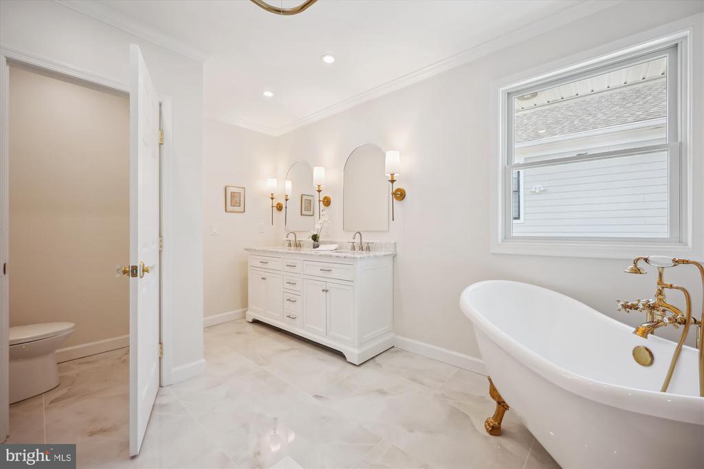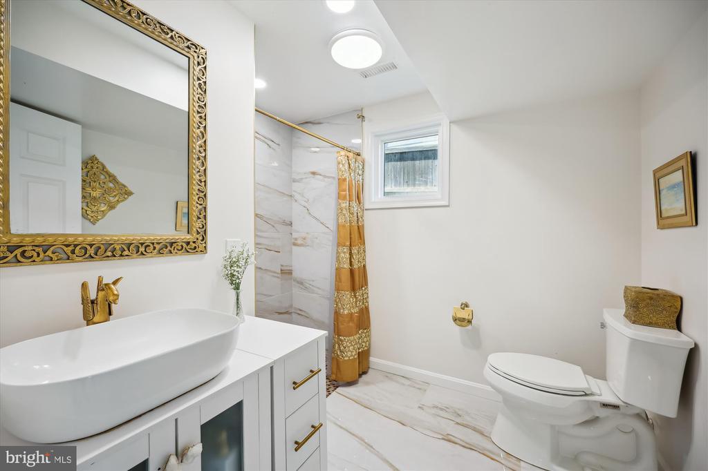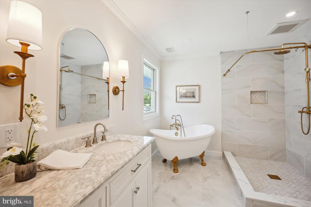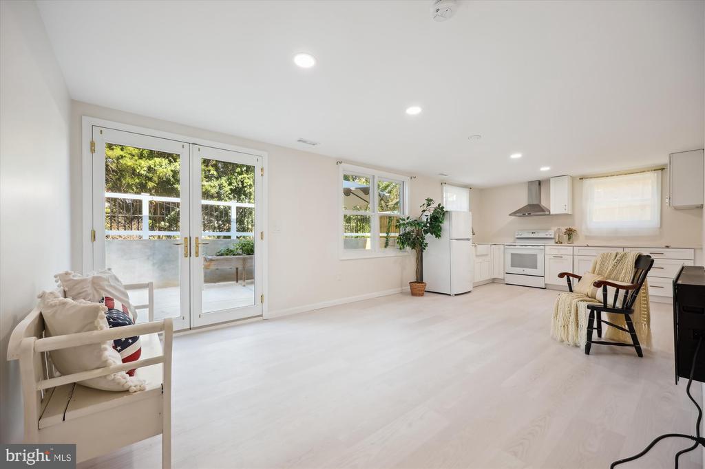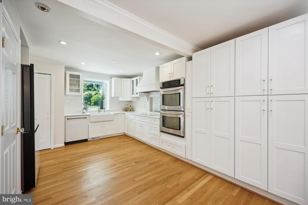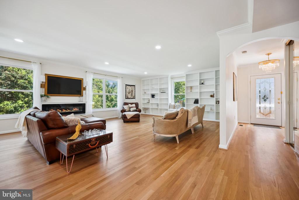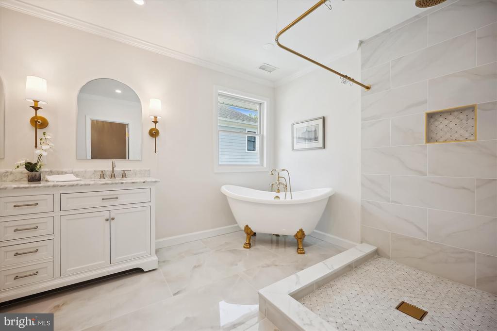 PRICE REDUCED. Storybook transformation into a bright and open 6BR/5BA three-level colonial with old-fashioned front porch and off-street parking in Georgetown Village, only a block away from the elementary school. Following a 2022 expansion/renovation, the home nearly doubled in size, and its floor plan now boasts approximately 4,800 square feet of living area on three levels, including a new in-law/au pair suite on the lower level. Fine craftsmanship, unique design, and quality materials define the showpiece home highlighted by an expansive open kitchen/dining/great room; hardwood flooring throughout the main and upper levels; renovated bathrooms with designer porcelain and ceramic tile; custom painting; upgraded lighting fixtures and recessed lighting; new LVP flooring in the lower level; Andersen windows, new roof and all-new siding.Peaceful outdoor space featuring professional landscape with manicured beds of designer shrubbery, a fenced-in yard with white vinyl picket in the front, and a private sunken patio with access to a storage room. Cobblestone paver walkway and flagstone steps to covered front porch with fieldstone water table, composite decking, beaded ceiling, vinyl railings, and recessed lighting; glass front door with side transoms open to foyer and living room/parlor with wood-burning fireplace and bay window; open concept chef’s kitchen with self-closing white shaker cabinetry with pull-out drawers, quartz countertops, tumbled tile backsplash, white porcelain farm sink with box window ledge, champagne bronze faucet and cabinet hardware, recessed lighting, upgraded appliances, commercial range hood, pantry cabinets and pantry closet; center island breakfast bar with pendant lighting and quartz waterfall countertops opens to informal dining area and great room with tons of windows and rear double French doors; great room with built-in linear electric fireplace, TV above, and a wall of built-in bookshelves; separate exterior side entrance into hallway with coat closet right outside of the main level bedroom/study; renovated main level full bath; solid oak staircase to upper-level hallway with designer chandelier, recessed lighting, and linen closet; glass French door into primary bedroom suite with recessed lighting, separate sitting area with built-in linear electric fireplace, double-door closet and walk-in closet with custom built-in shelving and drawers; primary bathroom renovation in 2025 features 24” x 48” porcelain flooring, double vanity with marble top, clawfoot soaking tub; walk-in shower with designer floor and porcelain tile surround, and separate water closet; three additional upper-level bedrooms with chandeliers and recessed lighting; remodeled hall bath with ceramic tile flooring and tub with porcelain tile wall surround connected to upper-level laundry room with full-size washer & dryer, utility sink, and cabinet storage; finished lower-level of original home with LVP flooring, recreation room and fitness room with full bath; step-down to newly finished in-law/au pair suite with private glass door side entrance; LVP flooring; second laundry hook up for stackable unit; bedroom with recessed lighting and walk-in closet; new porcelain tile full bath with zero-entry curbless walk-in shower; full daylight living room with recessed lighting, linear electric fireplace, full kitchen, and French doors to sunken concrete patio; storage room access from outside patio; three zones of heating and cooling (2018 and 2022), new roof, siding and gutters (2022).