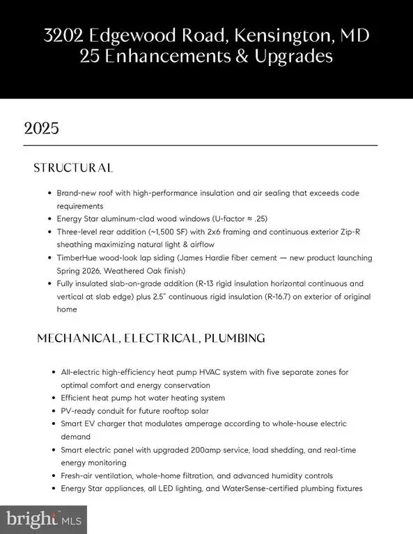 Welcome to The Retro Rambler — a mid-century gem reimagined for modern living. While the name nods to its 1960s roots, there’s nothing “rambling” about this home anymore. Nearly every space has been rethought with intention — blending timeless design, warm livability, health-forward materials, and high-performance upgrades throughout. 3202 Edgewood Rd is a 5-bedroom, 3-bath home offering just under 3,300 SF of living space including a detached studio and a beautiful treehouse-style primary retreat perched on the top level, wrapped in natural light and treetop views. Renovated by award-winning Symbi Homes, the transformation left no detail untouched — with a brand-new roof, systems, appliances, and finishes throughout — every space has been thoughtfully reimagined for beauty, functionality, and well-being. From the moment you arrive, the home’s curb appeal makes a statement. Clean modern lines, a welcoming front porch, and the striking exterior of Energy Star aluminum-clad wood windows paired with Timber-Hue wood-look lap siding by James Hardie define its modern aesthetic. This home is only the second in the nation to feature durable TimberHue ahead of its Spring 2026 release, shown here in Weathered Oak for an authentic wood-inspired finish that complements the home’s mid-century character. When you enter the home, you’re welcomed into a front living room that can flex as a greeting space, dining room, or sitting room. From there, your eyes are immediately drawn to the striking three-level rear addition, where soaring ceilings and expansive windows flood the kitchen and family room with natural light. Anchored by a chef’s kitchen with a full island and bar seating, this open space becomes the true heart of the home. Step out to the large side balcony, spacious enough for seating and grilling — an inviting extension of the living area. This level also includes two bedrooms and a full bath, along with a versatile laundry/mudroom that serves dual purposes. Upstairs, the newly added primary suite isn’t just a bedroom — it’s a private retreat. It features a spa-like bath, a beautiful private balcony, a large walk-in closet, and a small bonus room attached that can be used as an office or a cozy sitting area. It is truly your own personal haven. The lower level, with its own entrance, includes two bedrooms, a full bath, kitchenette, and recreation room — ideal for guests, multigenerational living, or rental income. From here, step outside to a private patio, offering another outdoor space for relaxing or entertaining. A detached backyard studio adds even more flexibility, whether for a gym, office, or creative space. Symbi’s signature approach to health and sustainability includes: All-new high-efficiency heat pump HVAC and water heating, PV-ready for future solar and EV charger, Upgraded smart electric panel with energy monitoring, Beyond-code insulation and air sealing, Green-certified, sustainable materials, Intuitive smart home automation. This home will also be certified Zero Energy Ready by the U.S. Department of Energy — a rare achievement reached by fewer than 1% of new homes and remodeling projects each year. Nestled in the Homewood neighborhood of Kensington, a quiet, tree-lined community known for its walkability and charm, you’ll enjoy easy access to parks, playgrounds, and the Saturday farmer’s market. Stroll to The Dish & Dram for a cozy meal or grab a slice at Continental Pizza, along with other local restaurants. Plus, the Kensington MARC Station is within walking distance, making it easy to hop on a train into Washington, D.C. and beyond. This is more than a renovation — it’s a reimagining of what home can be: connected, efficient, and designed for a vibrant, healthy lifestyle.