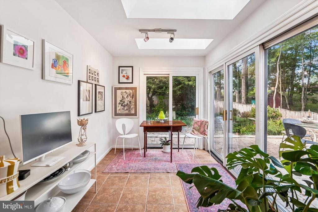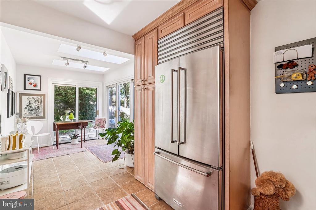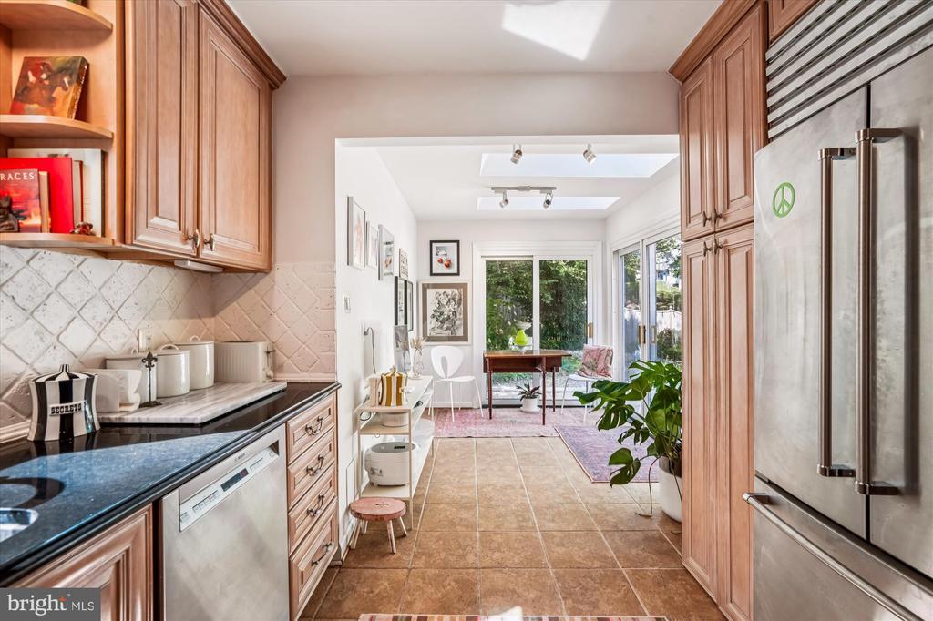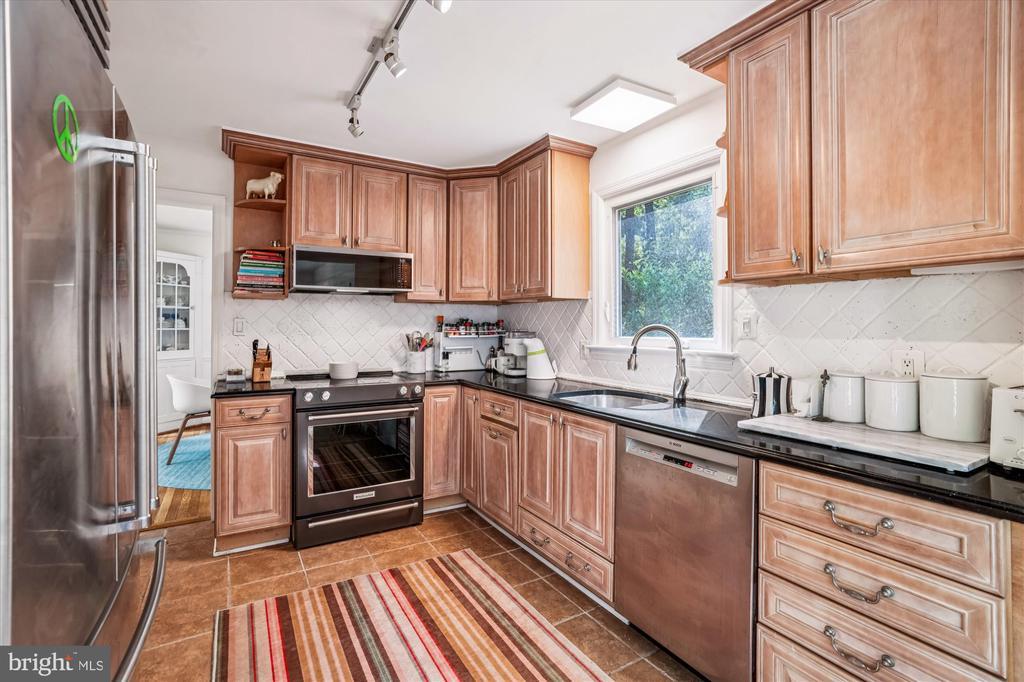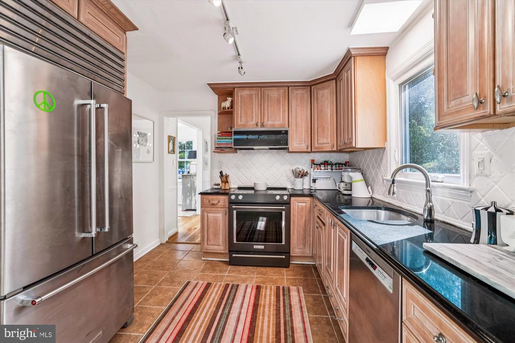 Welcome to 11300 Kenilworth Avenue, a charming and beautifully updated 4 bedroom, 2 bathroom, 3 level home perfectly situated on a quiet street in historic Garrett Park. Freshly painted in neutral tones, this inviting residence features a welcoming ceramic tile foyer on the entry level, where you’ll find a comfortable bedroom, a laundry room with storage, and convenient access to the attached garage. The main level showcases refinished solid hardwood floors and a bright, open layout. Enjoy a spacious family room with skylights, a cozy wood-burning brick fireplace with mantel, and elegant built-in corner cabinets in the dining room. The thoughtfully designed kitchen offers ceramic tile flooring, granite countertops, a stylish tile backsplash, and brand new stainless steel appliances. An inviting and a sunny breakfast area beneath skylights opens to a stone patio, perfect for morning coffee or outdoor dining. Upstairs, the third level features a serene primary suite with hardwood floors and a brand-new (2025) modern primary bathroom. Two additional bedrooms and an updated full bathroom complete the upper level, providing comfortable accommodations for family or guests. Outside, the property boasts an attached garage, an updated driveway, tasteful hardscaping and landscaping, a graded front yard, durable Hardiplank siding, and three flagstone patios- two in the backyard and one on the side. The fully fenced yard is ideal for play, pets, or entertaining. This beautifully maintained home blends classic charm with modern updates and offers comfort, style, and convenience in one of Garrett Park’s most desirable settings. Recent upgrades include a new HVAC (2024), patio doors (2025), kitchen appliances (2024), driveway and landscaping (2023) dryer, light fixtures, electrical box and switches.