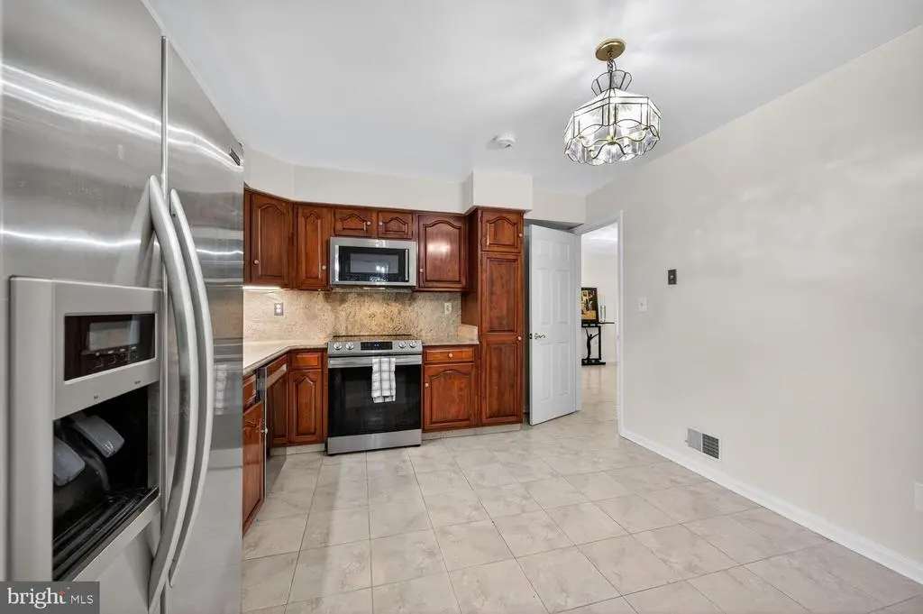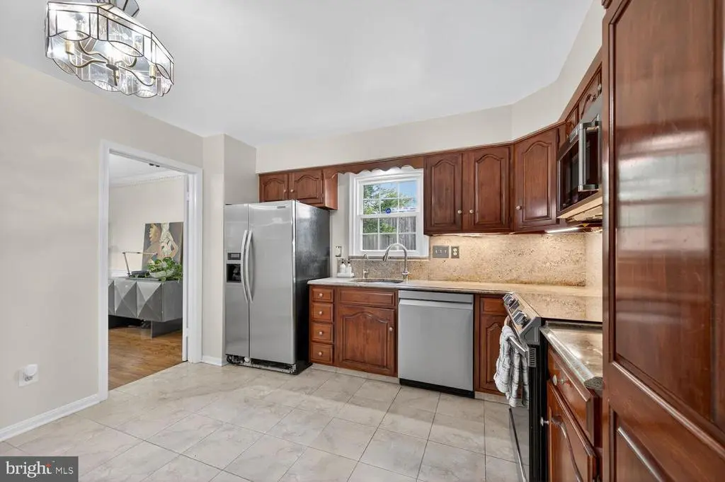 Rarely available all-brick end-unit with garage in Manor Village, this is your chance to own a standout home in a sought-after community! Offering 3 bedrooms, 2 full and 2 half bathrooms across three finished levels, this home delivers space, style, and thoughtful design. Step inside to discover hardwood and tile flooring throughout the main level, accented by crown molding and chair railings. French doors open from the living area to your private, fully fenced backyard with a stone patio, perfect for entertaining or relaxing outdoors. A stunning curved staircase serves as an architectural focal point while connecting all three levels. The spacious kitchen impresses with granite countertops, stainless steel appliances, cherry oak cabinetry, and a pantry. Natural light floods the dining area through a beautiful bay window, creating a warm and inviting space for meals. Upstairs, the primary suite features dual closets and double vanities. Two additional well-appointed bedrooms provide plenty of space for family, guests, or a home office. The upper-level laundry room includes open shelving, a utility sink, and abundant natural light. The finished lower level offers incredible versatility: a spacious recreation room with brick fireplace, a bonus room ideal for a home office or gym, a half bath, and rough-in plumbing for a wet bar, ready for your personal touch. Additional highlights include an attached one-car garage with epoxy flooring, a private driveway, and a welcoming front porch. Located near the ICC, Rockville Town Square, and major commuter routes, with shopping and dining just minutes away.