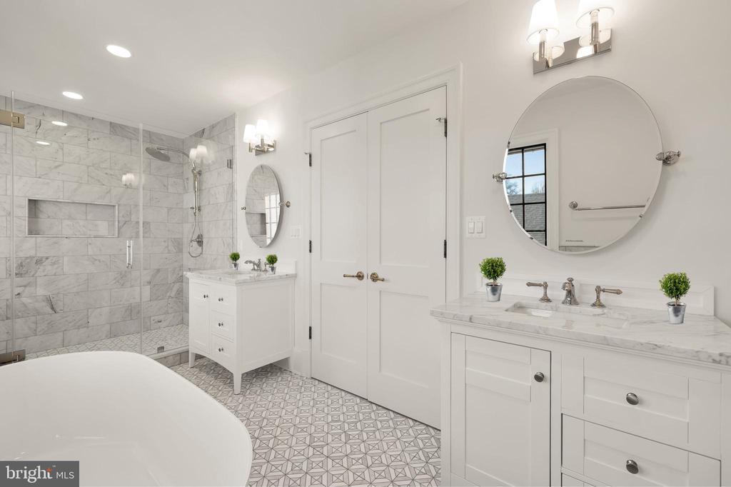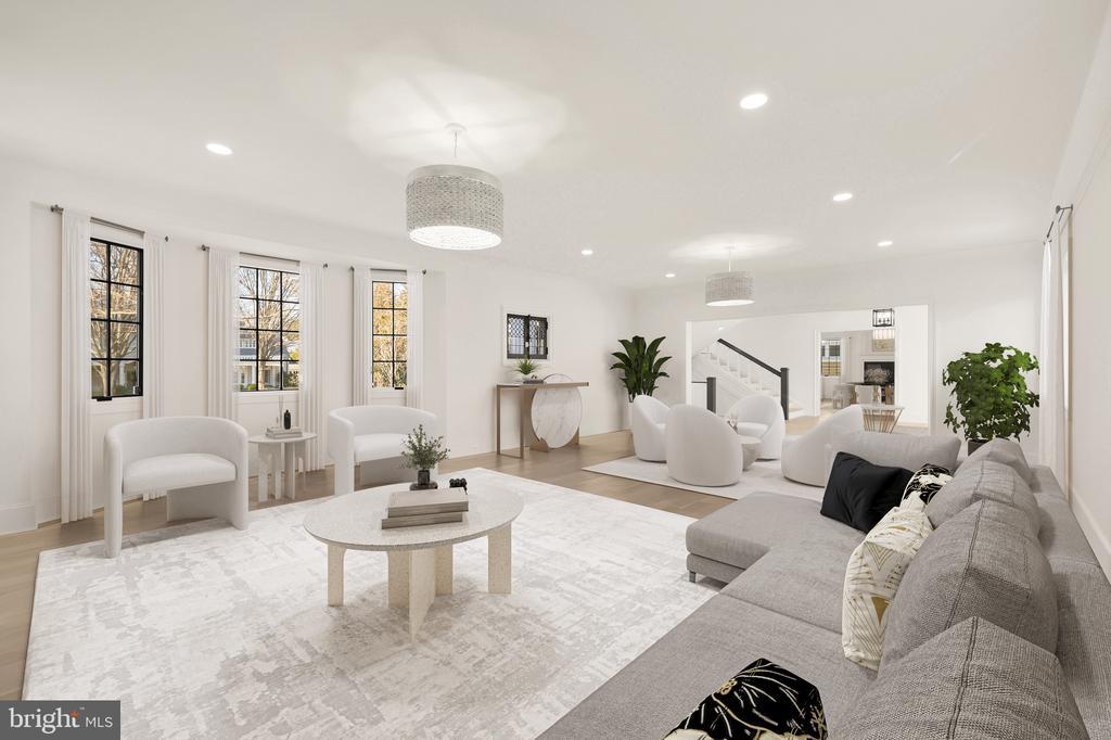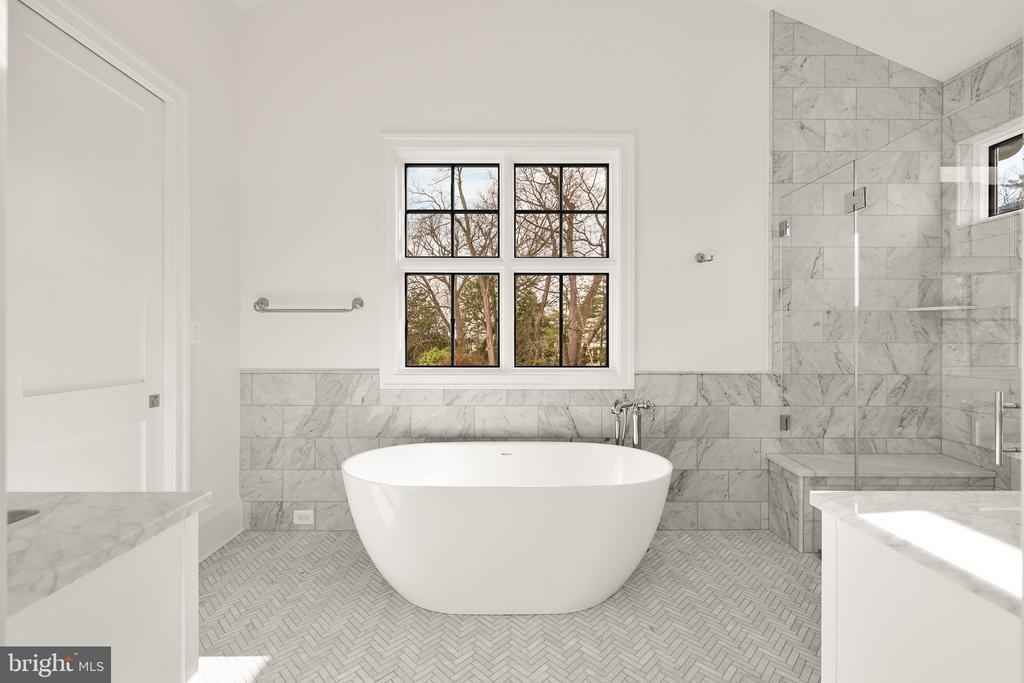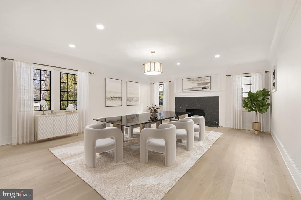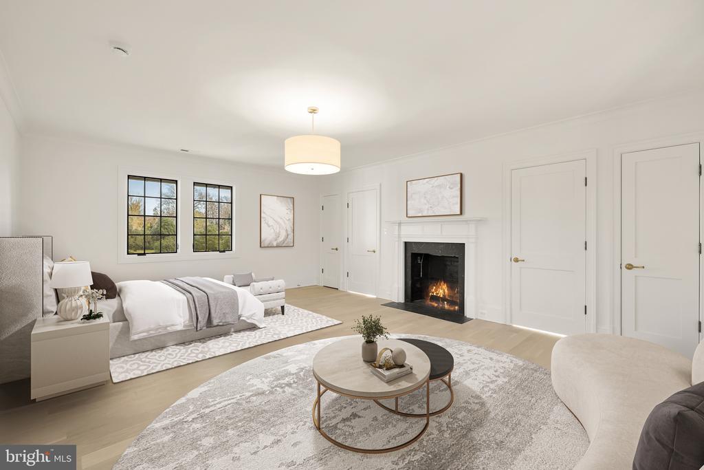 In the heart of Edgemoor, Bethesda’s preeminent residential community, is 7611 Fairfax Road, a faithfully reinterpreted 1915 Tudor estate blending the utmost in modern luxury with classical workmanship and tasteful architectural finishes. Sited on a 1/2 acre prime level lot, merely three blocks to Downtown Bethesda’s glass towers, the home represents a once-in-a-lifetime, no compromises opportunity. With prominent curb appeal, the facade evokes a sense of old world charm with its contrasting timbered trim and artful gables. The elegant arched glass and iron front door reveals an elegant reception hall and tucked away main staircase, introducing a reconfigured floor plan spanning a generous 7,600 square feet. In the nod to tradition, formal living and dining rooms flank the vestibule in a classic center hall layout. Both formal spaces are embassy-sized — the former spanning a full 30 feet in length — and feature roaring fireplaces. Off the living room is an intimate sunroom opening up to the grounds. In the center of the main level is a stunning chef’s kitchen with custom cabinetry and an imported commercial Italian oven. Stackable glass sliders open to reveal the patio and bring the outside in. Double doors part ways to reveal the main level primary suite’s private sitting room. The adjacent sleeping area features a soaring cathedral ceiling and offers direct outdoor access. The ubiquitous luxury amenities – marble-clad bath with dual vanities, freestanding tub, glass shower, enclosed water closet, and designer fixtures, as well as twin walk-in dressing rooms make the suite a secluded oasis. An expansive mudroom and access to the attached three car garage complete the main level. On the upper level is a second primary suite featuring a private fireplace and two truly expansive dressing rooms. Its ensuite bath mirrors the main level primary suite’s in both opulence and amenities. Three additional secondary bedrooms, each with ample closet space and marble ensuite baths, complete the upper level. A set of stairs accesses extensive storage space in the attic, while more storage space is provided in the lower level. During the transformation, the estate was taken down to the studs and contains all new HVAC, plumbing electrical, flooring, roof, and windows to establish a truly modern residence. Outside, nearly a half acre of flat, usable space affords expansive grass lawns and total privacy while remaining virtually unheard of in such a central location. Situated within walking distance to shops, restaurants, parks, entertainment and belonging to award-winning schools, 7611 Fairfax Road establishes itself as a leading estate in one of the Capital Region’s most sought after locations.