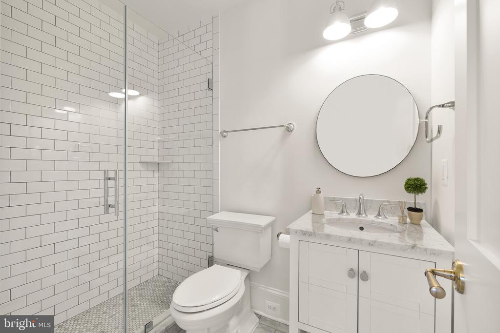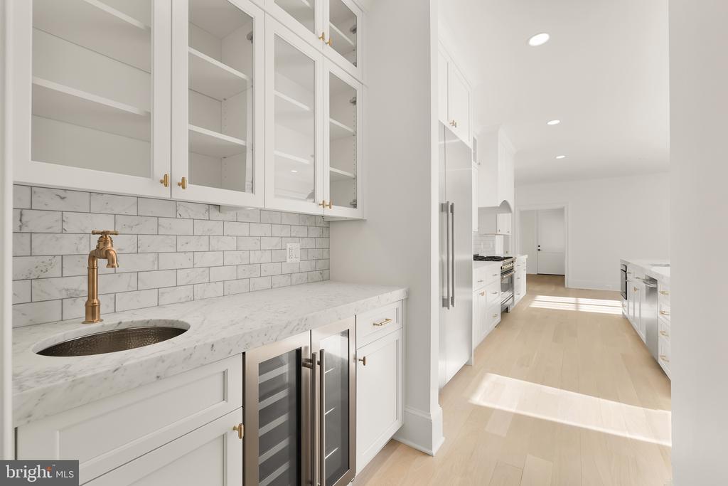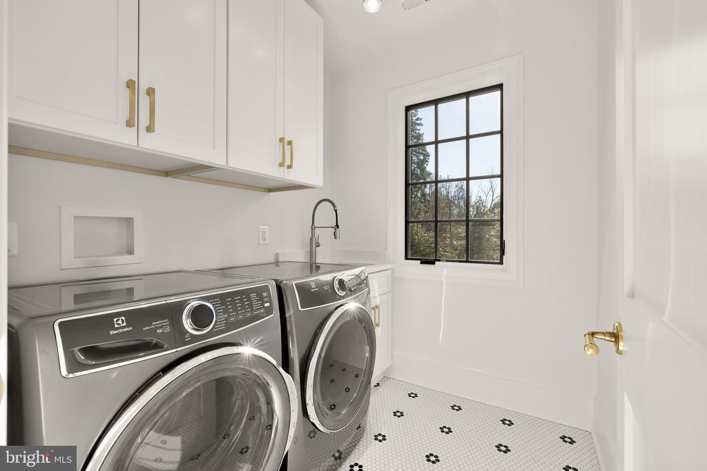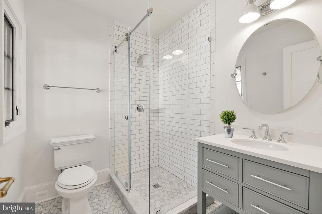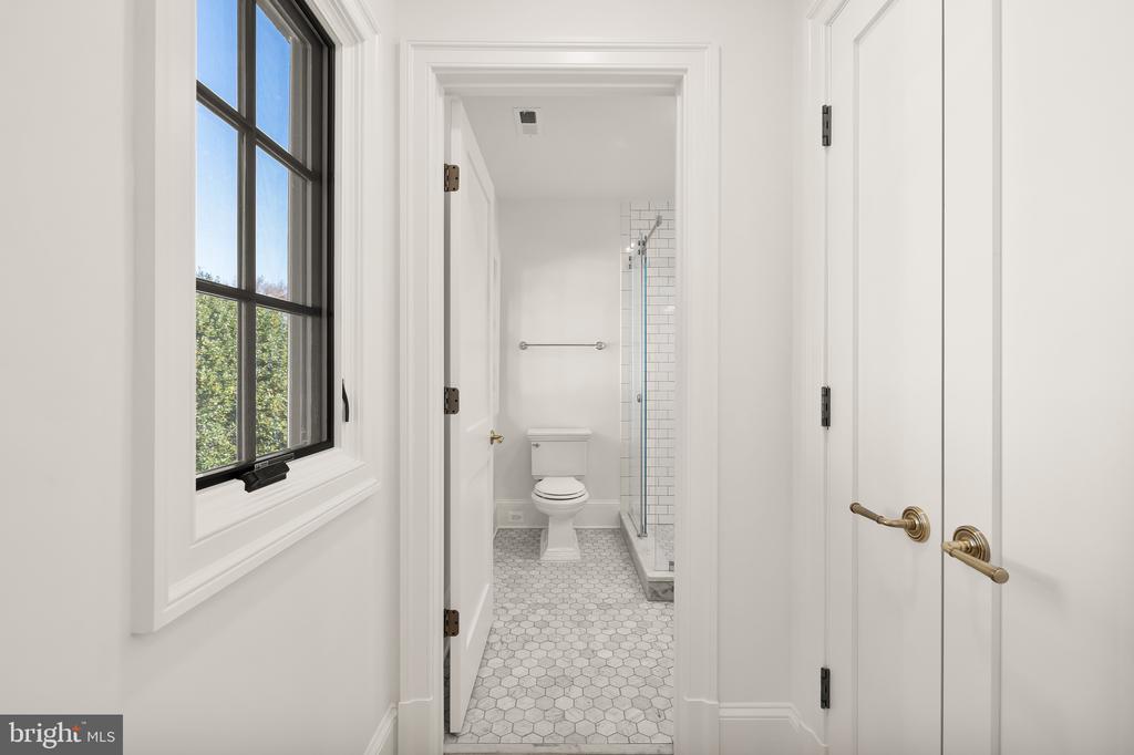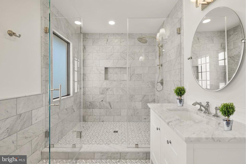 In the heart of Edgemoor, Bethesda’s preeminent residential community, is 7611 Fairfax Road, a faithfully reinterpreted 1915 Tudor estate blending the utmost in modern luxury with classical workmanship and tasteful architectural finishes. Sited on a 1/2 acre prime level lot, merely three blocks to Downtown Bethesda’s glass towers, the home represents a once-in-a-lifetime, no compromises opportunity. With prominent curb appeal, the facade evokes a sense of old world charm with its contrasting timbered trim and artful gables. The elegant arched glass and iron front door reveals an elegant reception hall and tucked away main staircase, introducing a reconfigured floor plan spanning a generous 7,600 square feet. In the nod to tradition, formal living and dining rooms flank the vestibule in a classic center hall layout. Both formal spaces are embassy-sized — the former spanning a full 30 feet in length — and feature roaring fireplaces. Off the living room is an intimate sunroom opening up to the grounds. In the center of the main level is a stunning chef’s kitchen with custom cabinetry and an imported commercial Italian oven. Stackable glass sliders open to reveal the patio and bring the outside in. Double doors part ways to reveal the main level primary suite’s private sitting room. The adjacent sleeping area features a soaring cathedral ceiling and offers direct outdoor access. The ubiquitous luxury amenities – marble-clad bath with dual vanities, freestanding tub, glass shower, enclosed water closet, and designer fixtures, as well as twin walk-in dressing rooms make the suite a secluded oasis. An expansive mudroom and access to the attached three car garage complete the main level. On the upper level is a second primary suite featuring a private fireplace and two truly expansive dressing rooms. Its ensuite bath mirrors the main level primary suite’s in both opulence and amenities. Three additional secondary bedrooms, each with ample closet space and marble ensuite baths, complete the upper level. A set of stairs accesses extensive storage space in the attic, while more storage space is provided in the lower level. During the transformation, the estate was taken down to the studs and contains all new HVAC, plumbing electrical, flooring, roof, and windows to establish a truly modern residence. Outside, nearly a half acre of flat, usable space affords expansive grass lawns and total privacy while remaining virtually unheard of in such a central location. Situated within walking distance to shops, restaurants, parks, entertainment and belonging to award-winning schools, 7611 Fairfax Road establishes itself as a leading estate in one of the Capital Region’s most sought after locations.