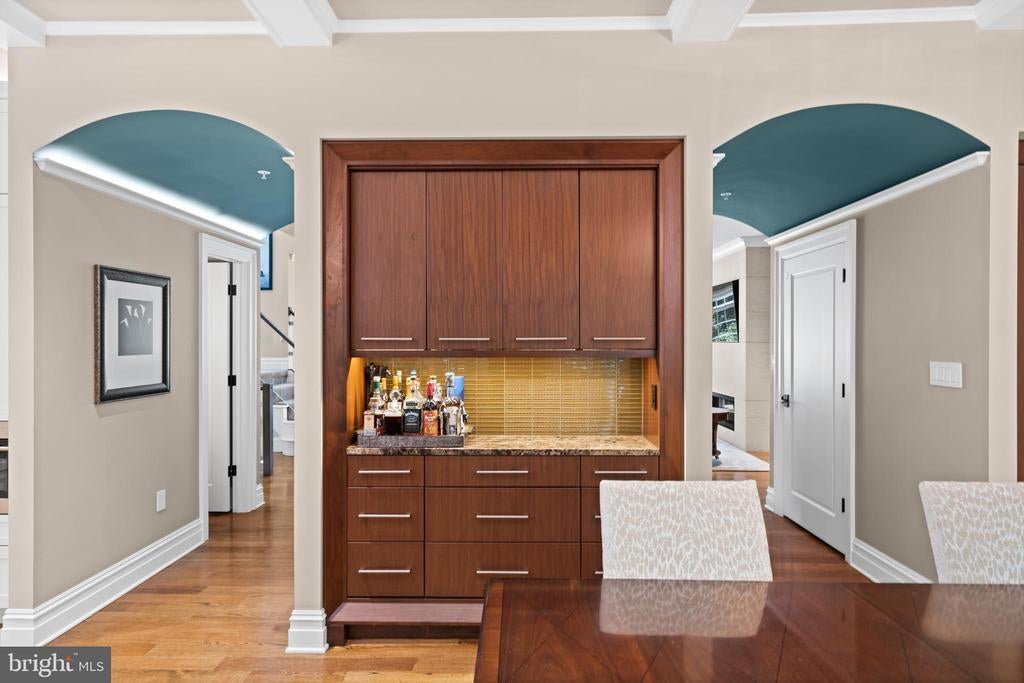 Reimagined on all floors by award-winning Sroka Design, this Bannockburn Ridge end-unit offers contemporary sophistication and effortless flow across three light-filled levels all connected by a private, three-stop elevator. Walls of windows and an open glass staircase fill the home with natural light, highlighting 10’ ceilings, hardwood floors, and thoughtfully curated finishes. At the heart of the home, the luxury gourmet kitchen showcases a dramatic quartz waterfall island, Wolf range, Sub-Zero refrigeration, custom cabinetry, and designer lighting — complemented by a walnut bar with glass tile backsplash. Just steps away, the dining room offers abundant built-in storage, balancing form and function with ease. The expansive living room is anchored by a limestone gas fireplace with floor-to-ceiling walnut built-ins, creating a warm yet refined gathering space. Upstairs, the primary suite is a true retreat with its wall of windows, marble bath with dual sinks, and a boutique-style walk-in closet with center island. Two additional bedrooms and a full bath provide comfort and flexibility. The lower level extends the living space with a guest suite or office, a bath, laundry, and direct access to the two-car garage. Outside, the rear yard is finished with new stonework, in-ground irrigation, and a flexible exterior lighting plan, perfect for outdoor dining or entertaining while listening to the whole house Sonos system. Set within the Whitman School District and just minutes from downtown Bethesda, this residence offers easy access to downtown D.C. and I-495. With its refined design, private setting, and truly turnkey appeal, it is the perfect blend of luxury, location, and contemporary living.