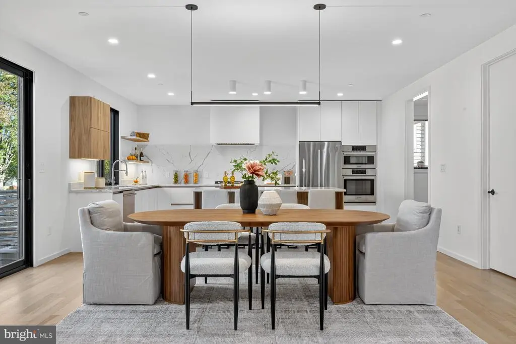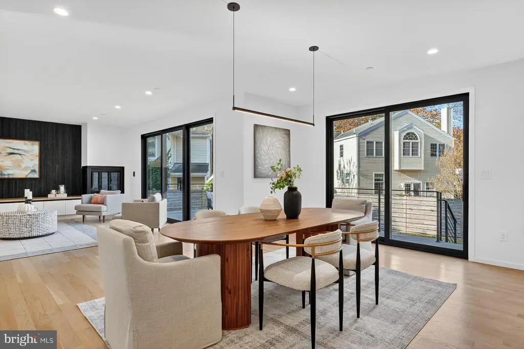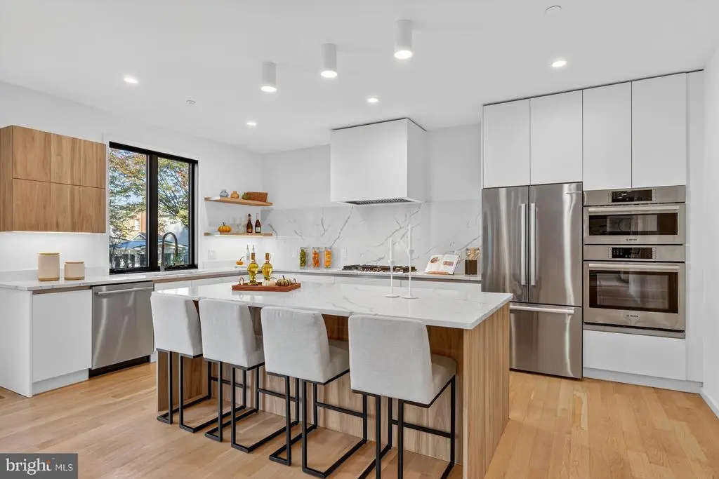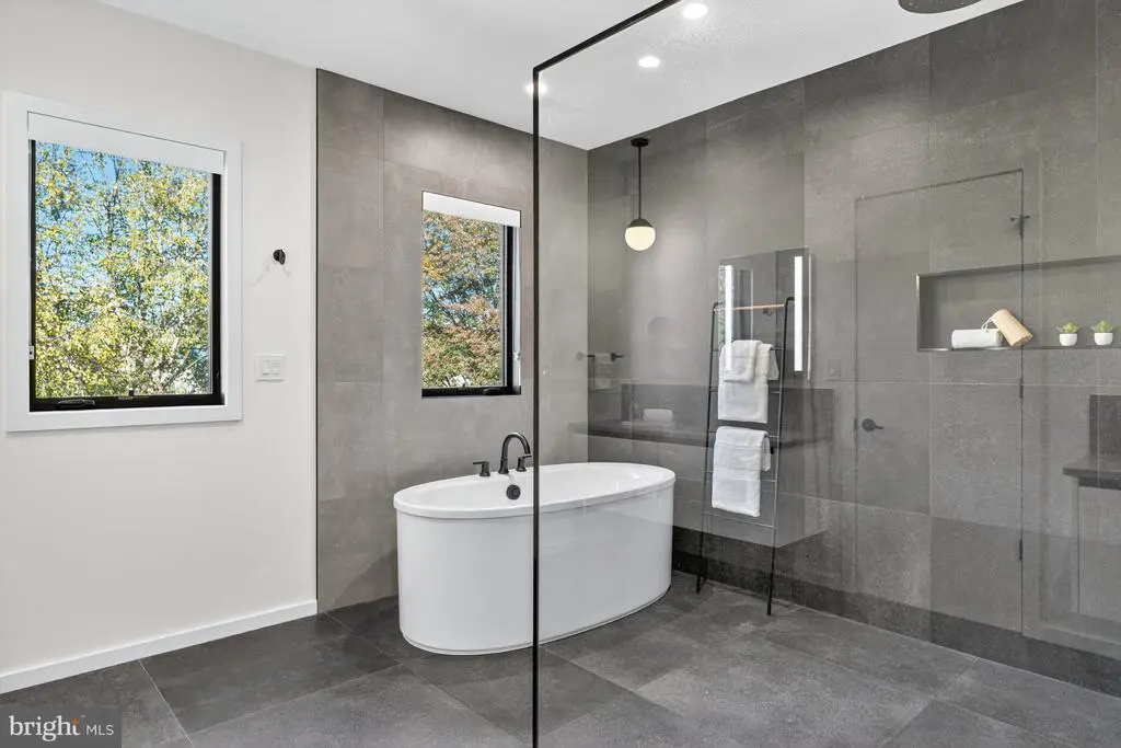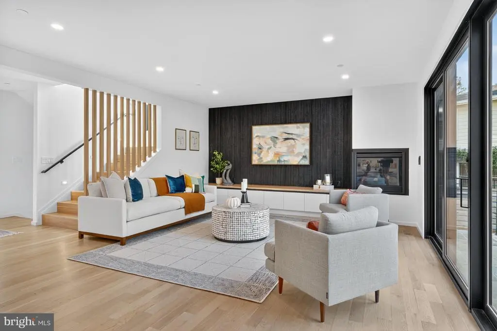 This pristine Scandinavian-inspired home is in a category of its own. Custom-built from the ground up and less than 4 years young, the finishes are superb. Crisp white Hardie lap siding converges with dramatic charred Yakisugi vertical siding at the covered main entrance. Environmentally and financially friendly, this home boasts a fully owned solar panel system. Exceptional features of the dazzling, sundrenched interior include solid white oak hardwood flooring, 9-foot ceilings on all three levels, large-scale Jeld-Wen windows and patio doors, custom shades, and a curated tile selection. Offering 5 bedrooms and 4.5 baths, the floor plan is open and efficient. Main level highlights include: 8-foot doors; a private office; a large living room with a charred cypress accent wall, discreet storage, and a 2-sided corner gas fireplace; an airy dining area with a sleek linear pendant light; a European dream kitchen with custom Marfa handleless cabinetry, an oversized contrasting center island, elegant quartz countertops and backsplash, Bosch stainless appliances, and a walk-in pantry; a mudroom with a built-in bench and cubbies against a shiplap wall; glass door access to the rear grounds. Flanked by a white oak slat wall and illuminated by oversized picture windows, the semi-open staircase ascends to the home’s upper level which offers a spacious primary retreat with an office alcove, 2 walk-in closets, and a gorgeous spa-like bathroom with a free-standing soaking tub, a curbless walk-in glass shower and double floating vanities. Two additional ample bedrooms, each with stylish ensuite bathrooms and walk-in closets, grace the front of the house. A phenomenal central family room and an adjacent laundry room complete the upper level. Providing wonderful overflow options and inviting space for guests, the daylit lower level offers a sizeable recreation room with a wet bar, two bedrooms each with walk-in closets, a full bath with a glass-enclosed shower and built-in bench, and a variety of storage options. Outside, a lovely flagstone terrace with a natural gas connection overlooks the large, lush fully fenced rear yard whereas a 2-car garage and concrete parking pad round out the front. Convenient to downtown Kensington, the Marc train, and two metro stations and in the Kensington-Parkwood/North Bethesda/Walter Johnson school zones, this location is ideal.