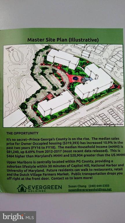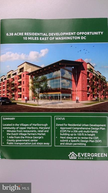 Back on the market! 6.38 acres residential development opportunity! 10 miles east of Washington DC., close to the new state-of-the-art teaching hospital at the Largo Town Center. Zoned for residential urban development. Approved comprehensive design plan for a 206-unit multi-family building up to 100 ft in height. Public transportation is just steps away. Upper Marlboro is centrally located within Prince George's County, providing a suburban lifestyle within 30 minutes of Capitol Hill, the National Harbor, and the University of Maryland. Future residents can walk to restaurants, retailers, and the Dutch Village Farmers Market. CONTACT THE CO-LIST AGENT FOR MORE INFORMATION!