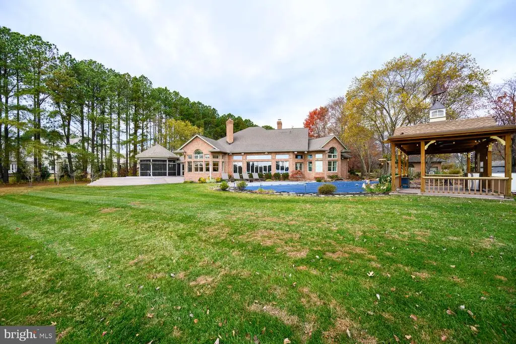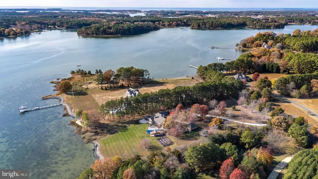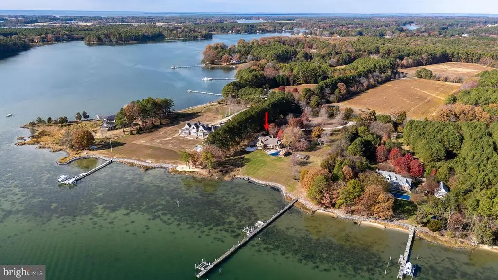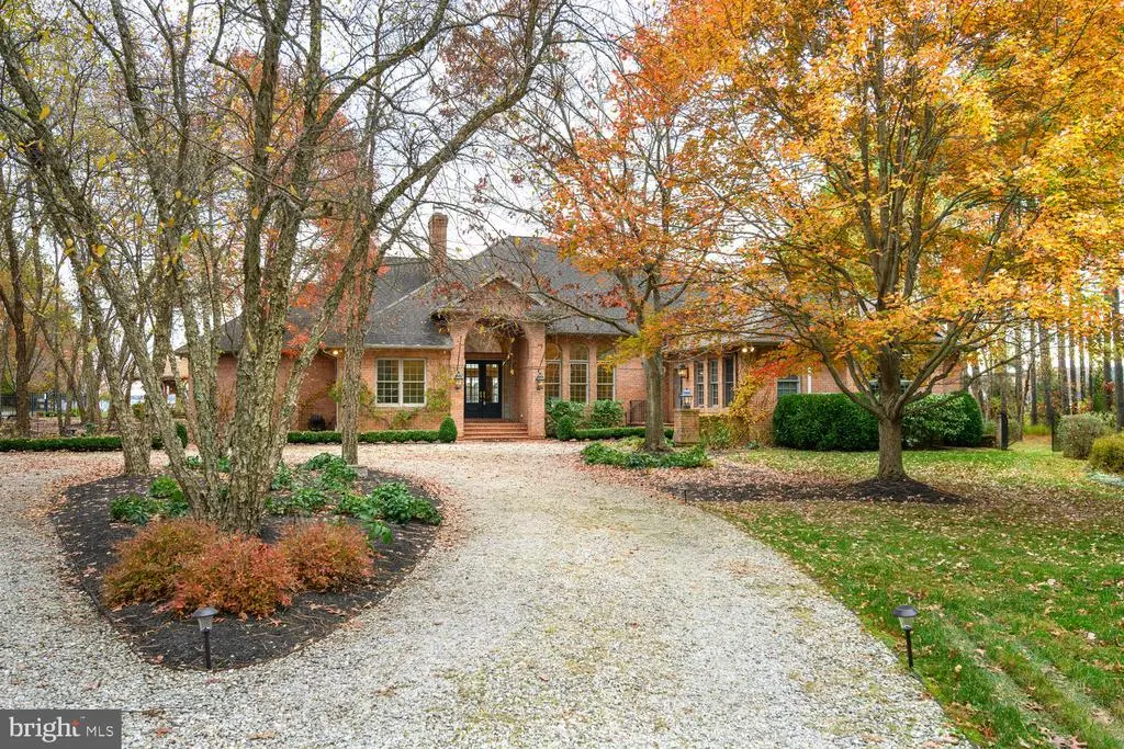This 4,200± sq. ft. custom, single-level all brick residence showcases soaring 14-foot ceilings, an abundance of natural light, and panoramic views of Broad Creek from the moment you step inside. The heart of the home is the gorgeous gourmet kitchen, complete with quartz counters and stainless steel appliances, seamlessly flowing into a spacious family room with a timeless brick fireplace. The luxurious primary suite features 14-foot cathedral ceilings, a spa-inspired bath with custom walk in shower, and serene views of the pool, gardens, and Creek. Two additional en-suite bedrooms, a large den with custom built-ins, and a walk in pantry with granite counters and additional refrigeration provide comfort and convenience throughout. An architecturally stunning screened octagonal pavilion connects to the waterside deck—perfect for relaxing or entertaining. A brick-floored sunroom leads to an expansive patio overlooking the waterside pool, framed by a rock waterfall, custom gazebo and mature landscaped beds. Set on five beautifully landscaped acres with southern exposure, the property boasts 370+/- feet of living shoreline with stone revetment and a 350-foot dock offering 6 feet of deep water. Boating enthusiasts will appreciate the 15,000-lb and 8,000-lb lifts, two open slips, and a floating dock perfect for kayaks and paddleboards. An oversized 2-car garage and large garden shed provide ample storage. Septic is for 3 BR office could beBR #4. Located within 2 miles from historic St. Michaels, this exceptional waterfront estate blends timeless elegance with a resort-style setting.