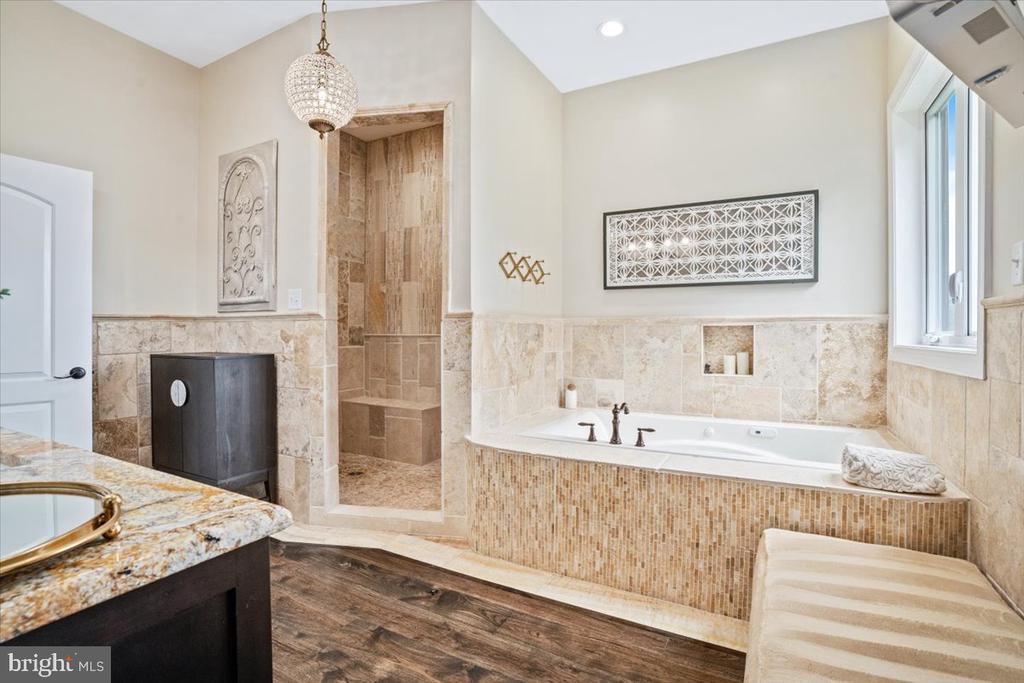 Entry Lvl BR, Exposed Beams, Formal/Separate Dining Room, Master Bath(s), Recessed Lighting, Walk-in Closet(s), Wine Storage, Wood Floors, CeilngFan(s), Crown Molding, Pantry, Skylight(s), Soaking Tub, Stall Shower, Upgraded Countertops