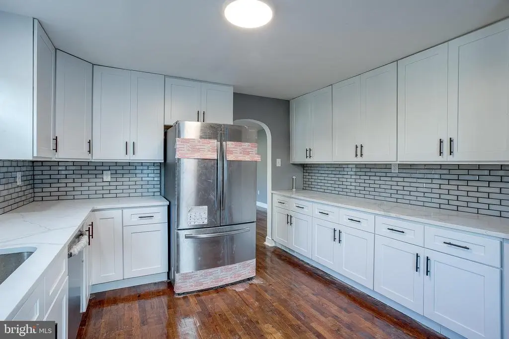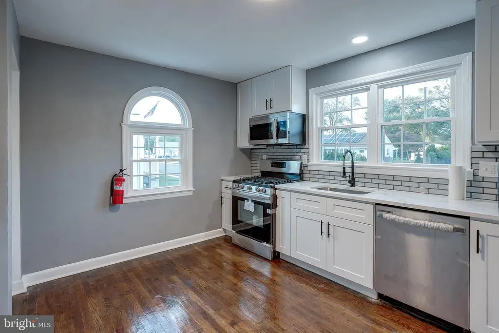Welcome to this beautifully renovated 4 Bedroom, 2 Full Bath Cape Cod, where every detail has been thoughtfully updated to combine modern convenience with timeless charm. From the moment you arrive, you’ll notice the curb appeal with its brand-new pitched roof with architectural shingles and attic fan, new replacement windows with grids, new vinyl siding, and new exterior doors. The half-brick front exterior, quadruple bay front window, and charming covered entryway set the tone for what awaits inside. Step through the front door into a tiled entryway designed to keep the outside elements contained, leading into the expansive living space. Gleaming refinished hardwood floors, neutral gray walls, recessed lighting, and distinctive arched entryways add warmth and character not found in typical homes. Large windows flood the space with natural light, while the wrought iron staircase with oversized landing makes a bold design statement. The heart of the home is the brand-new kitchen featuring an abundance of crisp white shaker cabinets, a stunning glass subway tile backsplash, stainless steel appliances (including a 5-burner gas stove, built-in microwave, dishwasher, and double-door refrigerator), a deep stainless steel sink with a high-arched black faucet, and a bright double window overlooking the yard. A separate dining area completes this entertainer’s dream. This versatile home offers bedrooms & a bathroom on both the main and upper levels, making it ideal for those who prefer single level living or families who desire privacy and personal space. A bonus room with French doors and a full closet provides endless possibilities such as a home office, playroom, or additional living space. Both bathrooms are generously sized and beautifully updated with stylish vanities, modern fixtures, luxury vinyl tile flooring, and eye-catching glass tile shower/tub surrounds. For added convenience, linen closets are located within each bathroom. Upstairs, you’ll find large bedrooms with plush new carpeting, ceiling fans, and bright windows that pop against the neutral palette. Additional updates include a brand-new 200-amp electrical panel with new service head, new HVAC system, and a new hot water heater ensuring peace of mind for years to come. Outside, the spacious backyard offers the perfect setting for gatherings, outdoor activities, or simply a private retreat to relax and recharge. Best of all—no association fees! Why rent when you can own this turn-key home that is truly move-in ready? All that’s left to do is bring your furniture and start making memories.