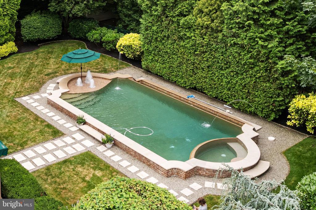 Extensive Hardscape, Exterior Lighting, Sidewalks, Street Lights, Water Falls, Patio, Porch(es), Fenced-Fully, Fenced-Rear, Aluminum, Pool (In-Ground)