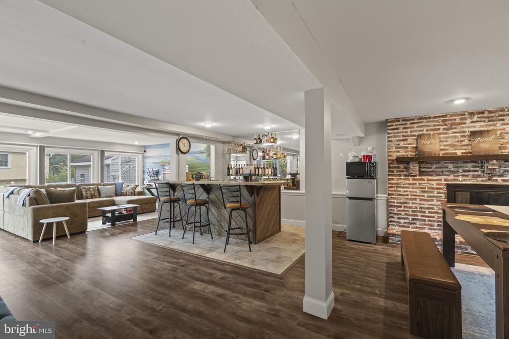 Located in a private community on a corner lot, this updated home delivers space, function, and style. The exterior features low-maintenance vinyl fencing, clean landscaping, and a covered front porch. Inside, the main level offers hardwood floors, a sun-filled living room with bay window and shutters, and a formal dining area. The kitchen is equipped with newer black stainless steel appliances, recessed and pendant lighting, and plenty of eat-in space. Three bedrooms with wide plank flooring and ceiling fans, along with a full bath, complete this level. The lower level is built for versatility—anchored by a gas-ready brick fireplace with wood beam mantel. Additional highlights include brand-new plank flooring, a second full bath with updated vanity, and a custom wet bar. From here, sliding doors open to the composite deck, fenced yard, and shed. Recent upgrades include a new HVAC system and water heater, both installed in 2021, as well as an oversized 1.5-car garage with storage. All within walking distance to Timber Creek Park and Dog Park. This home is move-in ready with significant updates already complete.