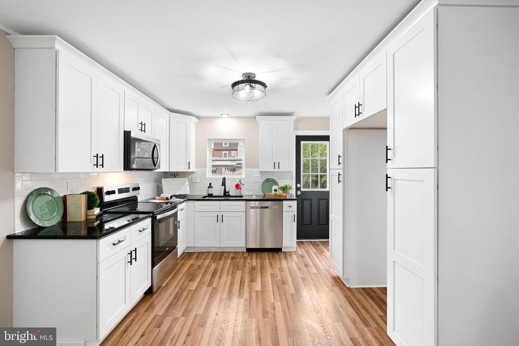 Gorgeous 3-story FULLY RENOVATED townhome in the heart. of Gloucester City. As close to new construction as you can get- this home was rebuilt from the ground floor up. The charming exterior has new vinyl siding, new roof, new trim, new light fixture and door. Entering the home you will notice new flooring t/o, new fixtures, neutral grey paint, and new 6-panel doors t/o with stylish black hardware. The renovated kitchen boasts white shaker cabinets, white subway tile backsplash, black granite countertops, wall of pantry cabinets, and new stainless appliances including range, microwave and dishwasher. Everything is new in this home including drywall, HVAC, and electric. The second floor. has two bedrooms., a laundry closet, and an all-new stylsih bathroom. A dreamy third floor boosts an en-suite primary bedroom with oversied new bathroom. A clean and. dry basement and a fenced bacyard. with side alley access complete. this dream home. Best value in GC! 2 of 3 units under contract … Hurry!