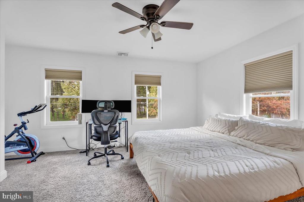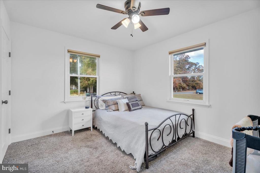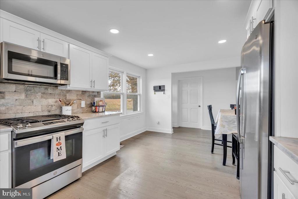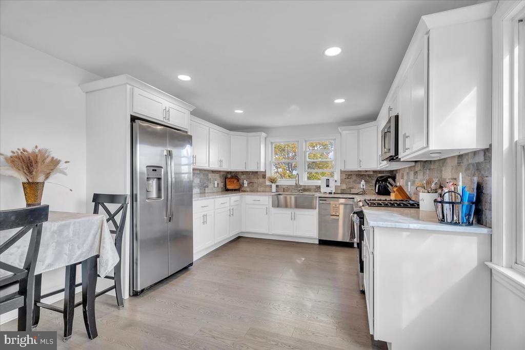 This beautiful 3 bedroom, 2 bathroom farm house in Sicklerville sits in the middle of protected farmland with views for days! The house has great curb appeal and a large, well-manicured front lawn. Inside, the home is freshly painted with neutral colors and wood panel flooring throughout. The centerpiece of the living room is a gray brick wood burning fireplace and mantel with windows overlooking the beautiful farmland. The eat-in kitchen features white shaker style cabinets, crown molding, stainless steel farm sink and appliances with stone backsplash and recessed lighting. The bathrooms are gorgeous and keep with the modern farm look. Updated vanities, lighting, flooring, and tiled shower walls. There are 2 bedrooms on the main level, each carpeted and freshly painted with spacious closets and ceiling fans. The primary suite is on the second level and features a barn door and beautifully updated primary bathroom with porcelain tiled shower. There is also a bonus space in the attic! This home is move in ready! Recently connected to public water, updated septic, newer hot water heater, newer HVAC-furnace and condenser (central air), and updated electric for the entire home. Schedule your private showing today!