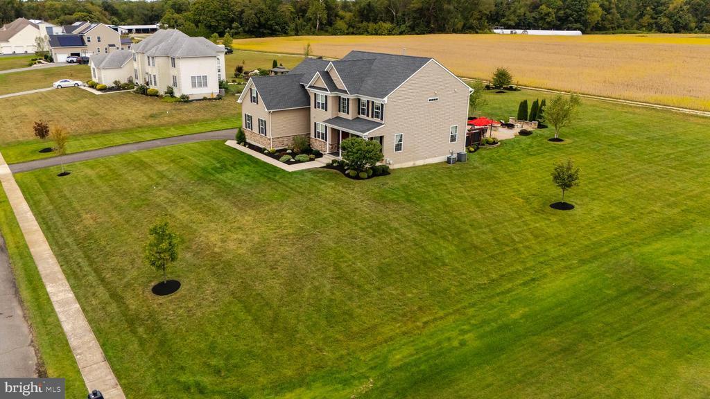 Welcome to 8 Oakview Terrace in the desirable Chestnut Ridge community of Swedesboro. This expanded Colonial home offers over 3,600 sq. ft. of elegant living space, thoughtfully upgraded inside and out, and set on a premium lot that backs to protected farmland for privacy and views. As you approach, the inviting double-door entry and front porch set the tone. Step inside to a dramatic two-story foyer and find a private office with French doors, a formal living room, and a dining room currently used as a second office. The heart of the home is the chef’s kitchen, featuring a two-tier oversized island with built-in microwave, granite countertops, six-burner gas range, double convection ovens, upgraded cabinetry with pullouts, and a walk-in pantry. The eat-in area is extended to accommodate large gatherings and opens seamlessly to the vaulted family room with gas fireplace, ceiling fan, and custom barn-door coat closet. Distressed hardwood floors, upgraded lighting, and smart switches add both warmth and convenience. Upstairs, the luxurious primary suite is a true retreat with a sitting area, coffee bar with granite countertop and mini-fridge, a spa-like bath with two-person shower, soaking tub, and double vanity, separated toilet room, plus a walk-in closet with semi-custom shelving. A second bedroom features a private ensuite bath, while bedrooms three and four share a Jack & Jill bath with dual sinks. Additional highlights include a three-car garage, long driveway, mudroom with laundry hookups, unfinished attic with a second HVAC system, and a basement workshop. Outdoor living shines with a custom EP Henry patio, built-in gas grill, dual fire features (firepit & firewall), professional landscaping with privacy screens, outdoor lighting, and invisible dog fencing. The Chestnut Ridge community offers a quiet, fully built-out neighborhood within the Kingsway School District, just minutes from major routes. With low HOA fees and proximity to shopping, dining, and commuter routes, this home blends luxury with convenience.
