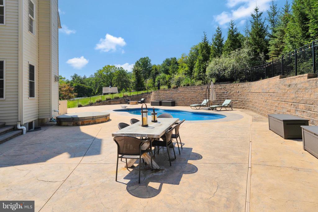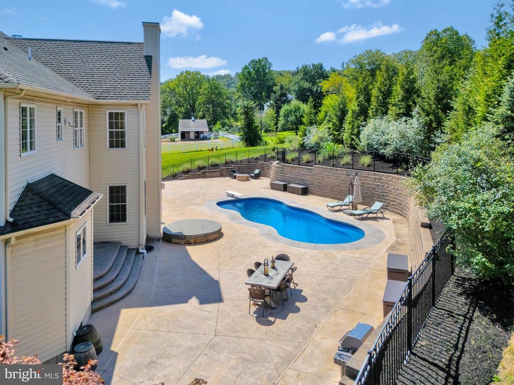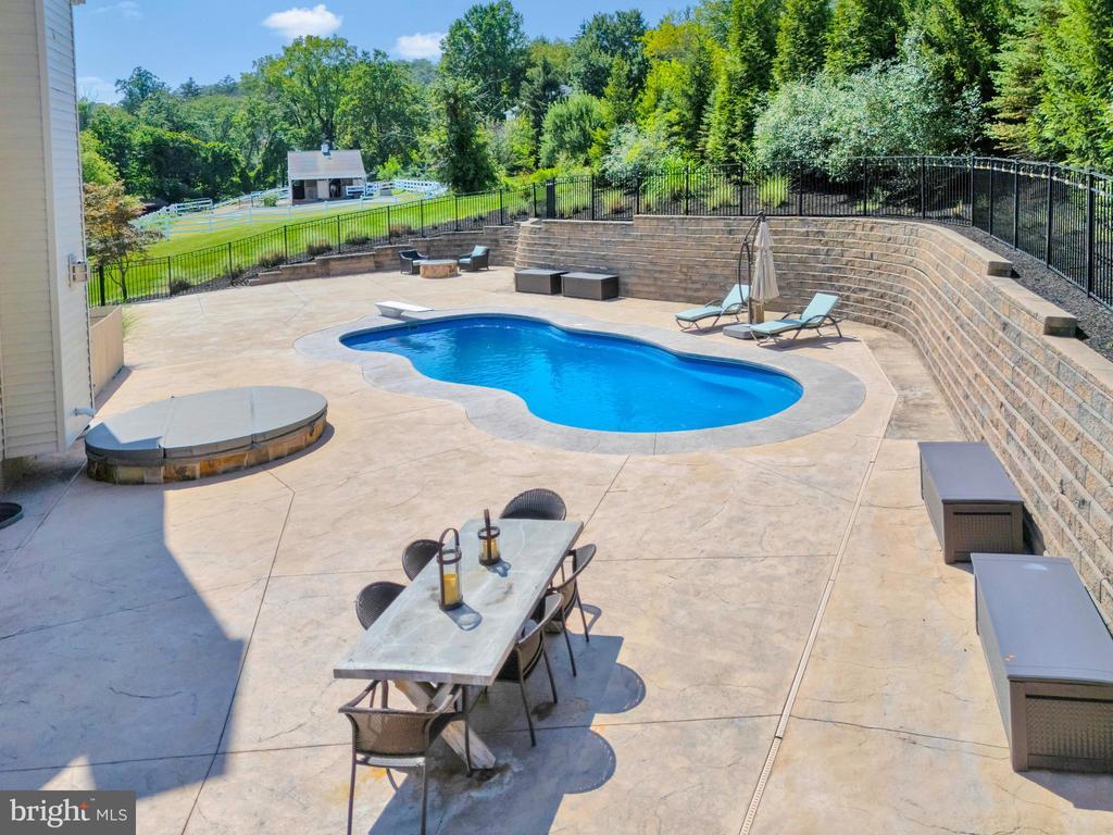 Extensive Hardscape, Exterior Lighting, Hot Tub, Stone Retaining Walls, Other, Fenced-Rear, Fenced-Partially, Aluminum, Pool (In-Ground)
