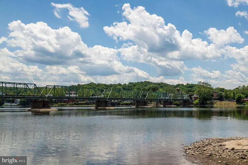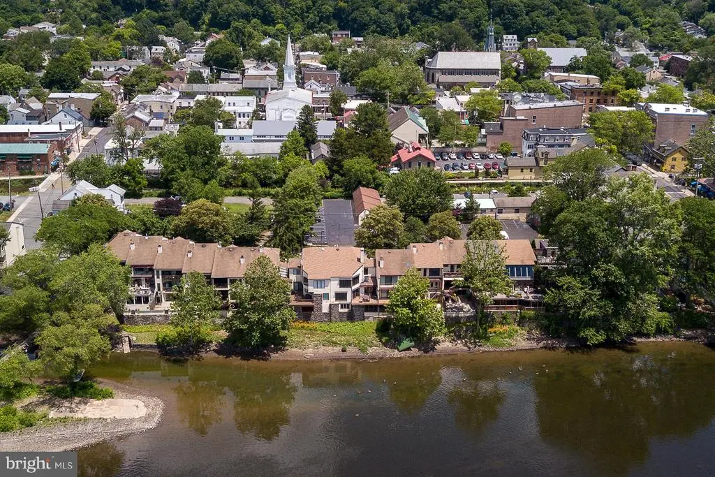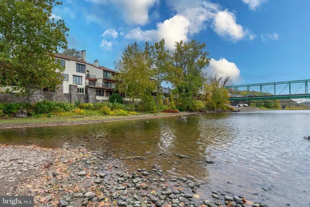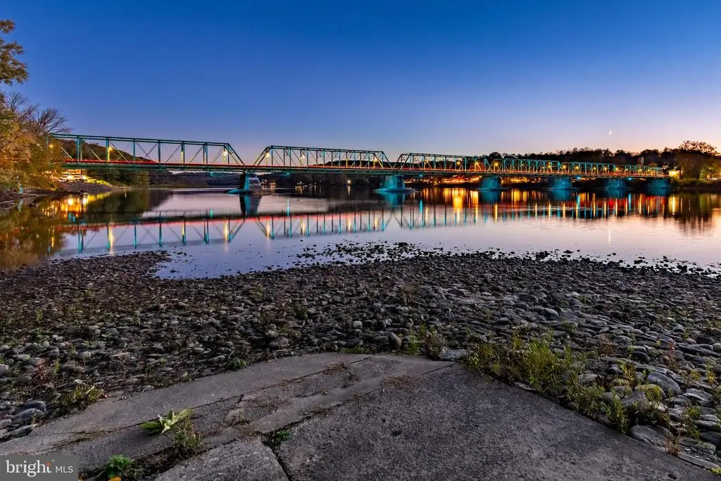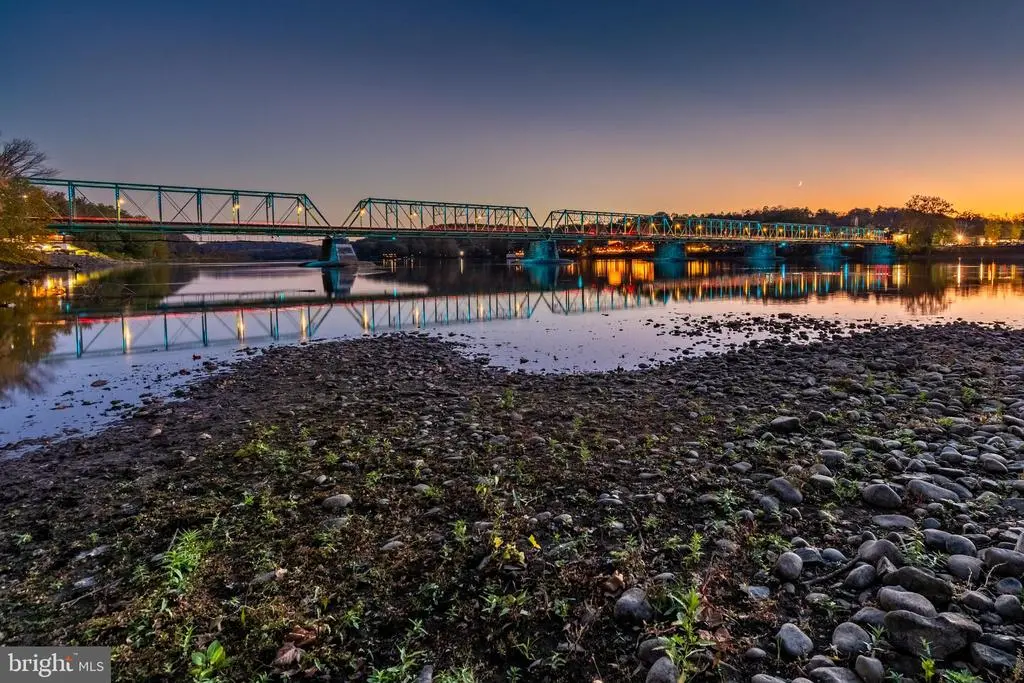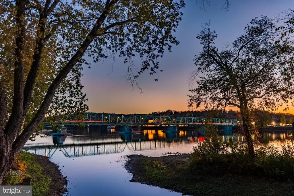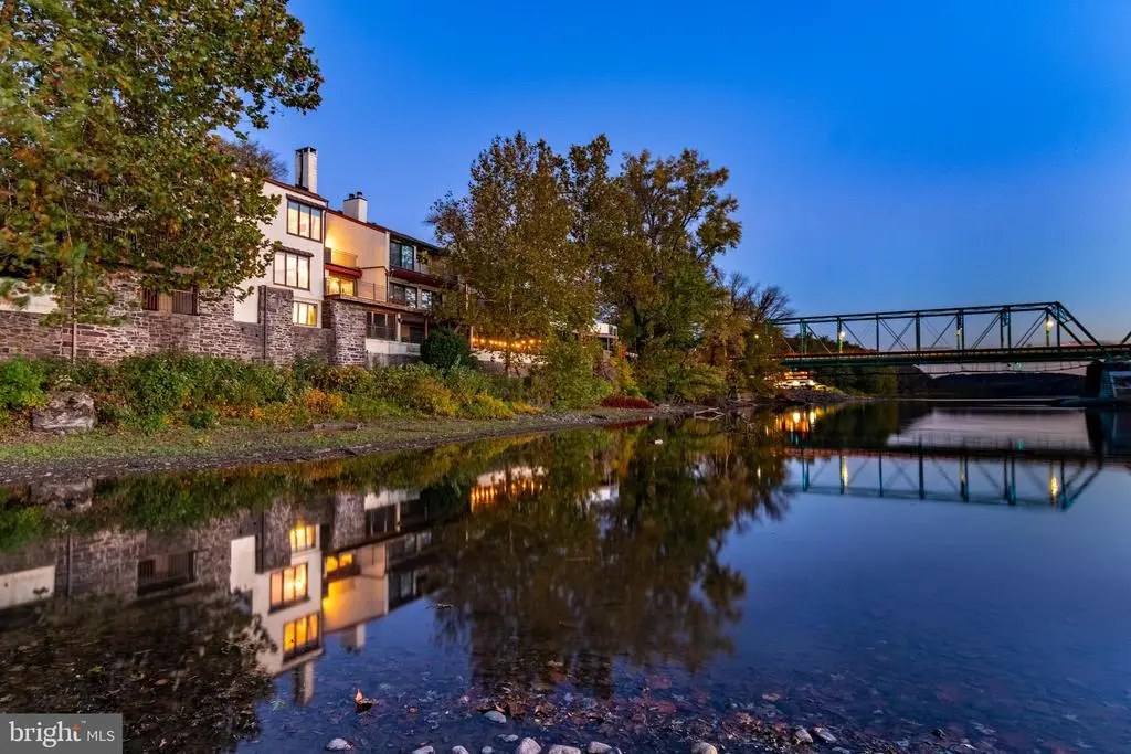 Breathtaking views and gorgeous sunsets from every level of this townhome overlooking the Delaware River and the New Hope-Lambertville Bridge define this spectacular Lambertville Townhome, which was once the site of the famed River’s Edge Restaurant and still retains its iconic warmth and original thick stone walls. Truly awe-inspiring with waterfront terraces off the living room as well as the primary suite, this home is undoubtedly one of Lambertville’s most coveted finds. Unlike any of the other Lambert’s Lane townhouses, this home comes with an elevator, two patios in addition to the terraces, an off street parking spot and a coveted garage space. There’s a guest bedroom and a full bathroom beside the elevator up front on the main level. The formal dining room, where the restaurant’s history is most evident, features original stonework, a gas fireplace, a vaulted ceiling and four skylights across the hall. Oak floors span across the large living room with exposed stone walls, wainscotting and its phenomenal views of the water and bridge with a see-through gas fireplace shared with the dine-in kitchen. Here, you will find stainless steel appliances, ample cabinet storage, granite countertops, and sliding doors to the deck overlooking the river with an electric awning for sun coverage. A full-size laundry room with storage and a sink rounds out this level. On the second floor, the primary suite will be tough to leave thanks to its glorious sunset vistas, a cozy gas fireplace, its en-suite spacious bathroom, and incredible closet storage, including a true dressing room with a built-in makeup vanity and sink. A third full bathroom serves the third bedroom, which is also impressively large. The basement is partially finished with river views, and an outside entrance to the lower patio and offers loads of storage. Probably Lambertville’s most premier address and location, this home is a sidewalk stroll to galleries, eateries, shops, and services, making the entirety of Lambertville and New Hope easily accessible without ever needing to take the car out.