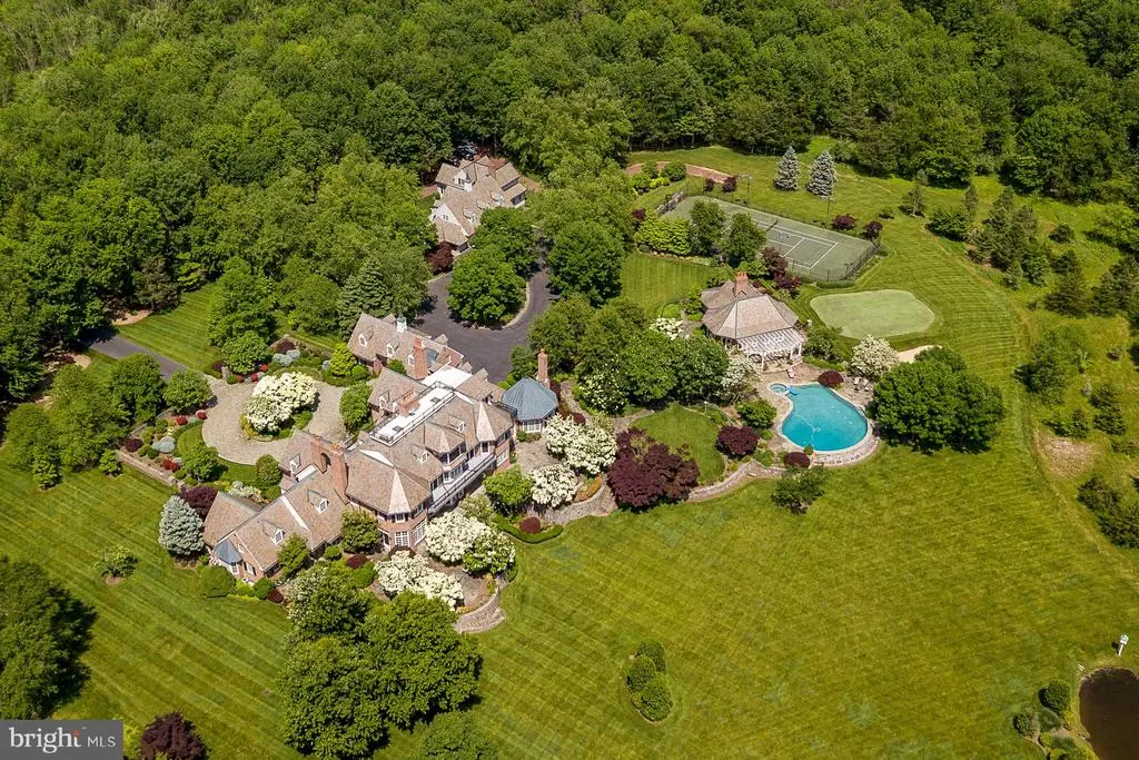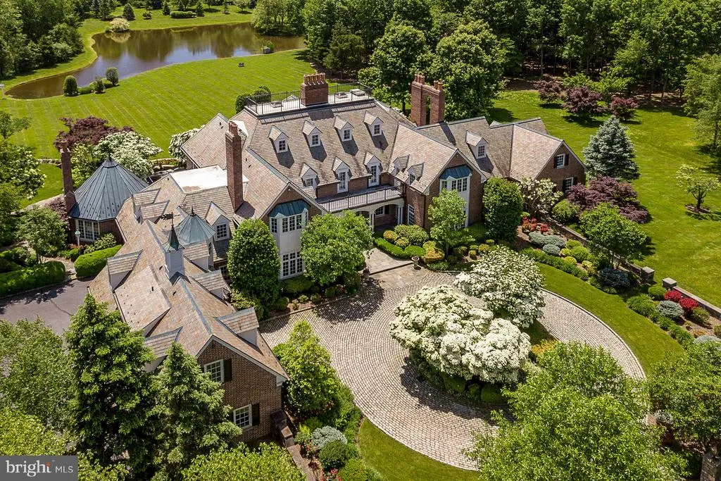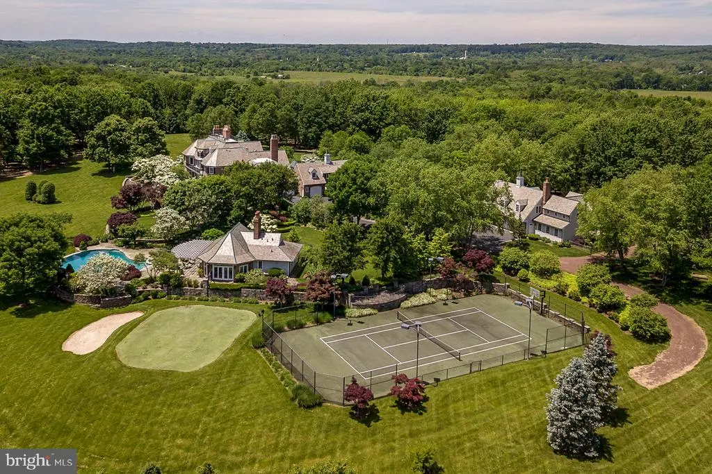 Past the gates, winding up the driveway, you get a sense of the seemingly endless land encircling this brick manor home and finally you realize why this is called the Garden State. The nearly 26 acres are home to heirloom trees and sculpted gardens contained by a stone wall, as well as a pond offering Heaven-on-Earth views from southerly windows. It's hard to fathom that the scene is a mere 55 miles from NYC and even less from Philadelphia. Or catch the train, just 10 miles away. The sprawling home and outbuildings, all capped with slate, have custom spaces devoted to every leisurely pursuit from wellness to wine collecting. Rooms are invitingly scaled, eleven of them with masonry fireplaces. A mahogany library with upper gallery is among the more intimate spaces, while the lower level s cherry bar and theater are meant to be enjoyed with guests, as is the airy pool house complete with a fireplace, kitchen, full bath and views of an infinity-edge pool. Three of the large bedrooms open to balconies and all have en suite bathrooms. An apartment and 3-bedroom carriage house offer additional lodging. There are tennis and basketball courts and 7 garages. Imagine being able to offer this ultimate weekend escape to loved ones near and far. If farmland assessment is not continued, the buyer will be responsible for roll back taxes.