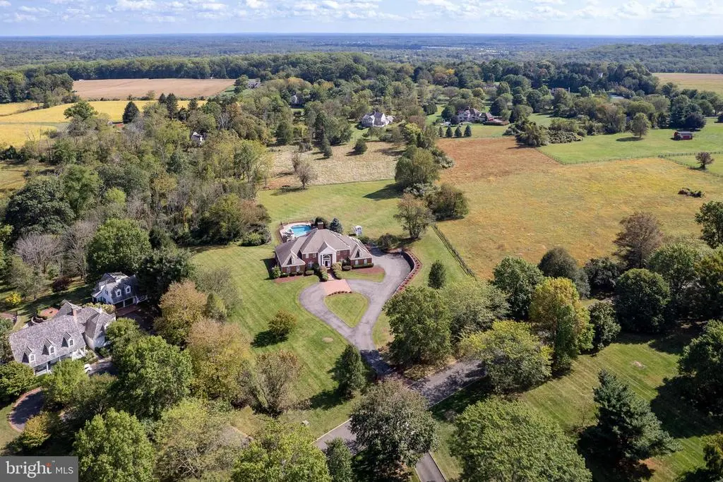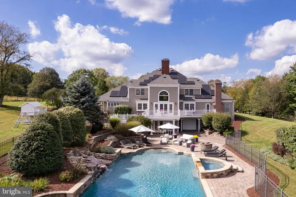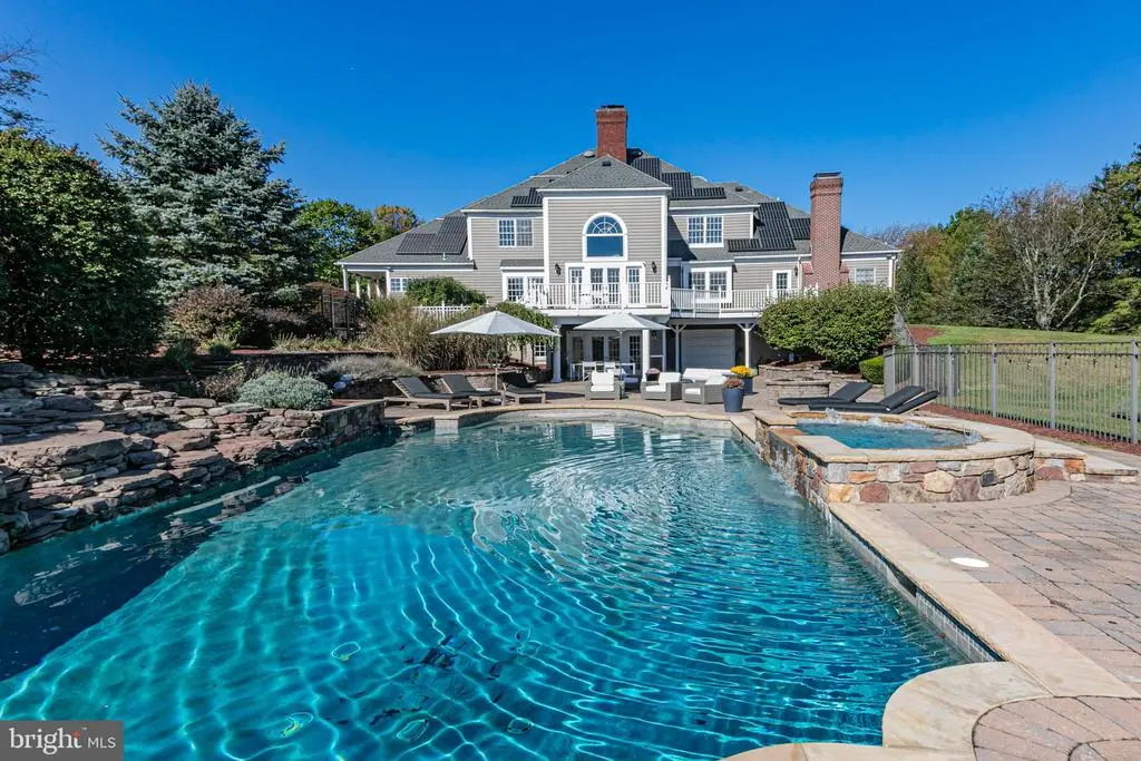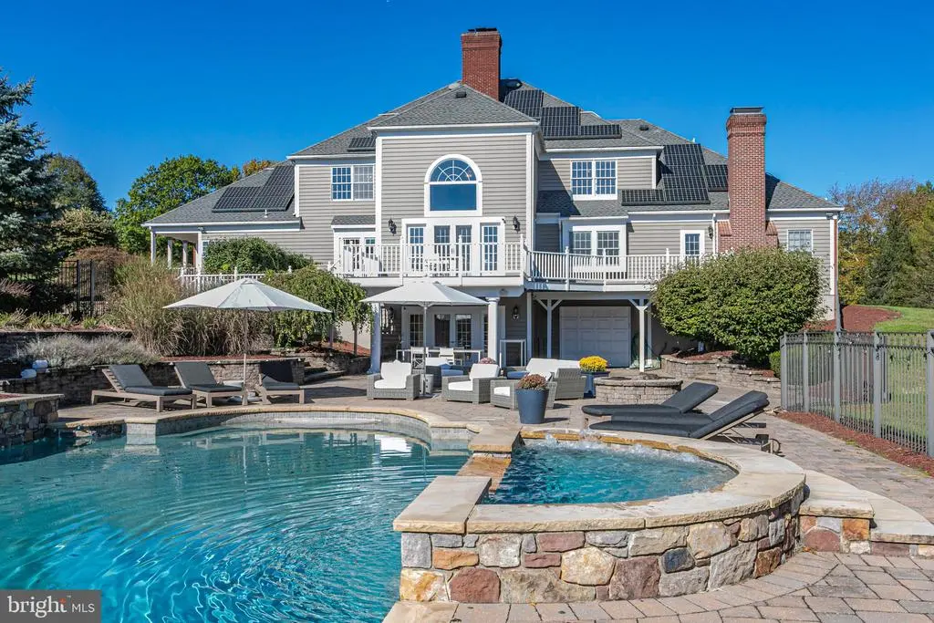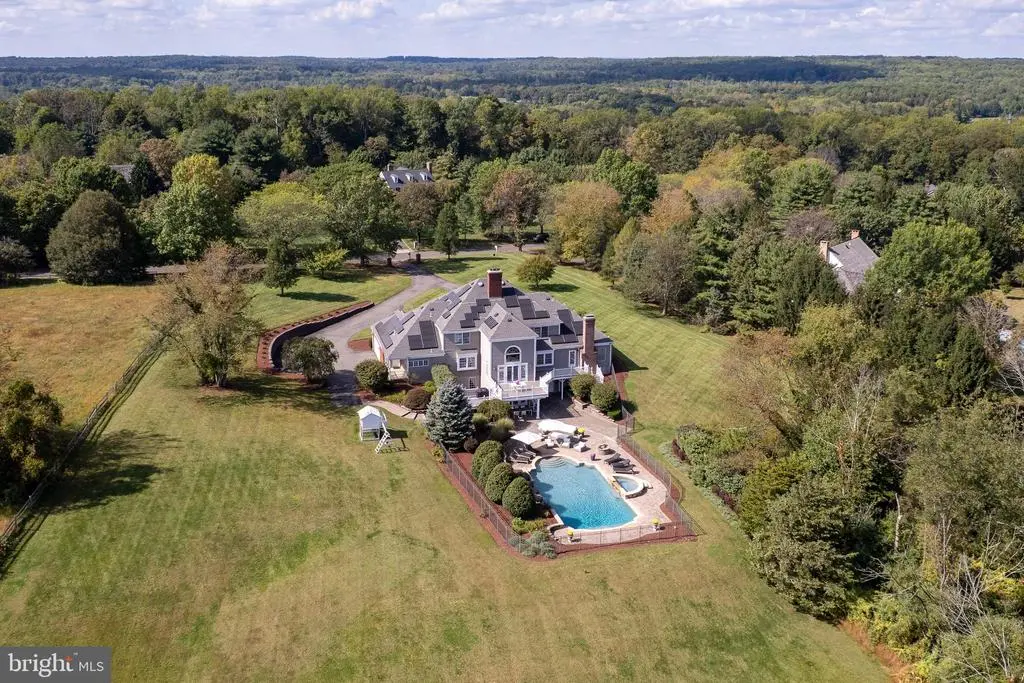 This grand custom-built home is situated on a little-known yet impressive cul-de-sac of upscale houses in Hopewell Township, featuring a resort-style pool and views that extend out over 7+ acres. A dramatic home, beginning with its vast circular driveway with lighted stone stanchions and a columned facade, it feels more like a Georgian estate than a home conveniently located near so much, including transit hubs, Pennington, Lambertville, Hopewell Borough, and Princeton. Natural light fills freshly painted rooms, whatever the season. Formal rooms fan out from a marble foyer, with the living room opening into a flexible space that could be used as a home office or games room. With plenty of counter prep space and room for a large dining table, the kitchen is big and bright, adjacent to a fireside family room that opens onto the deck with its sweeping vistas. The primary suite is on the main level, with an en suite bathroom, another fireplace, deck access, and generous closets. On the second floor, reached via front and back stairs, there are three additional bedrooms, one with a private bathroom, a hall bathroom, and a loft with a walk-in closet for extra storage. The finished basement opens directly to the pool with a handy half bath and a fireplace of its own. Three garages with two for cars and one for storing outdoor furniture, lawn tools, and pool equipment. Solar system powers electricity for the house, exterior, and pool, drastically reducing energy costs to the homeowner. This is a home designed for enjoyment!