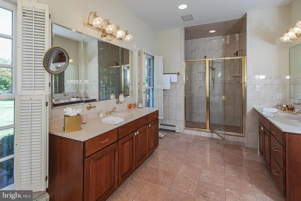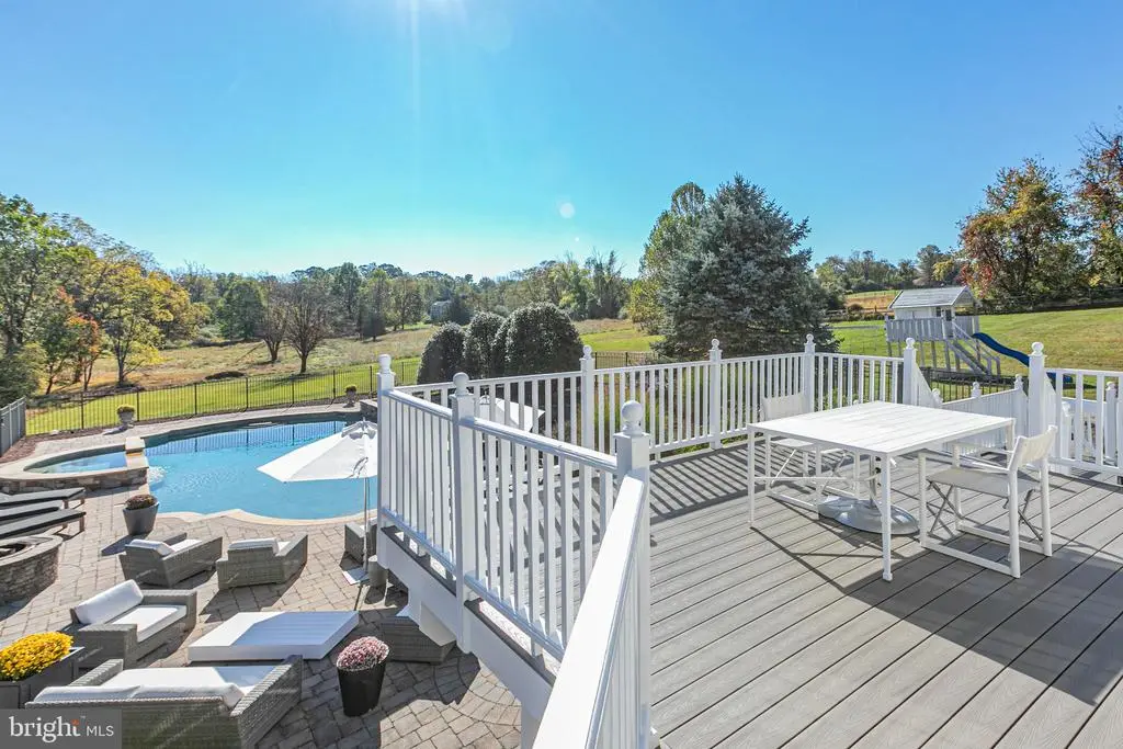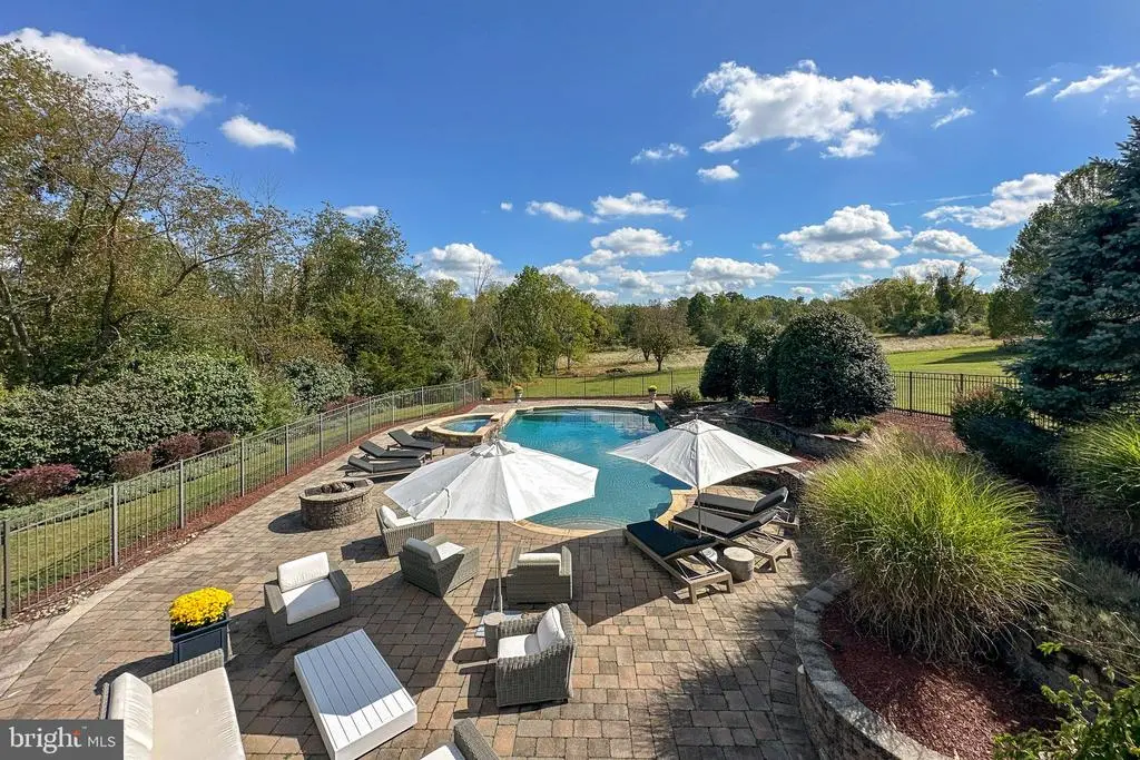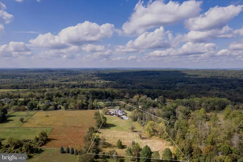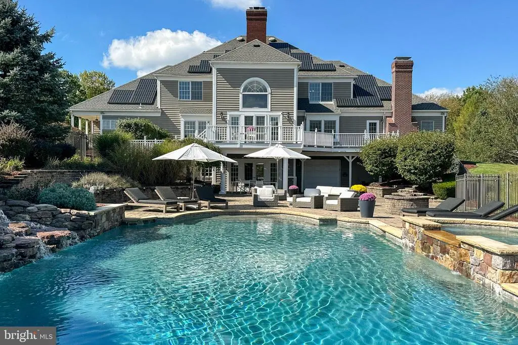 This grand custom-built home is situated on a little-known yet impressive cul-de-sac of upscale houses in Hopewell Township, featuring a resort-style pool and views that extend out over 7+ acres. A dramatic home, beginning with its vast circular driveway with lighted stone stanchions and a columned facade, it feels more like a Georgian estate than a home conveniently located near so much, including transit hubs, Pennington, Lambertville, Hopewell Borough, and Princeton. Natural light fills freshly painted rooms, whatever the season. Formal rooms fan out from a marble foyer, with the living room opening into a flexible space that could be used as a home office or games room. With plenty of counter prep space and room for a large dining table, the kitchen is big and bright, adjacent to a fireside family room that opens onto the deck with its sweeping vistas. The primary suite is on the main level, with an en suite bathroom, another fireplace, deck access, and generous closets. On the second floor, reached via front and back stairs, there are three additional bedrooms, one with a private bathroom, a hall bathroom, and a loft with a walk-in closet for extra storage. The finished basement opens directly to the pool with a handy half bath and a fireplace of its own. Three garages with two for cars and one for storing outdoor furniture, lawn tools, and pool equipment. Solar system powers electricity for the house, exterior, and pool, drastically reducing energy costs to the homeowner. This is a home designed for enjoyment!