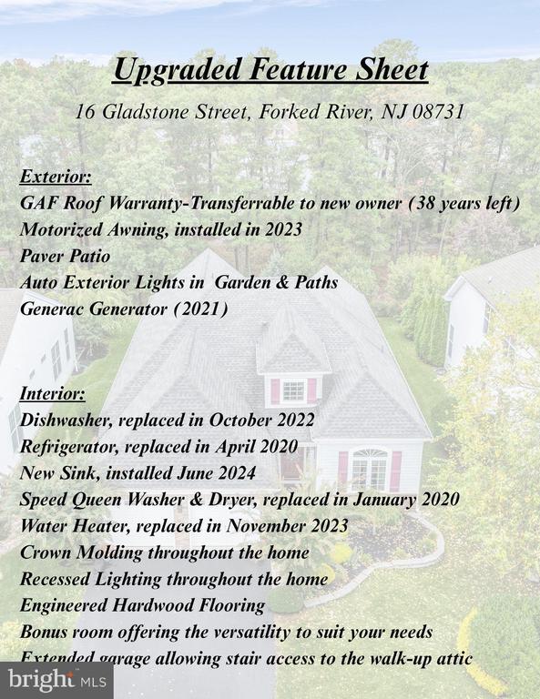 Welcome to Seabreeze at Lacey, where resort style living & this elegant custom Fairhaven model, boasting 1,950 sqft. of living space & private backyard sitting on a PREMIUM lot leaves you nothing to do but unpack! The stunning two-story foyer welcomes you into the home w/ direct access to the formal dining room. The heart of the home offers an inviting open concept living area boasting 12' ceilings & features a custom eat-in kitchen equipped w/ newer SS appliances, newer custom sink (2024), granite countertops & pantry. Flowing into the expansive living room which includes an inviting gas fireplace w/ access out to the private wooded backyard w/ custom paver patio, auto exterior lighting in garden & paths & motorized awning (2023), offering you a serene setting to relax & entertain Engineered hardwood, recessed lighting & crown molding is showcased throughout the home! The primary suite features a spacious walk in closet & bath equipped w/ double sinks, shower stall & private water closet! The second bedroom, bonus room & hall bath, which is located in its own wing lead you into the laundry room w/ newer washer & dryer & the attached 2-car garage which includes a spacious walk-up attic, perfect for storage! This home is equipped w/ central AC, forced air-gas heat, newer water heater (2023), Generac generator (2021) & in-ground Sprinkler System. Enjoy all of the amenities that Sea Breeze at Lacey has to offer including community clubhouse, pool, putting green, tennis court, trails & more! Close proximity to Lacey Rd, GSP, Route 9 & shopping centers! Take this opportunity to become the next home owner in the desired Sea Breeze at Lacey community...call to see this today!
