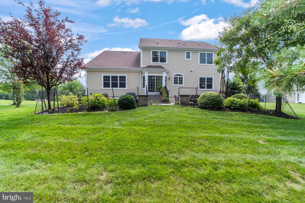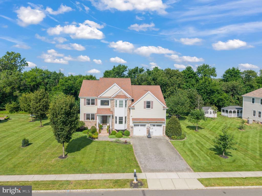 From its elegant curb appeal to its thoughtfully designed layout, this five-bedroom, five-and-a-half-bath residence blends everyday comfort with polished sophistication. A paver stone driveway and walkway guide you to the front door of this 3200+ square foot home, surrounded by beautifully landscaped and hardscaped grounds. Inside, hardwood floors and detailed moldings set the tone for a home that feels both timeless and fresh. Sunlight pours through the windows, amplified by a soft neutral palette that flows throughout. The main level offers the flexibility and function today’s lifestyle demands, including a first-floor guest suite with en suite bath and double door entry—perfect for multigenerational living or weekend guests. Entertaining is effortless with a graceful open concept living and dining area, while daily living centers around the inviting kitchen and two-story family room. The kitchen shines with granite counters, stainless steel appliances including double wall ovens, a center island with seating, and a sunny breakfast area that opens to an expansive paver patio. Out back, enjoy al fresco dining, lounging, or entertaining in a private yard lined with mature trees. The family room impresses with soaring ceiling, a gas fireplace framed by archtop windows, and a second staircase leading to the upper level. Upstairs, the primary suite is a true retreat, complete with a tray ceiling, sitting area, and an oversized walk-in closet. The luxurious en suite bath features a soaking tub set within a bay window, separate shower, water closet, and dual sink vanity. Three additional bedrooms include a Jack-and-Jill suite and a fourth bedroom with easy access to a hall bath. Need even more space? The finished basement delivers—with room for a rec area, home gym, playroom or office with a full bath for added convenience. Located in the top-rated Montgomery Township School District and just moments from schools, parks and community tennis and pickleball courts, this home combines location, lifestyle, and livability in one exceptional package.
