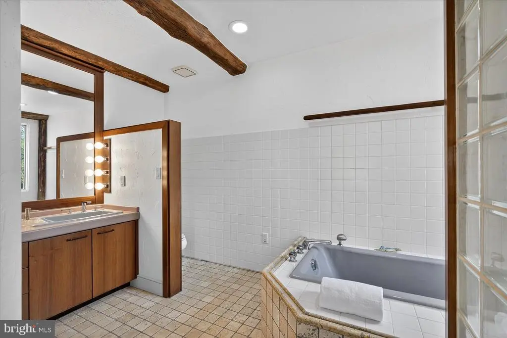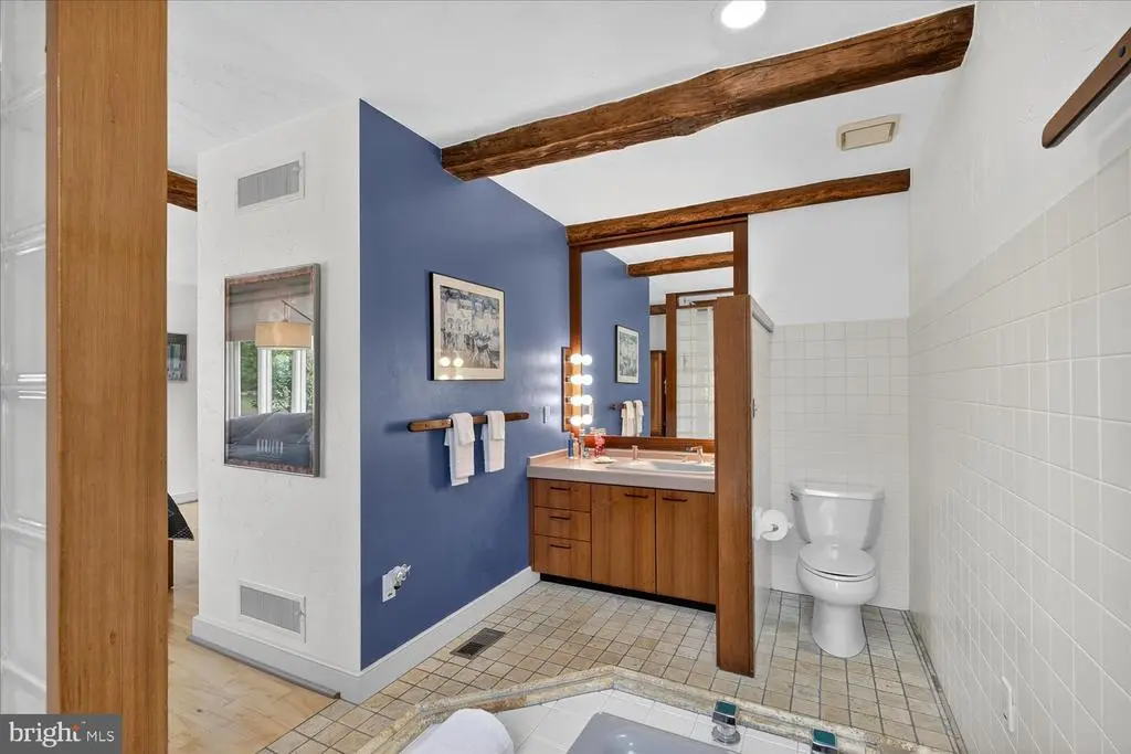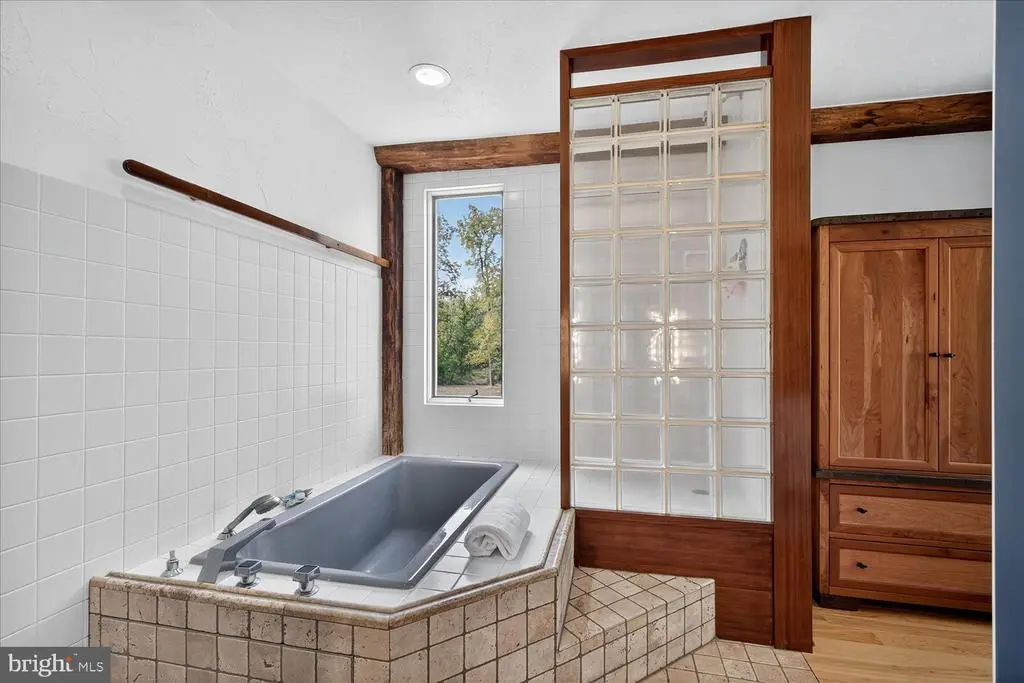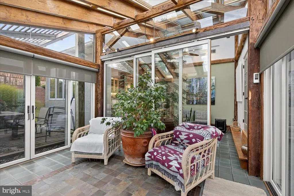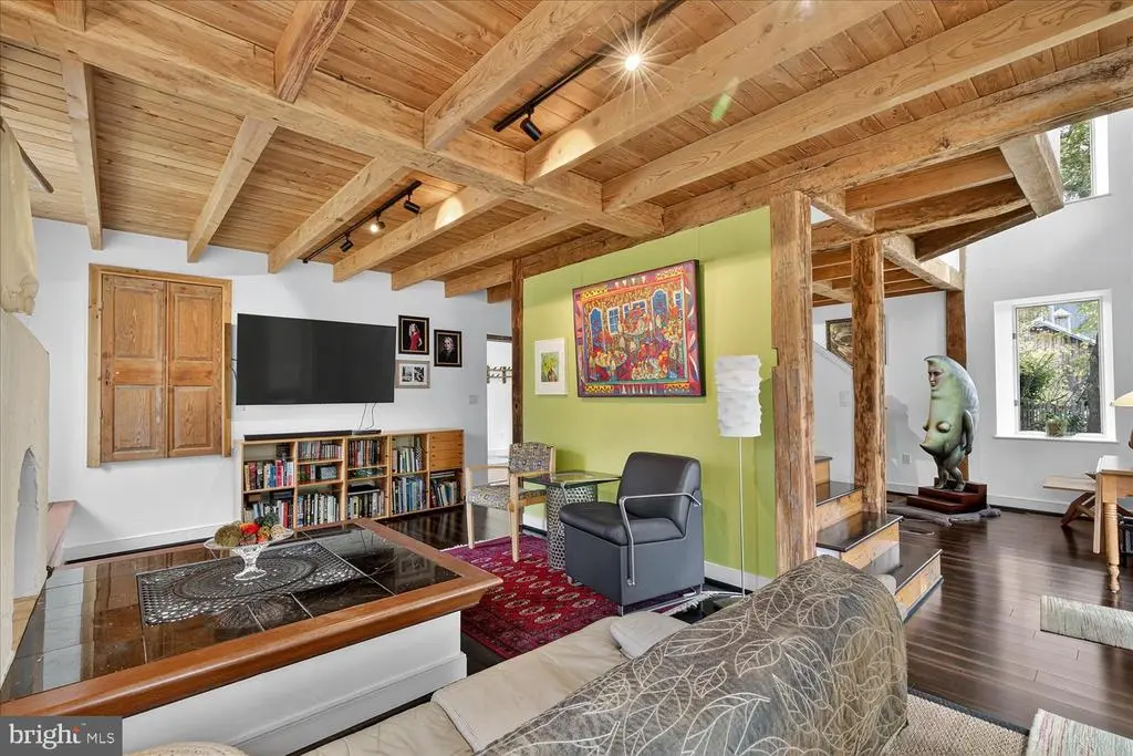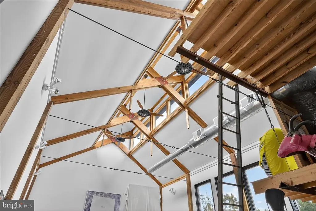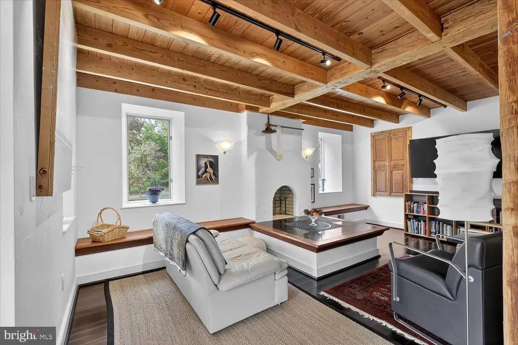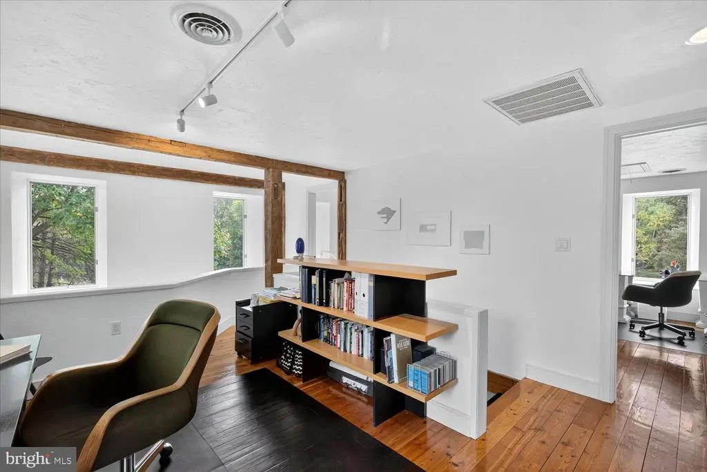 Built-Ins, Ceiling Fan(s), Exposed Beams, Bathroom - Stall Shower, Wood Floors, Skylight(s)
