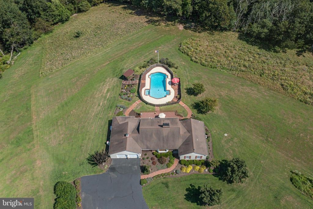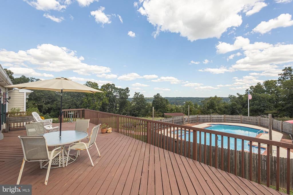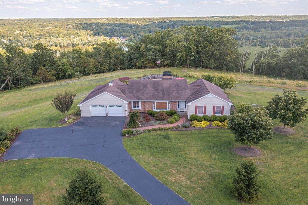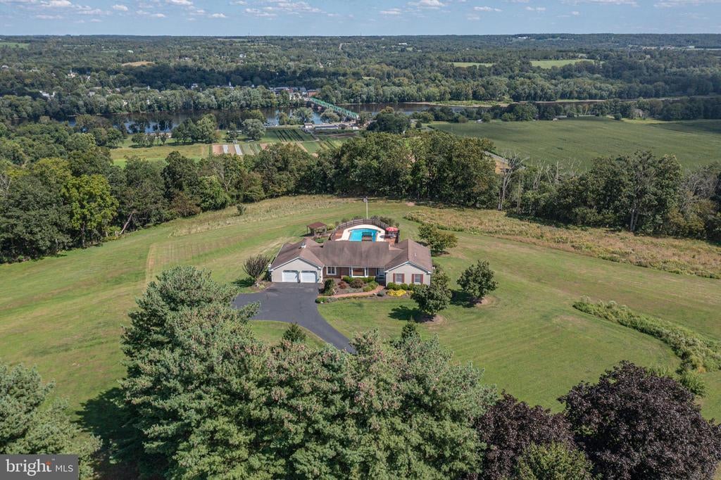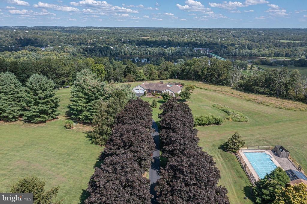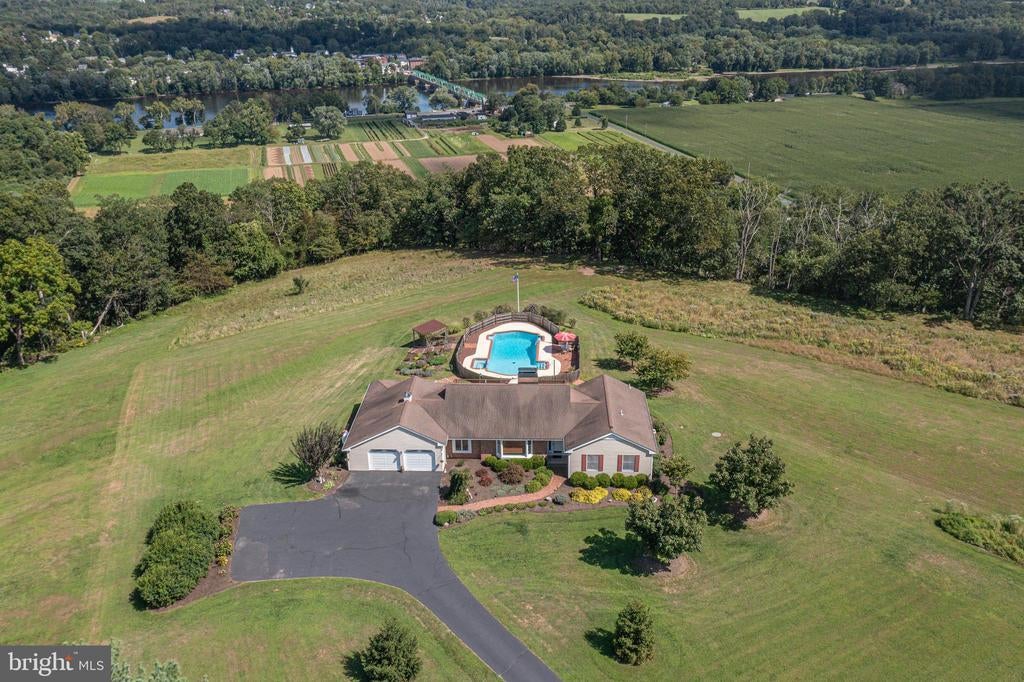 Tucked back from the road down an idyllic driveway lined on either side with mature red maple trees, this special property offers a setting like no other. Set on over four lush acres in the hills of Tinicum Township, you will be amazed by the stunning long-distance views of the rolling countryside of Upper Bucks County. This handsome ranch home boasts fantastic updates, a neutral color palette throughout, and a gorgeous in-ground pool. A bright foyer with stone tile floor and large coat closet opens to the inviting living room where a large bay window overlooks the front yard. The formal dining room with wainscoting opens to the updated eat-in kitchen featuring stainless steel appliances, granite counters, tile backsplash, and abundant storage including pantry. A breakfast area is set before glass doors that take in the gorgeous sight of the hills beyond, while a lovely powder room and main level laundry are tucked around the corner for added convenience. A cozy den features a fireplace flanked by built-in shelves and glass doors that frame those impressive views. Down the hall are the private quarters where the primary bedroom suite boasts a deep walk-in closet with custom organizers, and a recently updated ensuite bathroom with a glass and tile walk-in shower. Two more sweet bedrooms share a fully updated hall bathroom. Sliding glass doors in both the den and kitchen open onto the expansive back deck overlooking the verdant backyard with a recently renovated and fully fenced-in in-ground pool sur-round by enchanting butterfly gardens. Sip your morning coffee, watch the sun-rise over the hillside, and enjoy the peace and utter privacy that surrounds you. A pristine oversized attached two-car garage adds versatility, and the full walk-out basement is massive and offers abundant clean dry storage, plenty of space for a workshop, a pellet stove, and direct access to the pool. Plus central air and a whole house generator. Spend your weekends relaxing poolside or exploring Bucks County from this fantastic move-in-ready home surrounded by natural beauty.