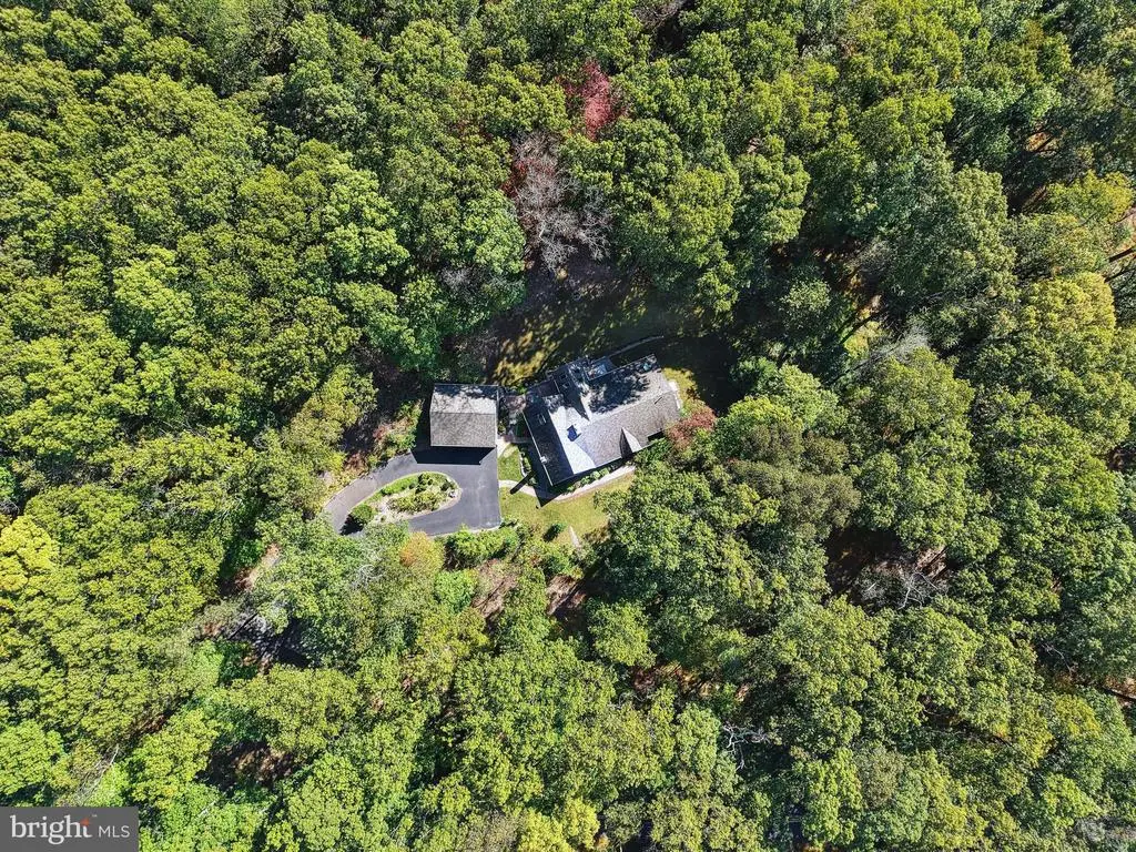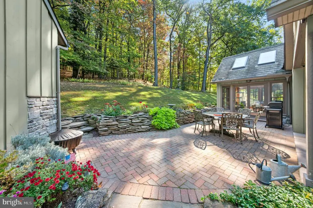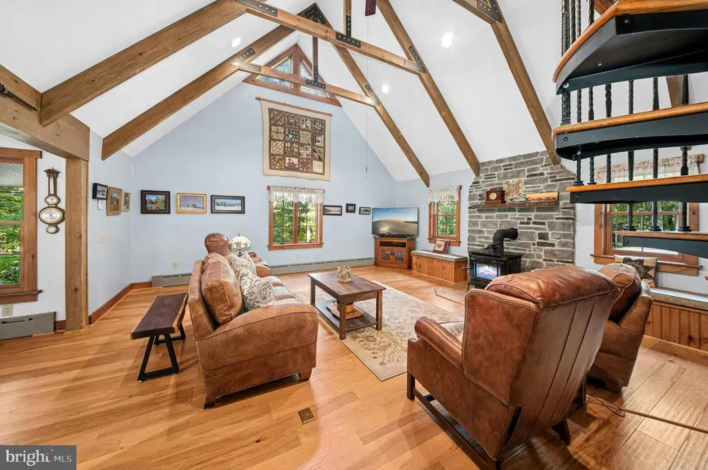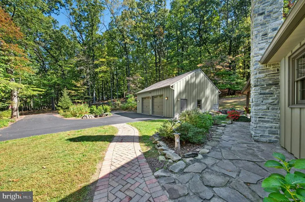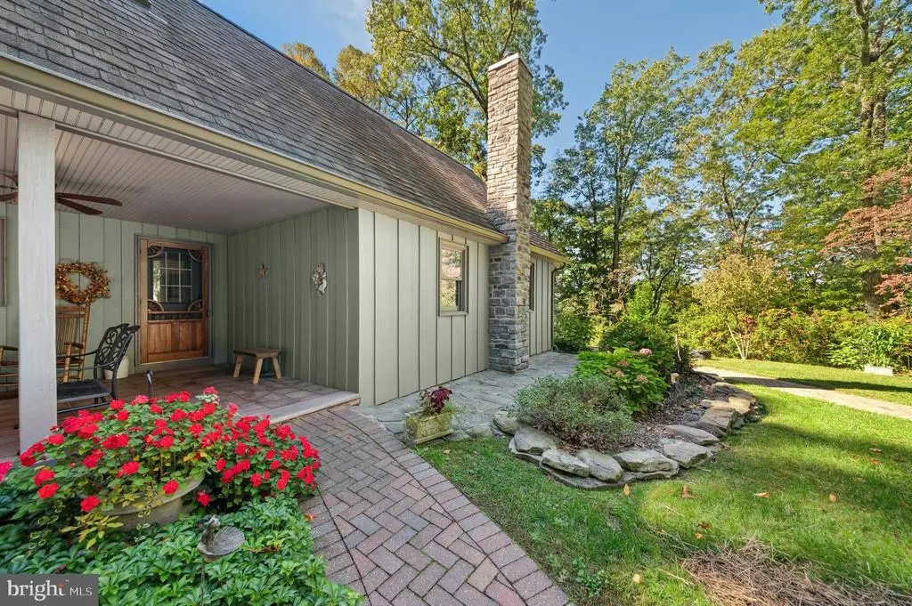 GALLERY HOUSE Framed by stately trees and colorful plantings, this charming cedar ranch is nestled on 4.85 wooded acres in Upper Bucks County. Mid-century built and extensively renovated in 2014, the convenient one level floor plan is enhanced with hardwood floors, exposed wood beams, and a loft area fit for an artist. A deep covered porch off the circular driveway leads to an open floor plan with abundant windows. The two-story great room boasts a cathedral ceiling and wood burning stove and flows easily to the dining room. A spacious sunroom with heated floor looks out over the private backyard and welcoming entertaining spaces. The expansive eat-in kitchen includes stainless appliances, leathered granite countertops, and gas cooking. Nearby, the family room is ideal for quiet nights, with a wood burning fireplace set in a sparkling mica stone wall. Expansive and light-filled, the primary suite includes dual walk-in closet and a luxurious en suite bath with river rock shower and separate soaking tub. Two additional bedrooms share an updated bath. Outside, porches and patios are positioned to take in the beauty of the surroundings on all sides. A large detached garage features a 12.5’ ceiling for automotive enthusiasts, while a second garage provides additional space for vehicles and storage. The sought after location provides privacy yet is just minutes away from the Delaware River, with easy access to commuter routes, shopping, dining and entertainment.