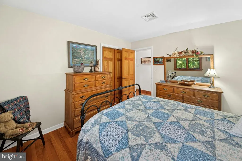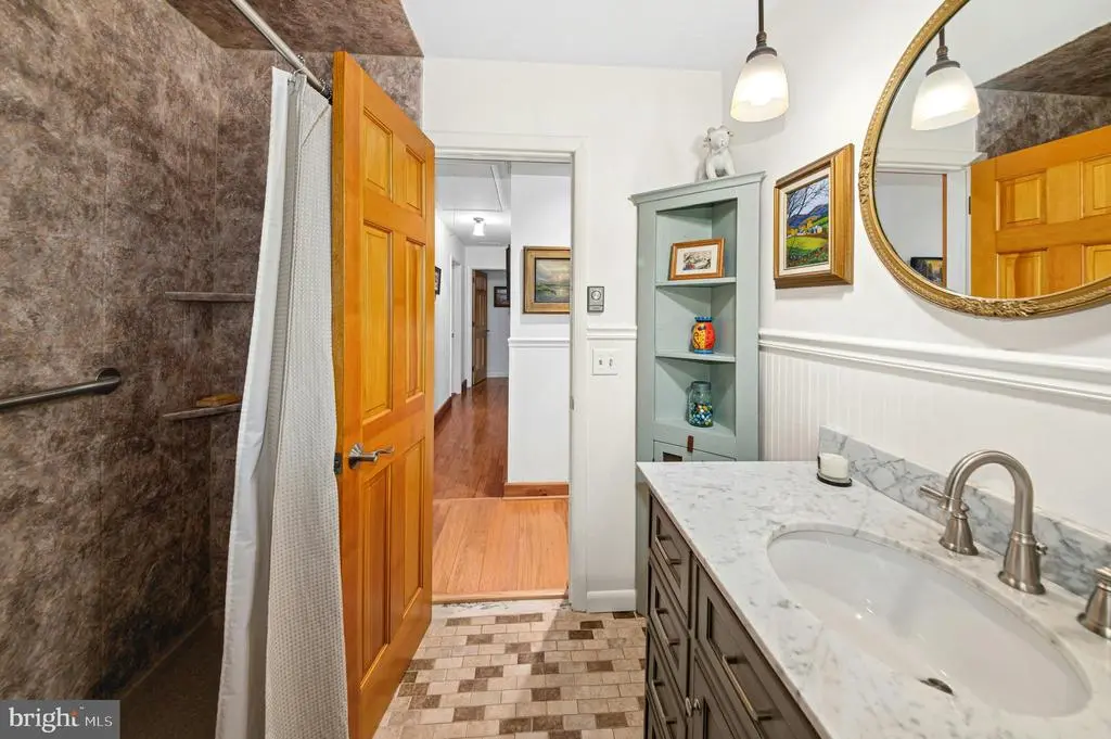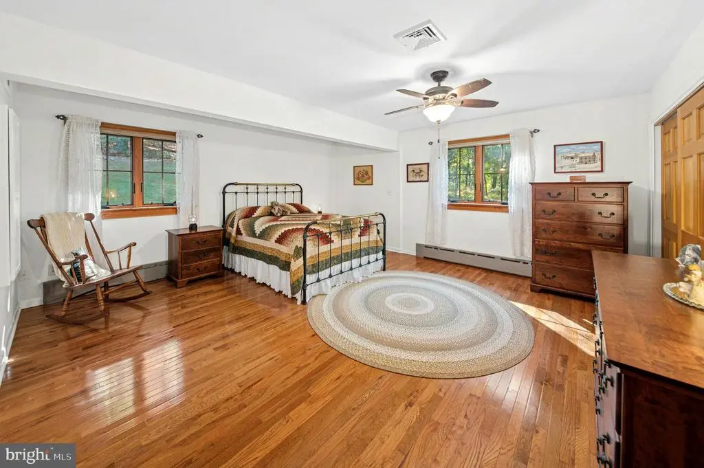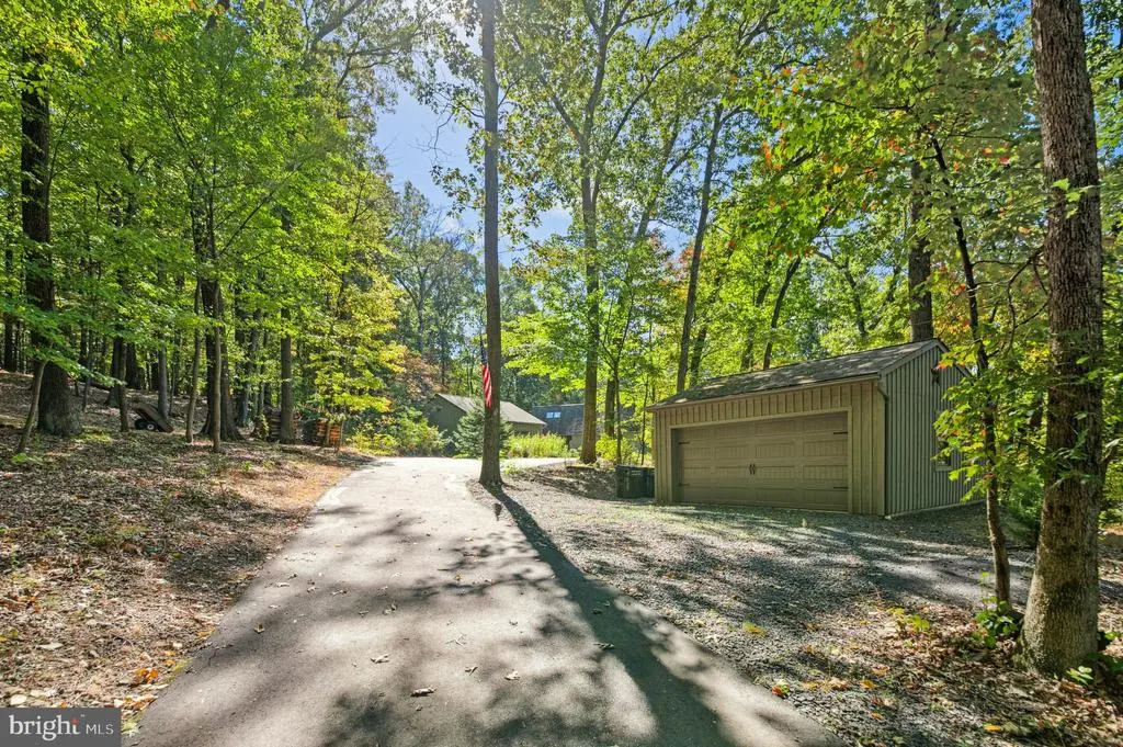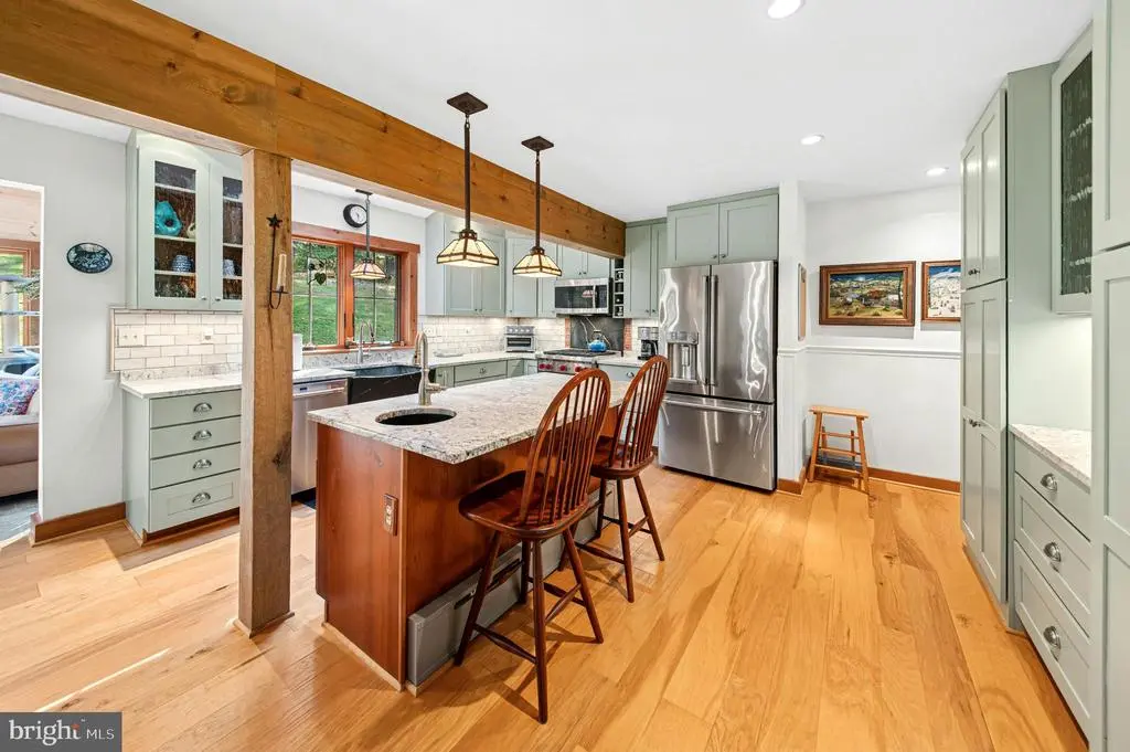 GALLERY HOUSE Framed by stately trees and colorful plantings, this charming cedar ranch is nestled on 4.85 wooded acres in Upper Bucks County. Mid-century built and extensively renovated in 2014, the convenient one level floor plan is enhanced with hardwood floors, exposed wood beams, and a loft area fit for an artist. A deep covered porch off the circular driveway leads to an open floor plan with abundant windows. The two-story great room boasts a cathedral ceiling and wood burning stove and flows easily to the dining room. A spacious sunroom with heated floor looks out over the private backyard and welcoming entertaining spaces. The expansive eat-in kitchen includes stainless appliances, leathered granite countertops, and gas cooking. Nearby, the family room is ideal for quiet nights, with a wood burning fireplace set in a sparkling mica stone wall. Expansive and light-filled, the primary suite includes dual walk-in closet and a luxurious en suite bath with river rock shower and separate soaking tub. Two additional bedrooms share an updated bath. Outside, porches and patios are positioned to take in the beauty of the surroundings on all sides. A large detached garage features a 12.5’ ceiling for automotive enthusiasts, while a second garage provides additional space for vehicles and storage. The sought after location provides privacy yet is just minutes away from the Delaware River, with easy access to commuter routes, shopping, dining and entertainment.