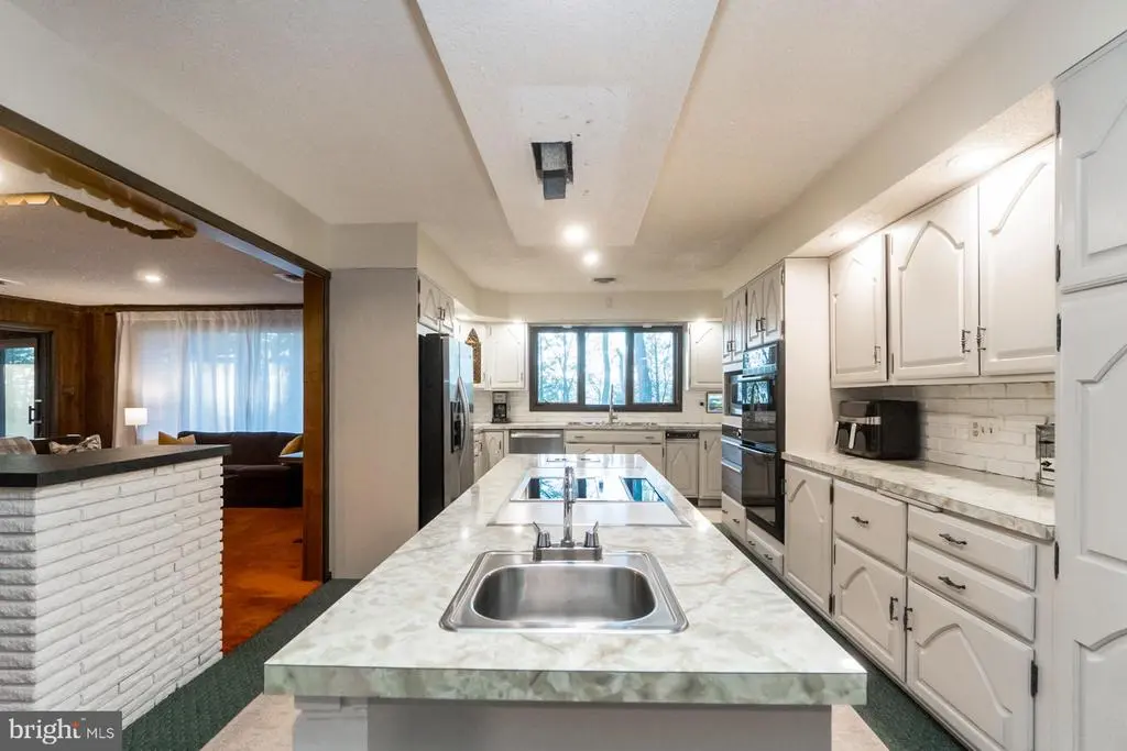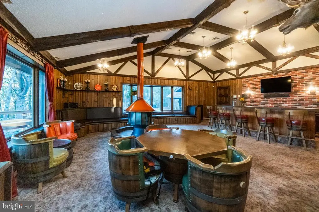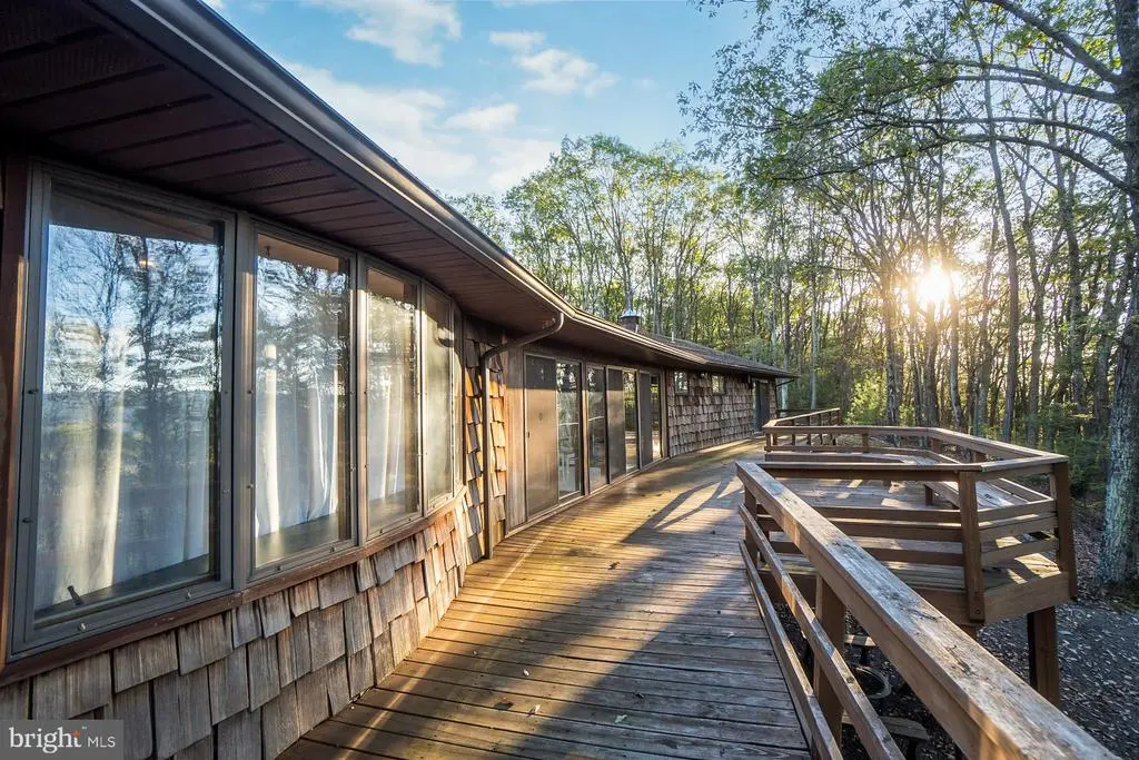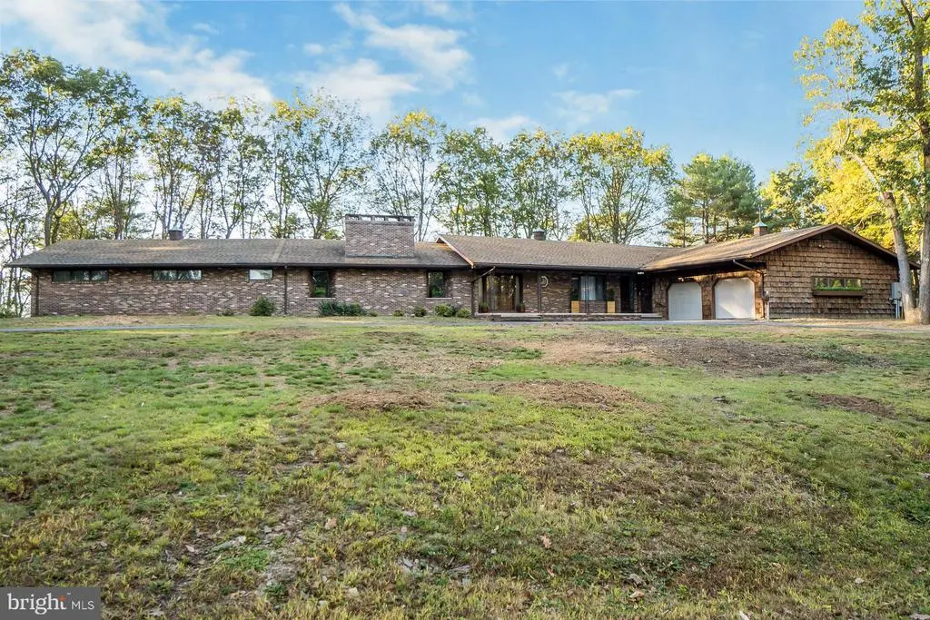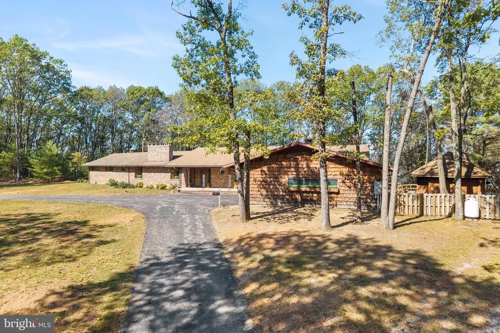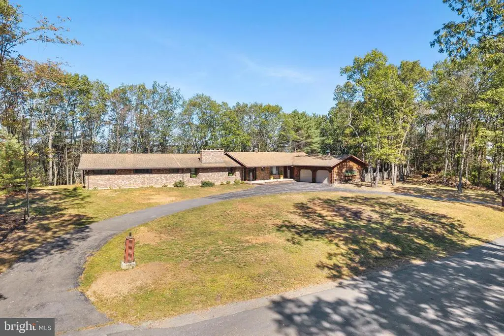 3 BR / 2.5 BA MASSIVE Ranch Home with STUNNING VIEWS offering incredible space, style, and vintage charm! Meticulously maintained and filled with character, this one-of-a-kind property greets you with a long horseshoe-shaped driveway and oversized 2-car garage. The ultimate entertainer’s dream—outside features a distinctive “B”-shaped in-ground pool with pool house, large front porch, and HUMONGOUS rear deck perfect for gatherings! Step inside to a welcoming foyer with spiral staircase leading to the full walkout basement, a spacious living room, and a retro kitchen with center island cooktop + grill, built-in blender hub, double ovens, and eat-in nook. Enjoy the huge family/bar/rec room showcasing cathedral ceilings, gorgeous woodwork, a large bow window with padded booth seating, and the striking orange floor-to-ceiling fireplace centerpiece! Interior highlights include a massive dining room with brick wall and wood-burning fireplace, adjoining sunporch with deck access, and a charming laundry + half-bath behind “saloon”-style doors. The primary suite offers deck access, a separate vanity/dressing area, and private bath with dual sinks and stall shower. Two additional large bedrooms share a hall bath featuring a unique sunken tub! Full unfinished walkout basement provides endless potential. A truly extraordinary home blending space, craftsmanship, and timeless flair!