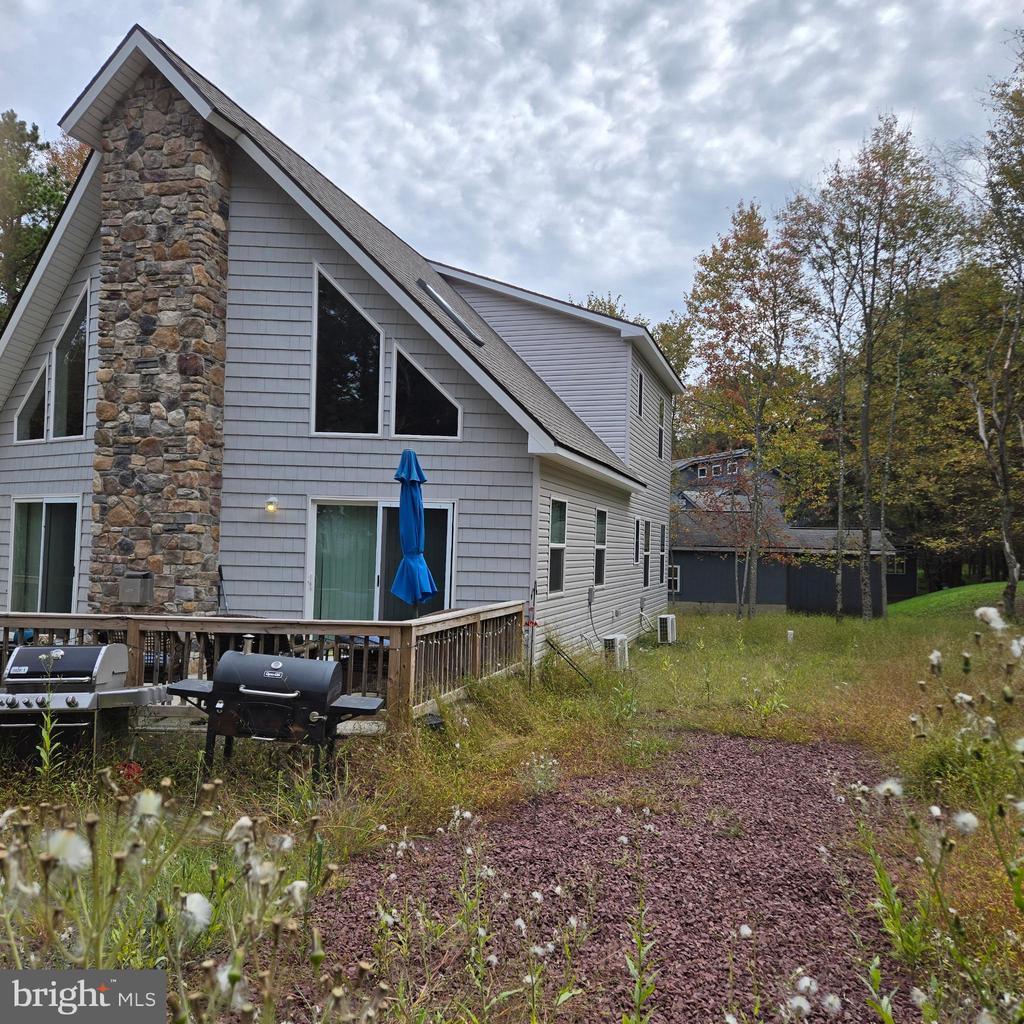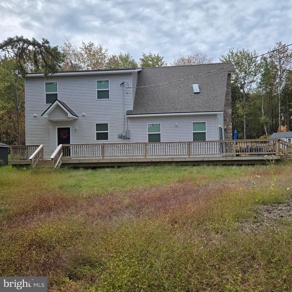 The home features an open concept. The laundry is on the 1st floor. There is a 1st-floorprimary bedroom with a master bath. There is also a 1st-floor powder room and storage. Up the open staircase you will find a loft-style living room, two bedrooms and a hall bath with tub-shower. The home is surrounded by a wrap-around deck. A part of Towamensing Trails, with an HOA fee.