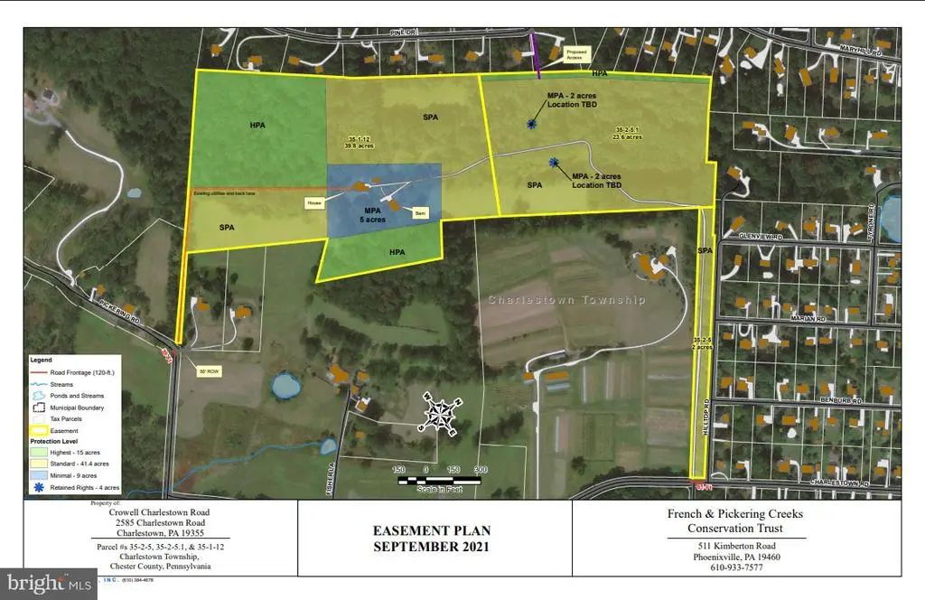Tucked away within the protected natural beauty of Charlestown Township, this remarkable 23-acre parcel offers a once-in-a-generation opportunity to create your dream retreat. Set within a larger 65-acre conservation estate currently offered at $4,250,000, this parcel is now available on its own, subject to coordination with the other parcel. This land holds the unique ability, within the framework of the recorded French & Pickering conservation easement, to establish two separate Minimal Protection Areas (MPAs) of approximately two acres each. These MPAs serve as designated building envelopes, allowing you to create up to two extraordinary homes, each designed to harmonize with the surrounding woodland, meadows, and natural topography. With locations to be determined, the possibilities are both inspiring and flexible, whether for a family compound, a main home with a guest house or studio, or a legacy retreat. Surrounded by preserved open space and buffered by woodlands, the property offers unmatched seclusion and serenity while remaining just minutes from downtown Phoenixville, Malvern, the Main Line, and major arteries into Philadelphia and beyond. Build in a place where your vision is framed by nature, protected by conservation, and elevated by purpose. Any sale is contingent on the coordinated sale of the additional parcels and the finalization of shared access agreements if sold separately. Not all land shown in photos is necessarily part of this individual parcel.
