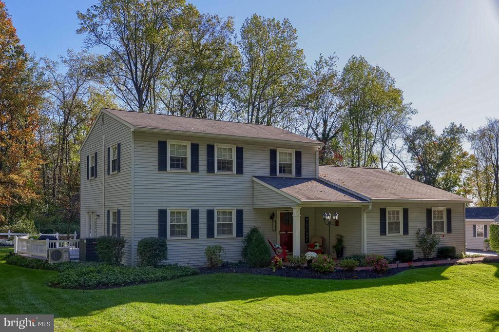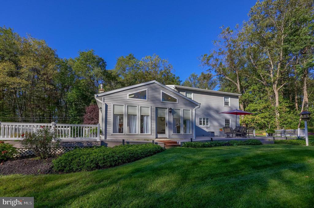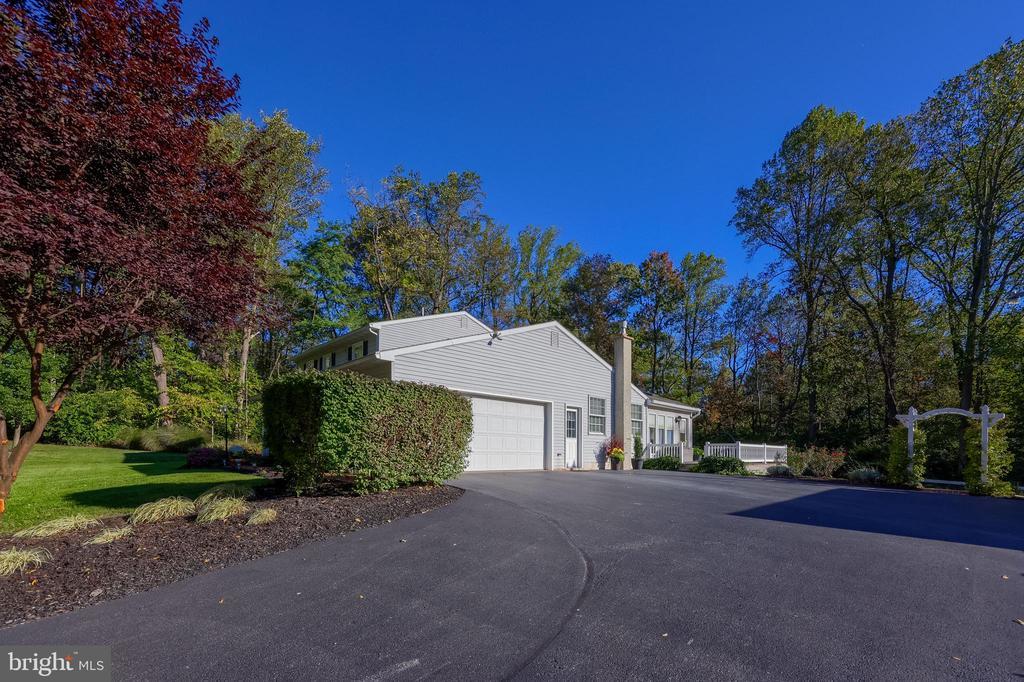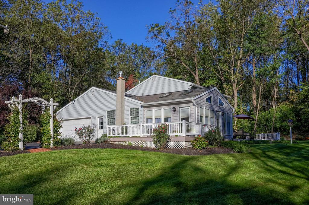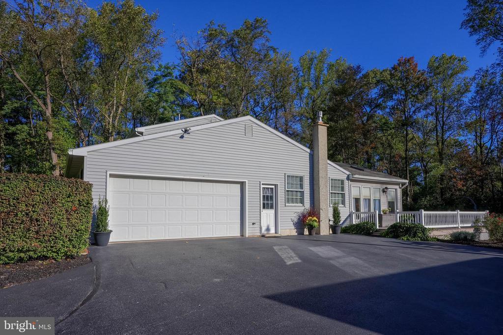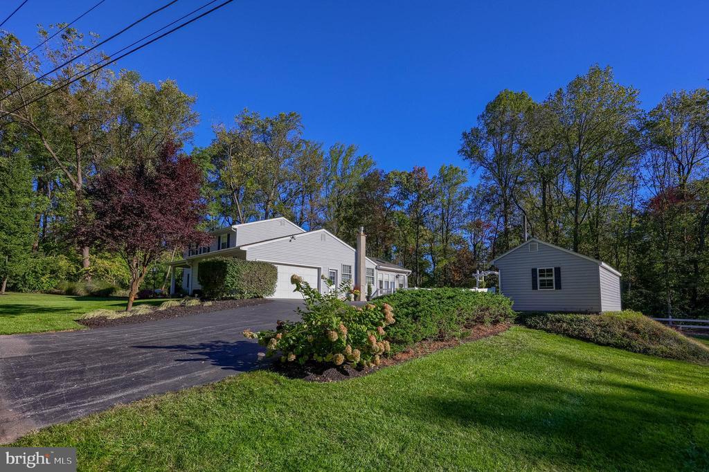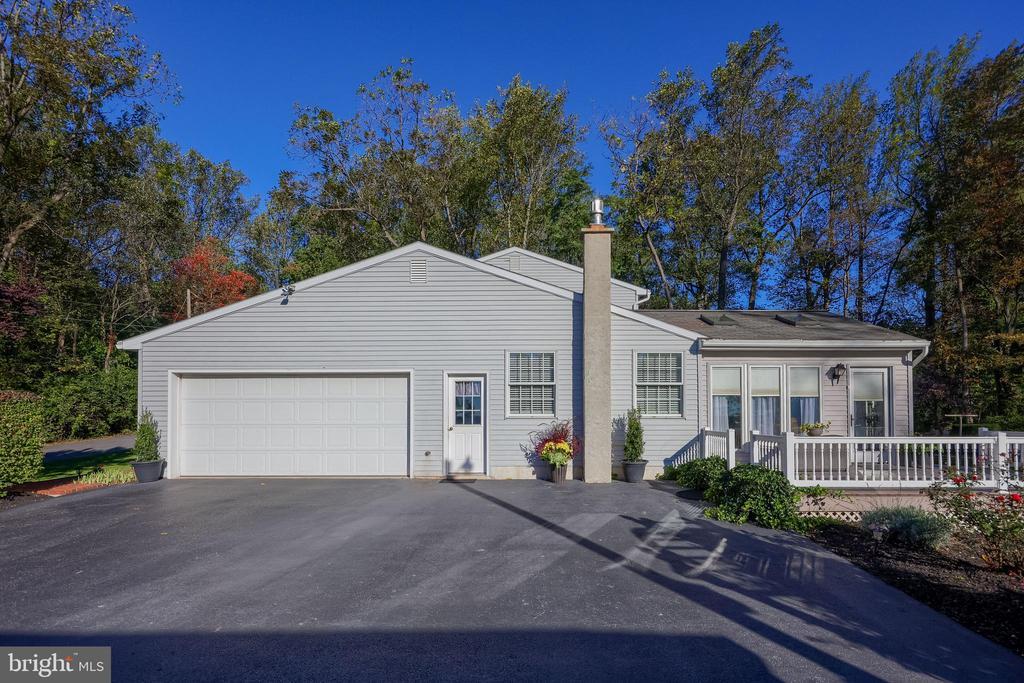 Beautifully maintained 4-bedroom, 1.5-bath two-story home in a secluded setting with many appealing features. From the front door the gleaming hardwood floor invites you home. The spacious kitchen is the heart of the home with amazing cabinet space and extensive corian countertops. An island conveniently brings additional counter space and seating for coffee breaks and snack time. Three windows at the sink flood the room with natural light and gives a view overlooking the backyard. The dining room is next to the kitchen with plenty of space. The opening from the dining room to the living room is perfectly placed to stretch the dining room table for large gatherings. On the other side of the kitchen the family room offers relaxing space perfectly sized to be cozy without being crowded. Recent flooring throughout the family room and adjoining sunroom. The sunroom showcases a vaulted ceiling with skylights and many windows for natural lighting and panoramic outdoor views. Outside multiple Trex decks offer expansive space for morning coffee, sunny afternoon relaxing, and entertaining guests. The finished basement is excellent space for games, reading and other activities, kept comfortable year round by a 2 year old mini-split system. The garage is a clean and unique bonus space, featuring a full second kitchen, laundry area, and durable epoxy floors—perfect for extended living space, a workshop, or entertaining. Two sheds offer ample storage, including one that has electric, is fully insulated, and heated. The yard is large and offers multiple areas for outdoor recreation.