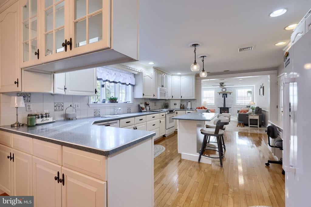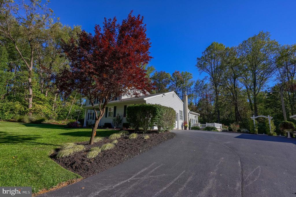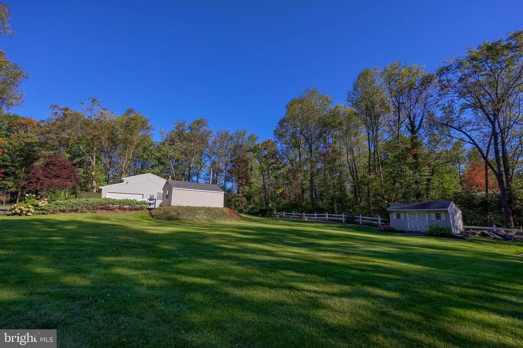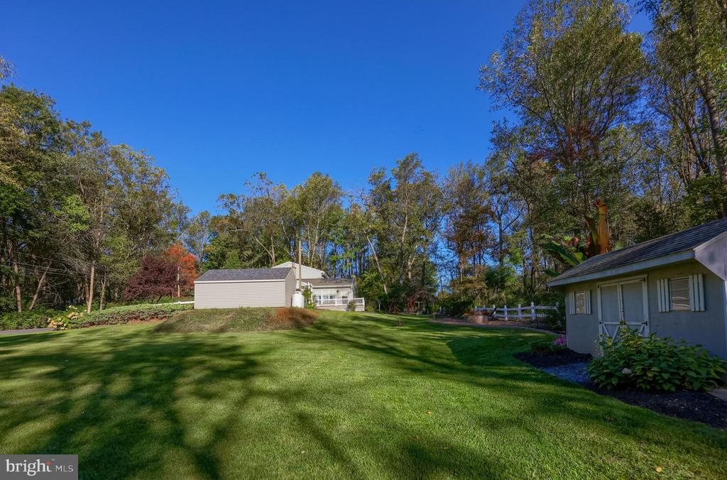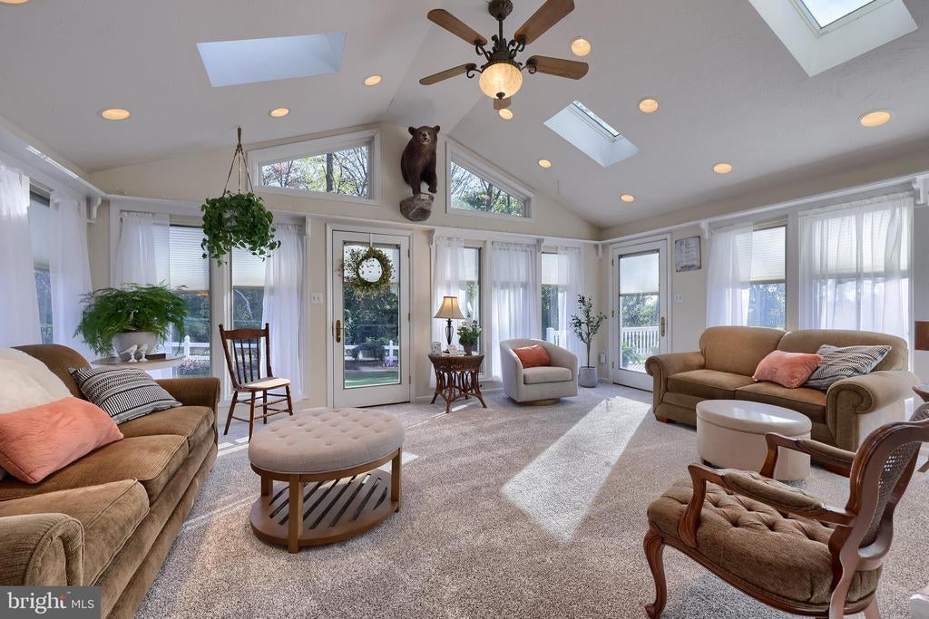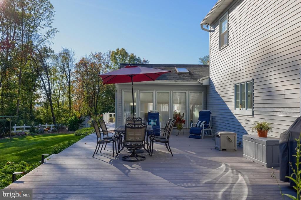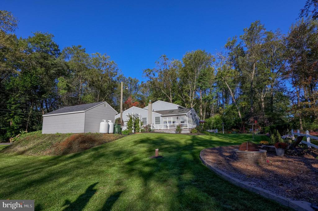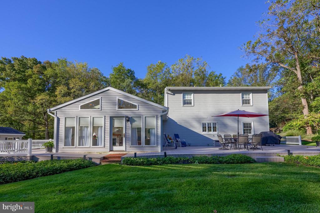 Beautifully maintained 4-bedroom, 1.5-bath two-story home in a secluded setting with many appealing features. From the front door the gleaming hardwood floor invites you home. The spacious kitchen is the heart of the home with amazing cabinet space and extensive corian countertops. An island conveniently brings additional counter space and seating for coffee breaks and snack time. Three windows at the sink flood the room with natural light and gives a view overlooking the backyard. The dining room is next to the kitchen with plenty of space. The opening from the dining room to the living room is perfectly placed to stretch the dining room table for large gatherings. On the other side of the kitchen the family room offers relaxing space perfectly sized to be cozy without being crowded. Recent flooring throughout the family room and adjoining sunroom. The sunroom showcases a vaulted ceiling with skylights and many windows for natural lighting and panoramic outdoor views. Outside multiple Trex decks offer expansive space for morning coffee, sunny afternoon relaxing, and entertaining guests. The finished basement is excellent space for games, reading and other activities, kept comfortable year round by a 2 year old mini-split system. The garage is a clean and unique bonus space, featuring a full second kitchen, laundry area, and durable epoxy floors—perfect for extended living space, a workshop, or entertaining. Two sheds offer ample storage, including one that has electric, is fully insulated, and heated. The yard is large and offers multiple areas for outdoor recreation.