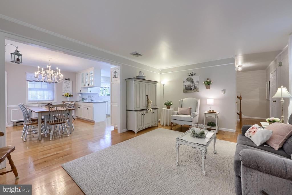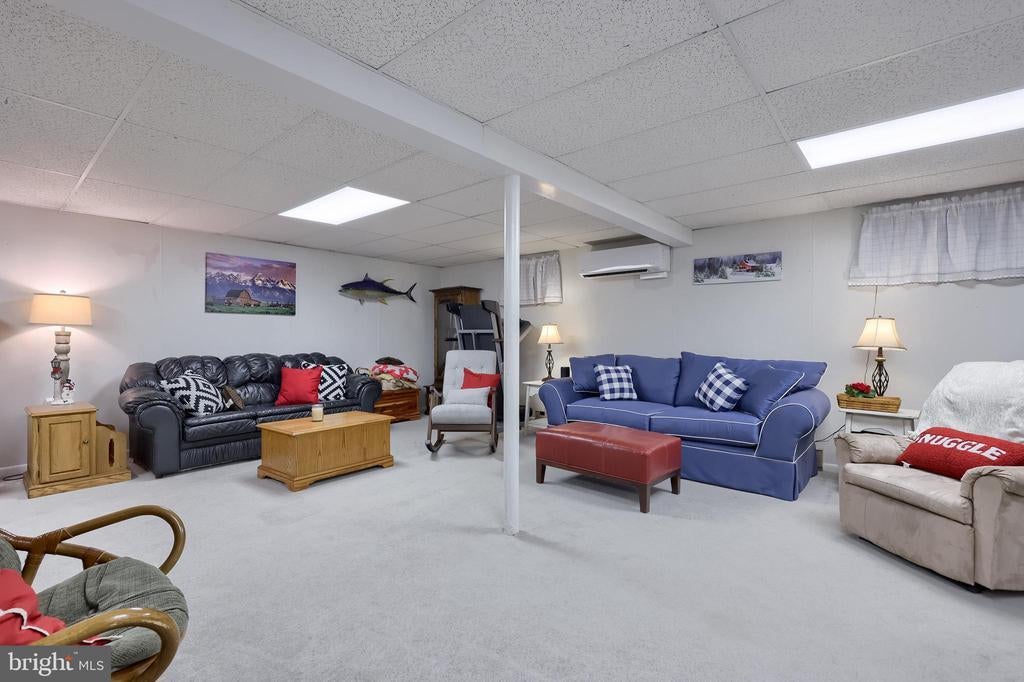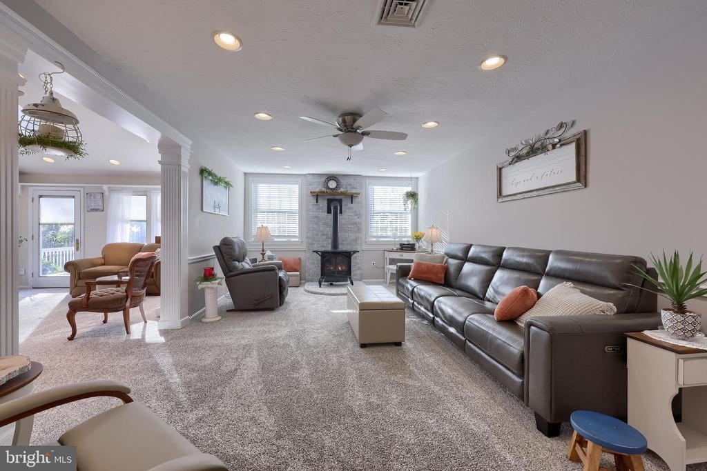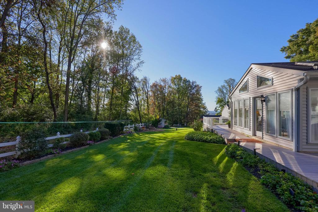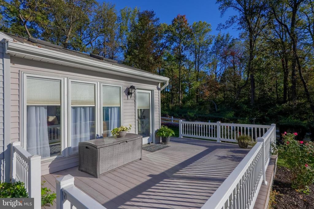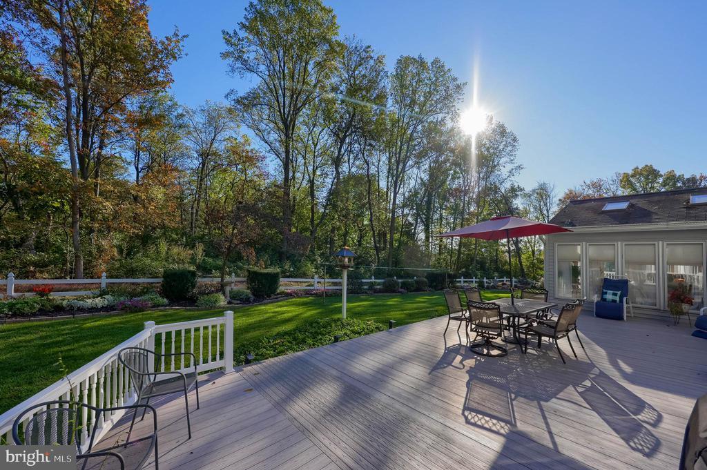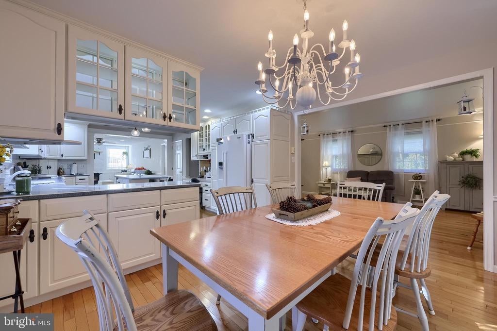Beautifully maintained 4-bedroom, 1.5-bath two-story home in a secluded setting with many appealing features. From the front door the gleaming hardwood floor invites you home. The spacious kitchen is the heart of the home with amazing cabinet space and extensive corian countertops. An island conveniently brings additional counter space and seating for coffee breaks and snack time. Three windows at the sink flood the room with natural light and gives a view overlooking the backyard. The dining room is next to the kitchen with plenty of space. The opening from the dining room to the living room is perfectly placed to stretch the dining room table for large gatherings. On the other side of the kitchen the family room offers relaxing space perfectly sized to be cozy without being crowded. Recent flooring throughout the family room and adjoining sunroom. The sunroom showcases a vaulted ceiling with skylights and many windows for natural lighting and panoramic outdoor views. Outside multiple Trex decks offer expansive space for morning coffee, sunny afternoon relaxing, and entertaining guests. The finished basement is excellent space for games, reading and other activities, kept comfortable year round by a 2 year old mini-split system. The garage is a clean and unique bonus space, featuring a full second kitchen, laundry area, and durable epoxy floors—perfect for extended living space, a workshop, or entertaining. Two sheds offer ample storage, including one that has electric, is fully insulated, and heated. The yard is large and offers multiple areas for outdoor recreation.