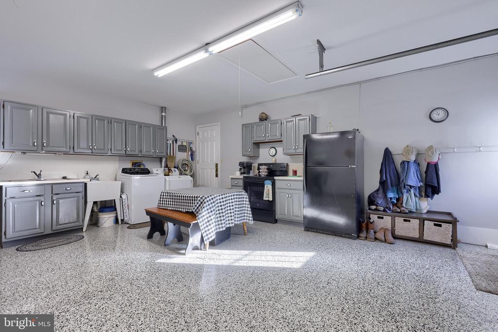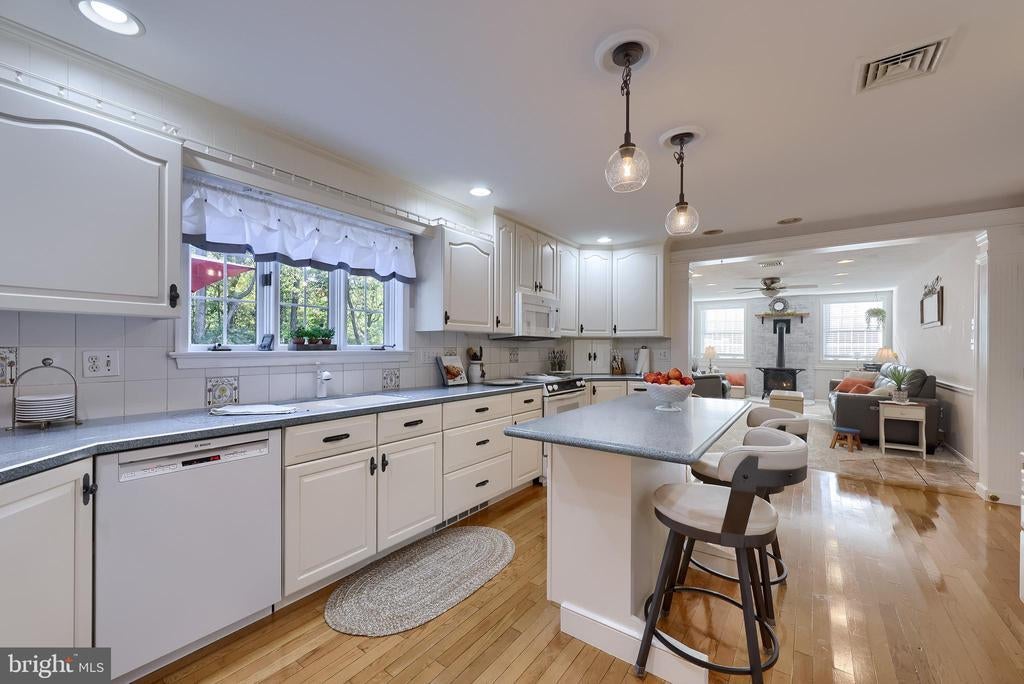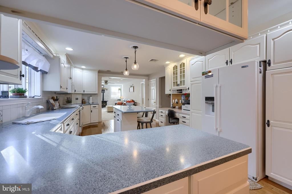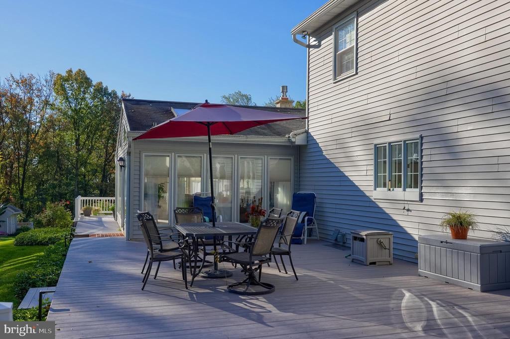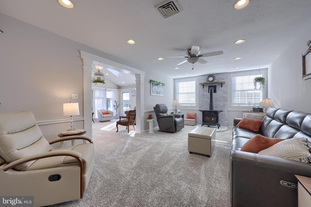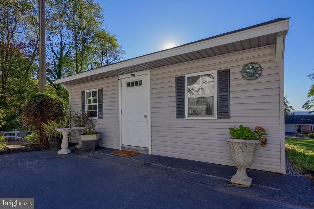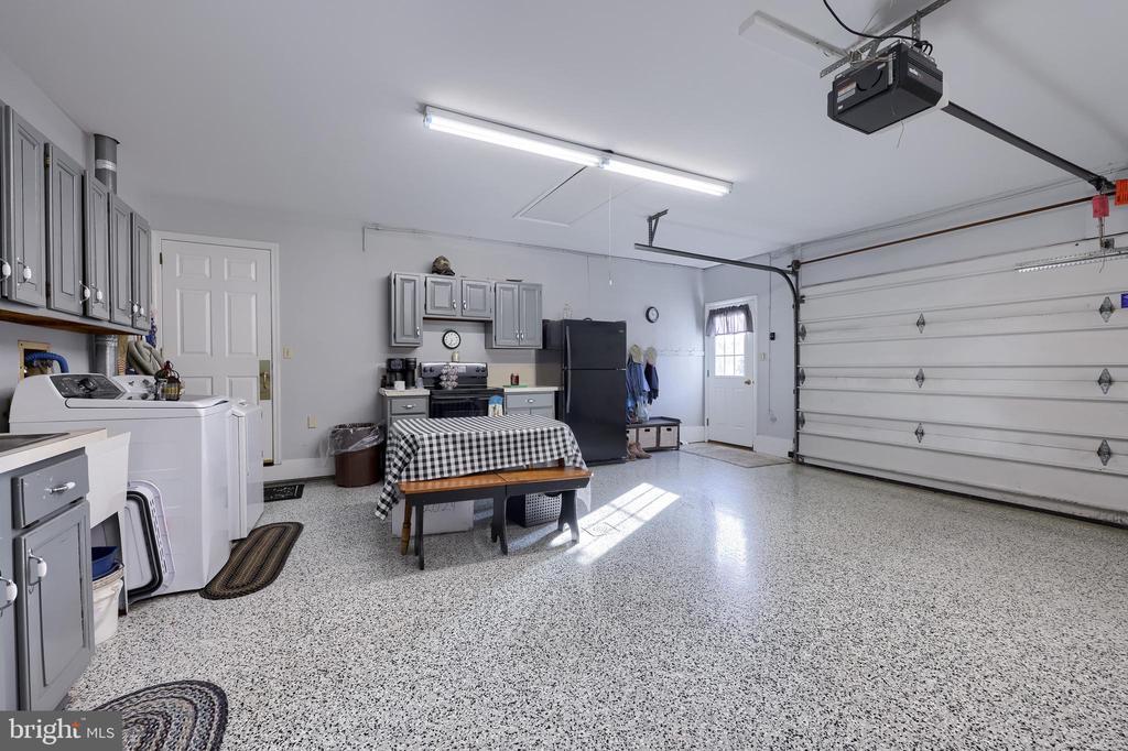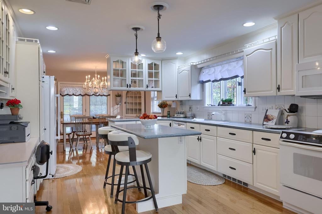 Beautifully maintained 4-bedroom, 1.5-bath two-story home in a secluded setting with many appealing features. From the front door the gleaming hardwood floor invites you home. The spacious kitchen is the heart of the home with amazing cabinet space and extensive corian countertops. An island conveniently brings additional counter space and seating for coffee breaks and snack time. Three windows at the sink flood the room with natural light and gives a view overlooking the backyard. The dining room is next to the kitchen with plenty of space. The opening from the dining room to the living room is perfectly placed to stretch the dining room table for large gatherings. On the other side of the kitchen the family room offers relaxing space perfectly sized to be cozy without being crowded. Recent flooring throughout the family room and adjoining sunroom. The sunroom showcases a vaulted ceiling with skylights and many windows for natural lighting and panoramic outdoor views. Outside multiple Trex decks offer expansive space for morning coffee, sunny afternoon relaxing, and entertaining guests. The finished basement is excellent space for games, reading and other activities, kept comfortable year round by a 2 year old mini-split system. The garage is a clean and unique bonus space, featuring a full second kitchen, laundry area, and durable epoxy floors—perfect for extended living space, a workshop, or entertaining. Two sheds offer ample storage, including one that has electric, is fully insulated, and heated. The yard is large and offers multiple areas for outdoor recreation.