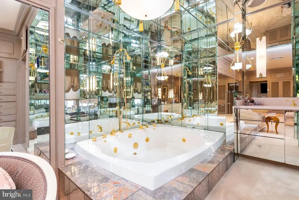 Additional Stairway, Bar, Bathroom - Jetted Tub, Bathroom - Stall Shower, Bathroom - Walk-In Shower, Built-Ins, Butlers Pantry, Carpet, Cedar Closet(s), Ceiling Fan(s), Chair Railings, Crown Moldings, Curved Staircase, Elevator, Formal/Separate Dining Room, Pantry, Primary Bath(s), Recessed Lighting, Sauna, Skylight(s), Sound System, Upgraded Countertops, Wainscotting, Walk-in Closet(s), Water Treat System, Wet/Dry Bar, WhirlPool/HotTub, Window Treatments