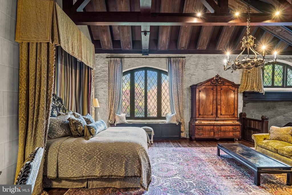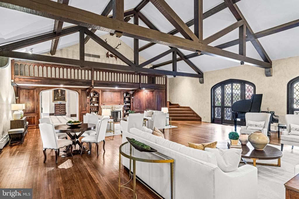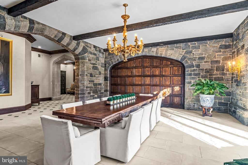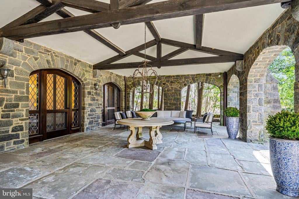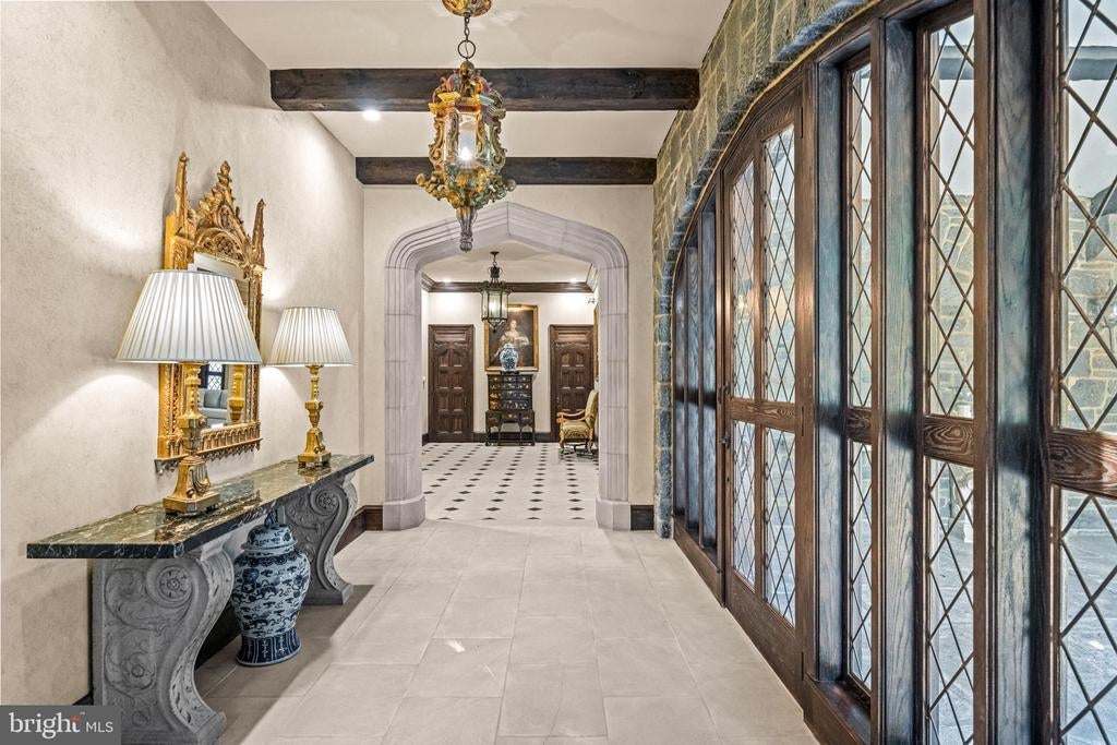 A stunning showcase of Tudor Revival architecture, 56 Crosby Brown Road is a set on 2.8 level acres on a private lane in the heart of Gladwyne on Philadelphia’s prestigious Main Line. Built between 1895–1905, this gorgeous, one-of-a-kind estate seamlessly blends historic grandeur with modern luxury. This exceptional property has been meticulously updated to provide every modern comfort with details executed to perfection. A dramatic entry Loggia leads you to grand leaded glass doors where you enter the foyer and center hall anchored by limestone with granite insets and custom limestone surrounds. Crowned by a soaring 25-foot beamed ceiling, the formal living room features a marble wood-burning fireplace with rich millwork and cabinetry, an impressive space for gatherings with access to one of three terraces that look out over the gardens. With its striking hand-crafted leaded glass window, the formal dining room is ideal for seamless entertaining, featuring a concealed doorway providing direct access to the butler’s pantry, wet bar and wine room. The main level also features an exquisite paneled library bathed in natural light from floor-to-ceiling sliders that lead you to the center terrace and gardens. Designed with exquisite custom artisan cabinetry by Downsview Kitchens and featuring Hereau fixtures, Miele appliances and Wolf ranges, this expansive kitchen flows effortlessly into the family room creating a warm and functional space for everyday living. Centered around a grand limestone gas fireplace, the family room offers a comfortable gathering place with direct access to the patio, outdoor kitchen and rear gardens. Adjacent to the kitchen, a spacious sun-drenched bonus room that formerly housed a lap pool with the potential to be restored, now serves as a bright gym and relaxed lounge area. Completing the main level is a laundry room, formal and informal powder rooms, and full bath. Ascend to the second floor, where dramatic 25-foot ceilings boast beams inlaid with hand painted canvases.The primary suite has vaulted ceilings, rich wood paneling with built-in closets, a sitting area, and an exquisite, extensively renovated ensuite bath featuring an Italian marble throughout and Sherele Wagner Fixtures. The second floor also features three sizable en-suite bedrooms, all benefiting from modern comforts and newly renovated bathrooms. One of these includes a welcoming gas fireplace. Next to the main home is a charming, completely renovated 2-bedroom, 1-bath carriage house with a full service kitchen. The half-timbered exterior recalls an English country home, while modern amenities provide today’s desired comforts. It can be used as a guest house or home office. A circular driveway with attached garage; original stone potting shed, extensive stone terraces with outdoor kitchen; and meticulously landscaped yard and gardens that were once an arboretum complete this serene retreat. This historic gem is located in the prestigious Lower Merion School District just 1.7 miles from the Haverford and Ardmore train stations, with service to Phila. and NYC. 2 miles from Merion Cricket Club, 10 miles to center city Phila., close to various private schools, restaurants and shopping. With its unparalleled combination of history, craftsmanship, and modern elegance, 56 Crosby Brown Road is truly a Main Line legacy property.