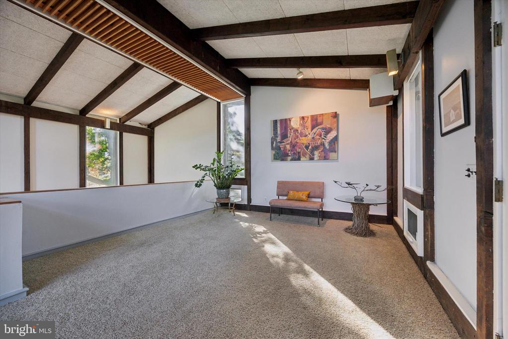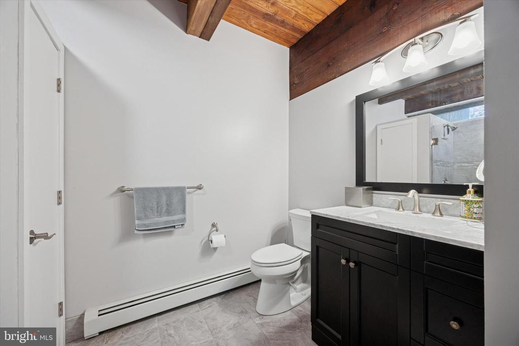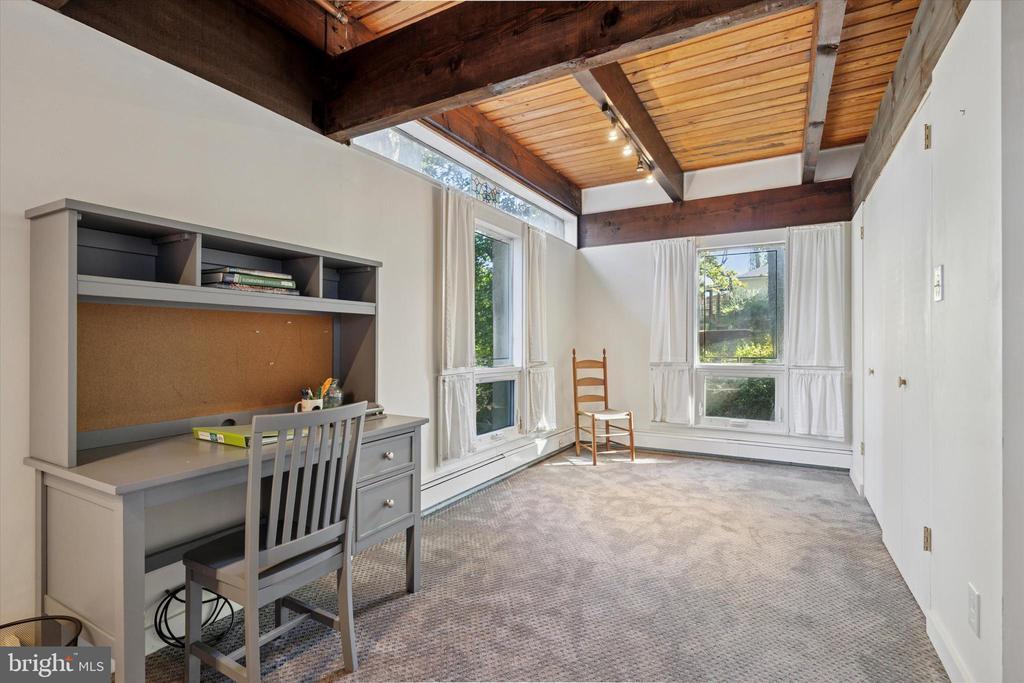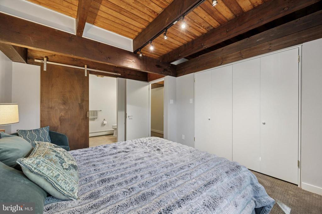 Stall Shower, Bathroom - Walk-In Shower, Exposed Beams, Studio, Wood Floors, Built-Ins