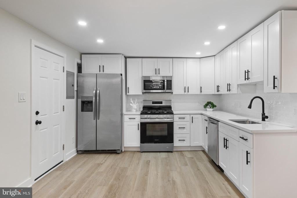Prepare to fall in love with this FULLY REMODELED 3-bedroom, 2-bathroom home! Nestled in a quiet, family-friendly neighborhood, this charming residence offers a spacious front and backyard. Conveniently located just minutes from schools, parks, shopping, public transportation, and more, it provides the perfect blend of comfort and accessibility. Parking is a breeze with your own detached garage and a large driveway. Designed for convenience and easy living, this home truly offers the ideal space to call your own. Step into the spacious living room, where large door-height windows flood the space with natural light, creating a warm and inviting atmosphere. Adjacent to it is the dining area and the beautifully updated L-shaped kitchen, featuring brand-new stainless steel appliances, snow-white cabinets, and sleek countertops — a perfect space for cooking and gathering. The main bedroom boasts a private ensuite bath, while the two additional bedrooms are generously sized and share a large hallway bathroom. The convenient laundry and utility area add functionality to your everyday living. Outside, you’ll love the spacious front & backyard and a rear patio, ideal for family gatherings, gardening, or simply unwinding under the open sky. Move right in and experience easy, one-level living at its finest — schedule your private tour today and make this beautiful home yours!