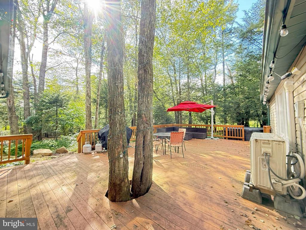 Nestled on a wooded lot backing up to the golf course, this 3-bedroom, 2.5-bath contemporary home offers the perfect blend of style, comfort, and natural beauty. The open floor plan features a stunning sunken living room with high ceilings, exposed wood beams, and a cozy wood-burning stove, creating a warm and inviting atmosphere. The loft bedroom with a private bath adds flexibility for guests or a private retreat. Sliders open to a spacious deck with hot tub, ideal for entertaining or simply relaxing while enjoying the serene views. Located in the desirable Pocono Farms Country Club, residents enjoy access to an array of amenities including golf, a lake, swimming pool, fitness center, and more. This home is a true retreat, combining modern design with the best of Poconos living!