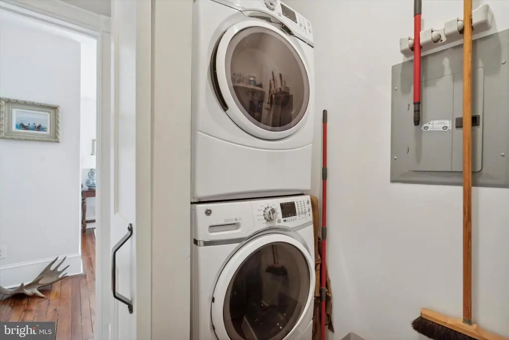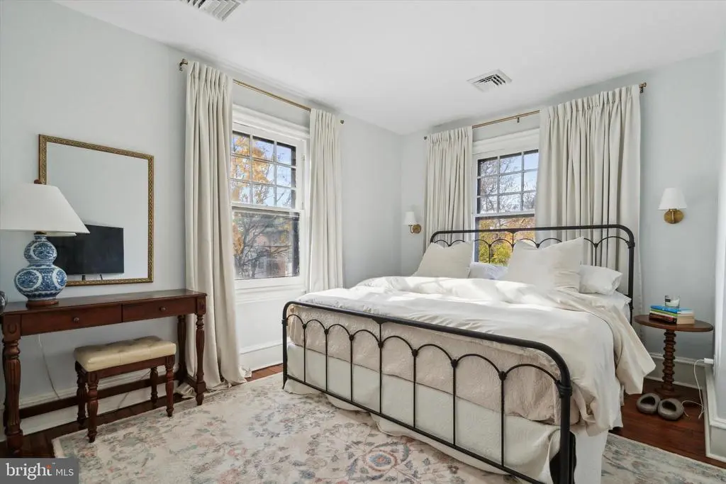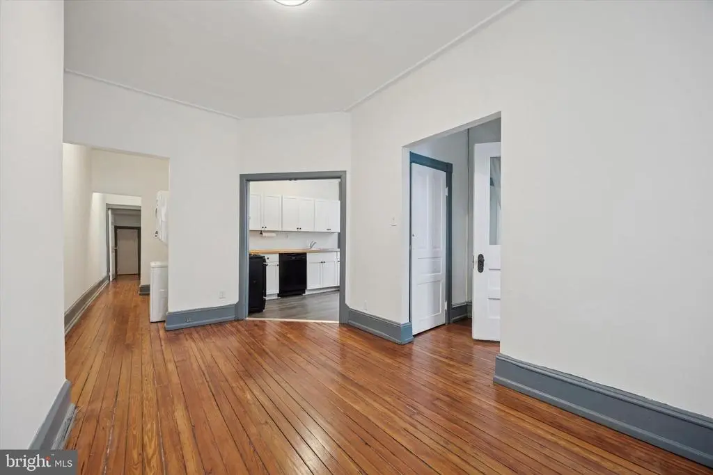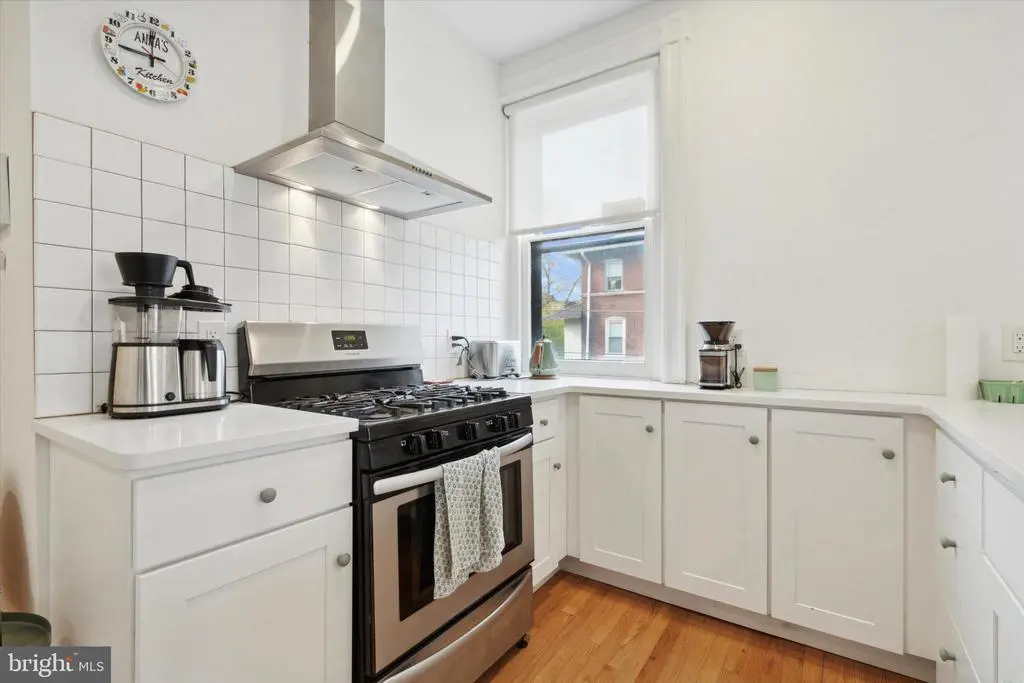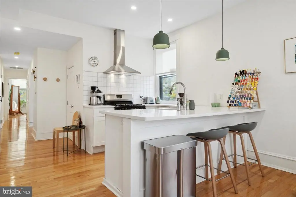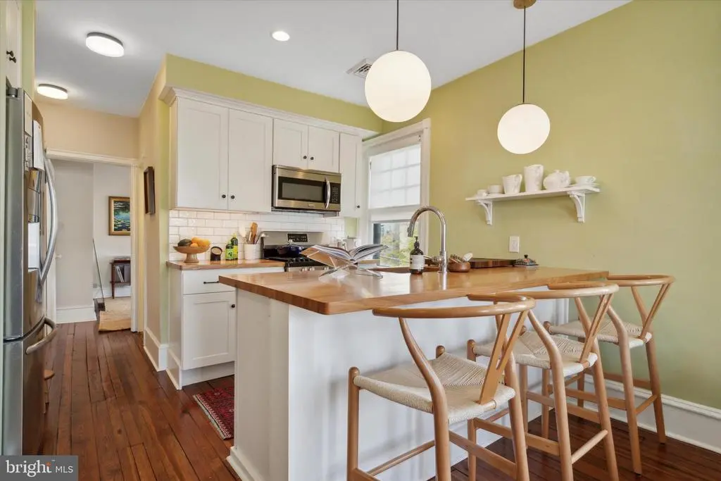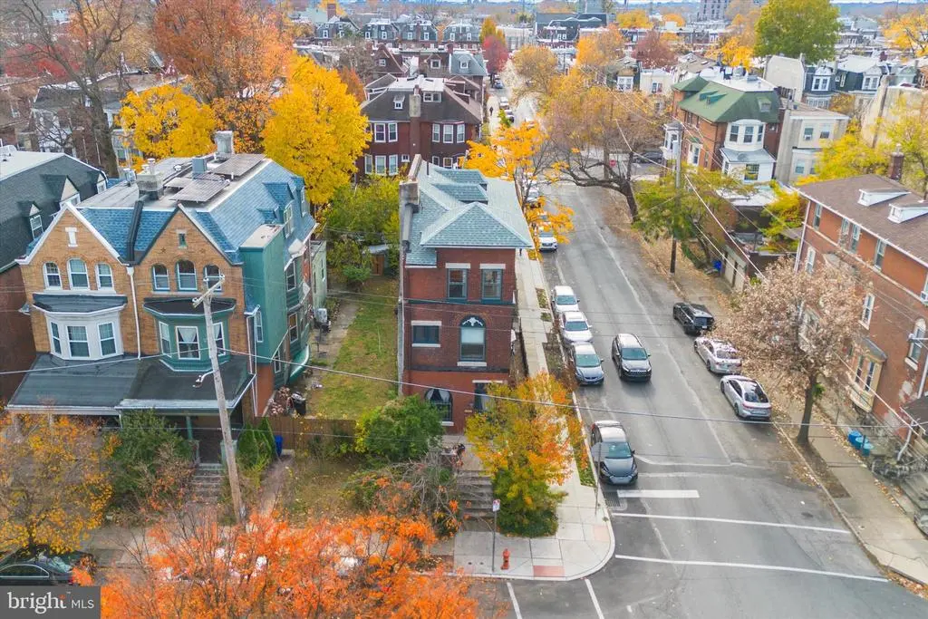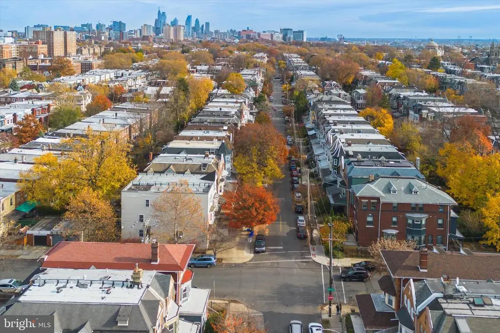 This majestic three-unit corner property with a coveted garage is a great candidate for an owner occupant looking for a long-term investment and home in one, a house hack for friends seeking a cooperative lifestyle while preserving privacy with separate living quarters, or as a straightforward turnkey addition to an investor’s portfolio–and the potential for a future condo project comes to mind for any of the above. All three apartments are spacious and brimming with classic West Philly charm; units 2 and 3 were totally renovated for two of the owners to occupy, while the first-floor unit received a nice facelift, making it uber-rentable. Unit 1 has private front porch access, a vestibule entrance and large coat closet, newly refinished original pine floors throughout; living room with oversized arched window; a bay window with bench in the renovated kitchen; bathroom with mid-mod black and yellow tile; in-unit laundry; and two good-sized bedrooms–one with a bay window and the other with access to the rear porch and yard. The second and third floors have both been renovated with stylish, high-quality finishes, and both feel like stepping into a lifestyle mag, albeit in notably different ways. Unit 2, which has new Bruce oak floors that run throughout, has a more modern sensibility, with Scandinavian-inspired finishes that blend nicely with the original details. The open-plan living space with two exposures has a decorative fireplace with original mirrored mantel, a sweet set of leaded glass windows along with a large closet, and a sleek kitchen with breakfast bar and stainless steel appliances including a GE French door fridge and a Frigidaire five-burner range with architectural hood. Green Muuto pendant lights and cabinet hardware are set against white quartz countertops and ample white Shaker-style cabinets; there’s also an enormous pantry closet. The center room has another sweet leaded glass window, an extra-large closet and a full wall of built-in shelving. It is currently used as a den; all it needs for total privacy is a set of barn or double doors. The large rear bedroom is flooded with light from two exposures. A hallway laundry closet with GE frontloaders and a mid-mod pink and black bathroom with original cast iron tub complete this space. Unit 3, with a more traditional feel, also offers a large open-plan living space with two exposures and a gorgeous U-shaped kitchen. Here original pine floors run throughout and the living room features a charming beadboard built-in bookcase and coat closet. This kitchen has classic globe pendant lighting, Frigidaire stainless steel appliances featuring a five-burner range and French door fridge, warm butcher block countertops and white polished ceramic subway tile backsplash. The good-sized middle bedroom with double windows has a large closet, and the rear has more than enough space for a king-size bed, a large closet and two exposures. Off the hallway is access to the standing-height attic, a large utility closet with GE frontloading laundry and a mid-mod green tile bathroom with pedestal sink and original cast iron tub. The basement with utilities and additional storage is accessed directly from the charming rear yard, which is enclosed at the rear by the detached one-car garage. This lovely building with two mature cherry trees (one edible!) on a lovely block of Hazel Ave is in an ideal Cedar Park location that’s just a hop, skip and a jump to Baltimore Ave.