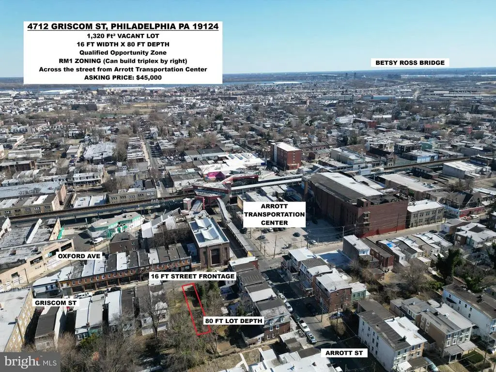 Seller is a licensed Realtor in PA. This 1,320 Square Foot Lot is Zoned RSA5. There are multifamily buildings on the block. This lot sits directly across from Arrott Transporation Center & is in the opportunity zone. Close vicinity to Bridesburg, Kensington. This section of Frankford has many large historic homes, great area to build a multi-unit building. Buyer responsible for obtaining a clear U&O. Asking $35,000