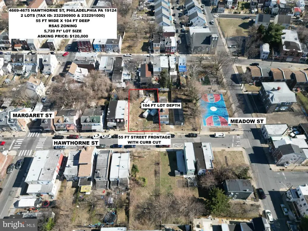 Large Lot 5,700 Square Foot Lot. MUST BUY WITH ADJACENT LOT - 4669-4675 Hawthorne Street ($120K for package). Total lot dimensions are 55 ft Wide X 104 Ft Deep. Currently zoned RSA5. Could go to zoning for a multi-family variance. Very large parcel close to the "El" & Frankford Ave, off of Torresdale Ave. Nice recreational park on the corner. Owner is a licensed realtor in PA.