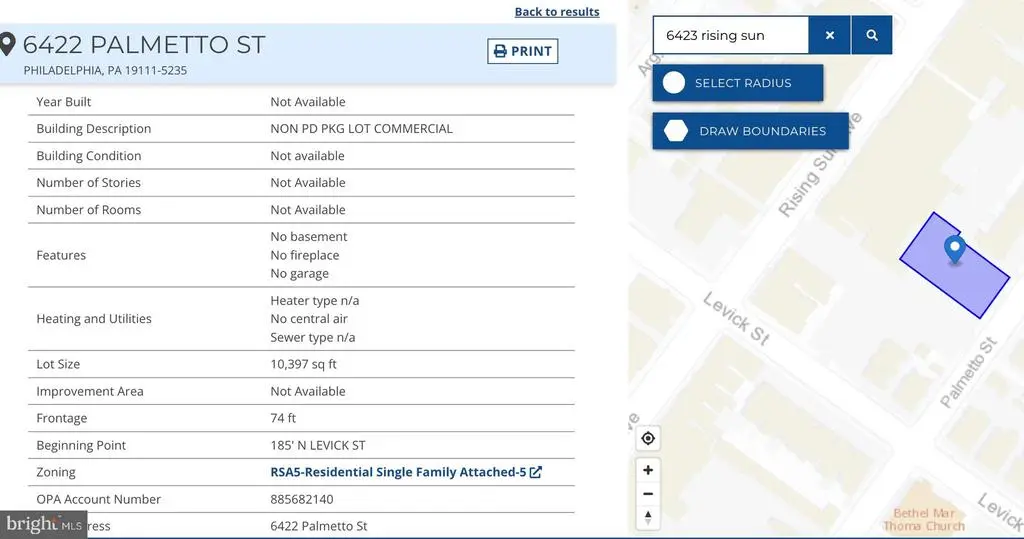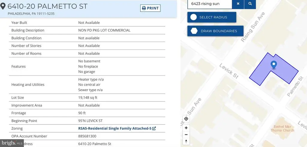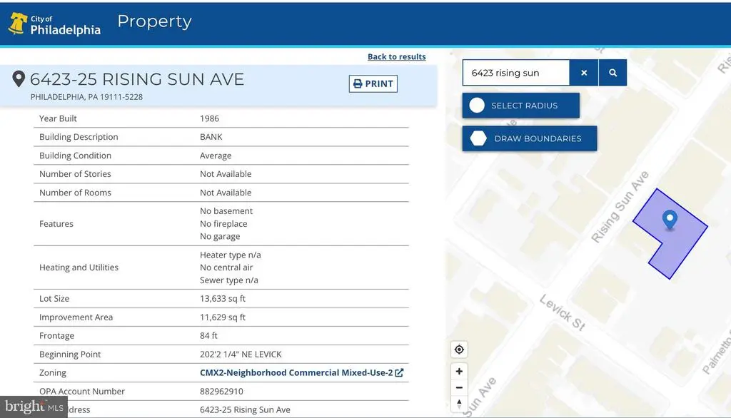 Great Opportunity for an investor and an owner to occupy this 11,629 square feet with a finished basement of 3471 square feet located on 6423-25 Rising Sun Ave. The bank has both entrances from Rising Sun Ave and a parking lot with a large open corridor, lobby, waiting area, personal banker cubicles, reception, meeting room, teller vault, safe deposit vault, men + ladies bathroom, 2-private executive office with bath, lunch room, 2 large conference room with plenty of storage rooms. The adult care center has both entrances large lobby, 4 private offices, a large conference room in the back with a kitchenette, a work room, and 4 bathrooms. The finished basement has 5 large office rooms, 2 baths, a kitchenette, utility rooms, and plenty of storage spaces. There are sprinkler systems in the building, the new roof was installed in April 2024 and the adult care was renovated a few years ago. There are 6 rooftop HVAC Units and 3 were installed after 2017. There are large signages in the front and the back street. Currently, both tenants previous Bank of America's 7,398 sf and the Adult Care center's 4231 square feet are occupying. This sale included 2 additional lots currently 75 parking spaces 6410-20 Parlmetto Street #885681300 and 6422 Palmetto Street # 885682140. The parking lots are shared between both tenants now and the bank does have a drive-thru in the back. Both front entrances are on Rising Sun Ave and the parking entrance and exit are on Levick Street and Palmetto Street. Conveniently located on this busy Rising Sun Ave in the most desirable Northeast Philadelphia, Minutes to Montgomery County, Center City. Also, the building is for lease at $20.00 per square foot. The buyer and agent must check the size and zoning. All showing must send POF before showing.