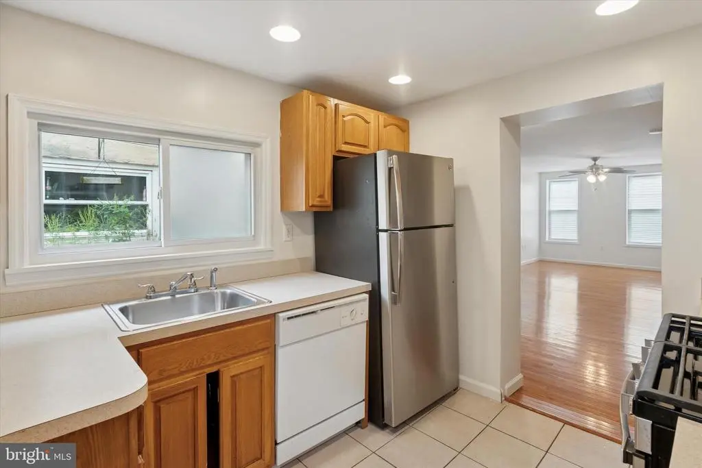 Yes, you can still afford to buy in Pennsport, and no, that doesn’t mean you have to live in a “grandma house”–this cute rowhome with a budget-friendly price is in absolutely move-in condition. Its neutral palette and finishes provide a great base for you to make it your own, whether your style is traditional, modern or something in between. The open-plan first floor has newer oak floors in the main living space, which gets great light from the two south-facing front windows. The ceramic tile rear kitchen with a nice picture window has a stainless steel fridge and five-burner range in an efficient layout that provides good storage space via wood cabinets without sacrificing the all-important dishwasher. The paved rear yard is L-shaped, meaning you can stash a grill and trash cans around the side–or add an AC condenser down the road–with plenty of room left for seating. There’s also access to a shared breezeway to the street, which is great for bikes and trash day. Both sunny upstairs bedrooms have newly installed carpet and good-sized closets. The hall bath has ceramic tile flooring, a generous vanity and a rear-facing window. The spacious basement offers laundry and storage. This great Pennsport side block around the corner from EOM Athletic Association is as walkable to neighborhood faves like Moonshine, Rebel & Wolf coffee and Dickinson Square Park as it is convenient to big-box shopping and I-95. This rare opportunity is truly a no-brainer for anyone paying market-rate rent.