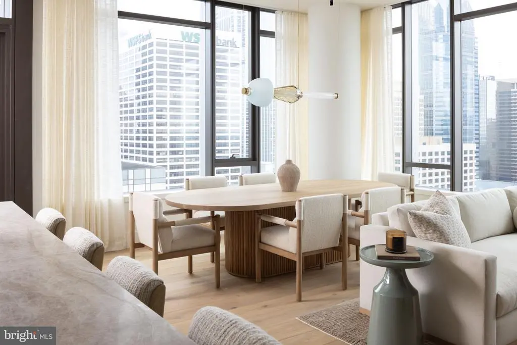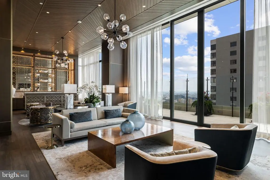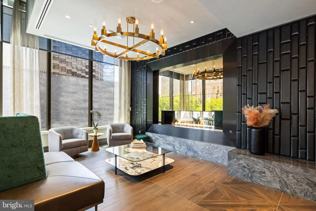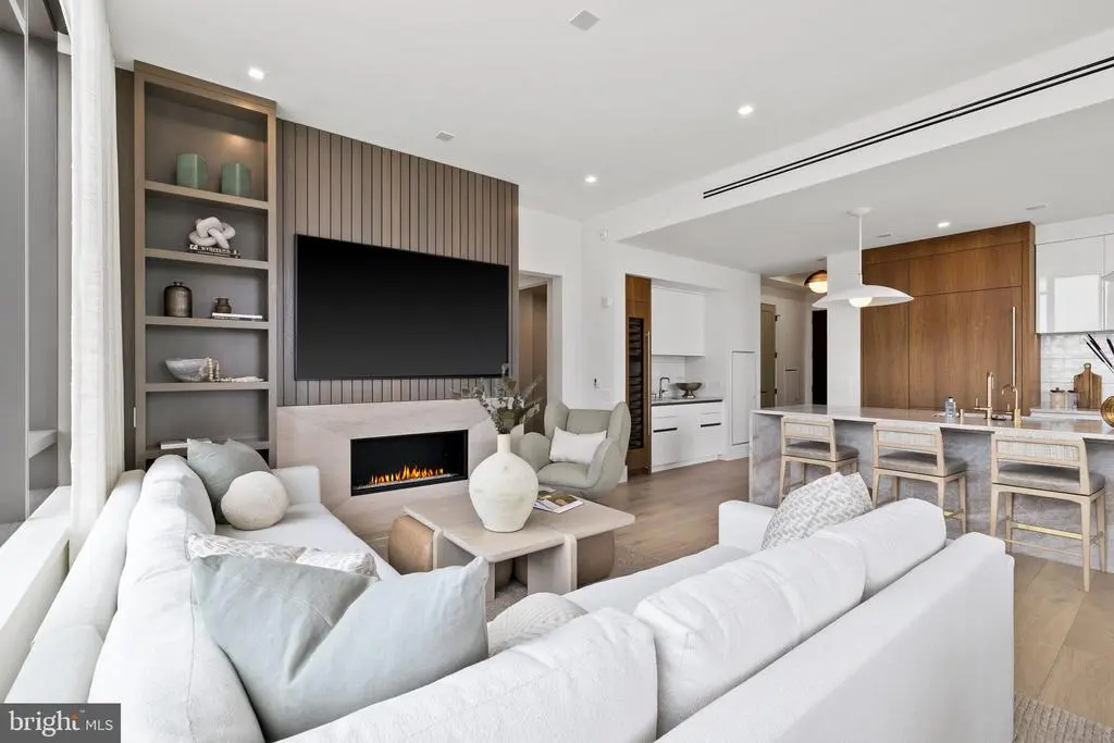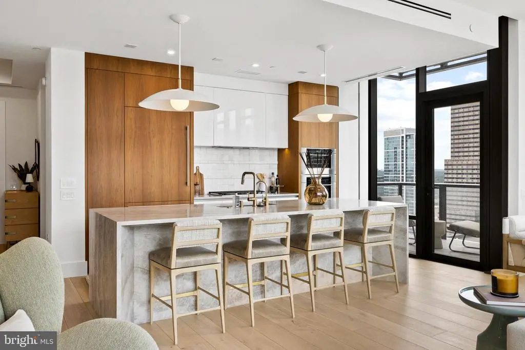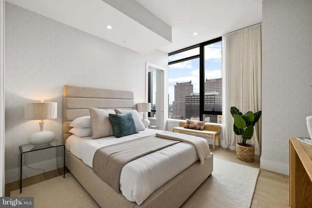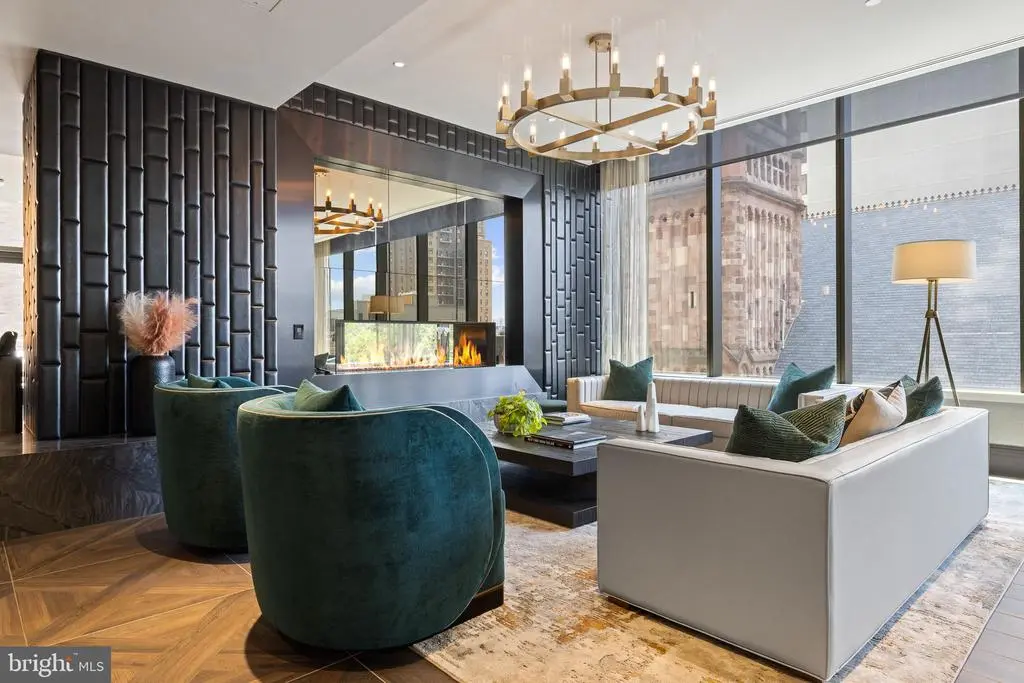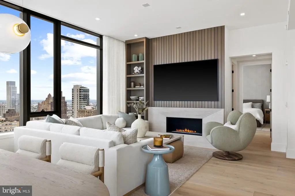 Welcome to Unit 2804 at The Laurel, an exquisitely upgraded 2-bedroom, 2.5-bathroom residence offering elevated living in one of Philadelphia’s most prestigious addresses overlooking Rittenhouse Square. This modern city home is a masterclass in sophisticated design, featuring high-end custom finishes, intelligent storage solutions, and refined architectural touches throughout. Upon entering, you are welcomed by wide, newly installed 11-foot Warren Christopher plank wood flooring that spans the living areas, creating a warm yet contemporary atmosphere. Anchoring the main living space is a custom-designed limestone fireplace, encased in white oak-stained wood with integrated LED-lit shelving and discreet hidden storage—perfectly blending function and style. The gourmet kitchen is tailored for the modern chef, boasting a stunning quartzite slab with 22 thoughtfully positioned outlets, under-cabinet LED lighting, and a sleek Italian tile backsplash. The bar area and bathrooms have all been fitted with upgraded designer faucets, while the kitchen sink includes a premium Julian basin, upgraded garbage disposal, and a hot/cold filtered water system for added convenience. Adjacent to the kitchen, the laundry room has been thoughtfully transformed into a multifunctional space with built-in step stools, drying racks, upgraded washer and dryer, and dedicated electric access for charging your Dyson vacuum—an uncommon yet thoughtful feature in city living. Both bedrooms offer generous proportions, enhanced by custom closet systems, recessed cam lighting, and electronic window shades for ultimate privacy and light control. The primary suite serves as a serene retreat, while the second bedroom is equally well-appointed. The half-bathroom stands out with an integrated sink, upgraded Morro fixtures, and custom lighting. Every detail throughout the home has been meticulously upgraded—from all new door hardware and custom light fixtures to repainted walls, added wallpaper accents, and upgraded baseboards for a cohesive and polished finish. For peace of mind, the home is equipped with a built-in security camera, while smart lighting and shade systems contribute to the residence's modern appeal. This turnkey home is a rare blend of beauty and function, combining premium materials with bespoke design touches. As a resident of The Laurel, you will enjoy access to an unparalleled suite of luxury amenities and full-service conveniences. Building amenities include an indoor and outdoor pool & hot tub, a stylish bar and lounge, 24-hour concierge, elevators, state-of-the-art fitness center, sauna, guest suites, golf simulator, meeting and party rooms, round-the-clock security, and even transportation services for added ease.