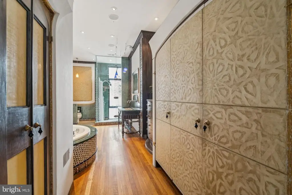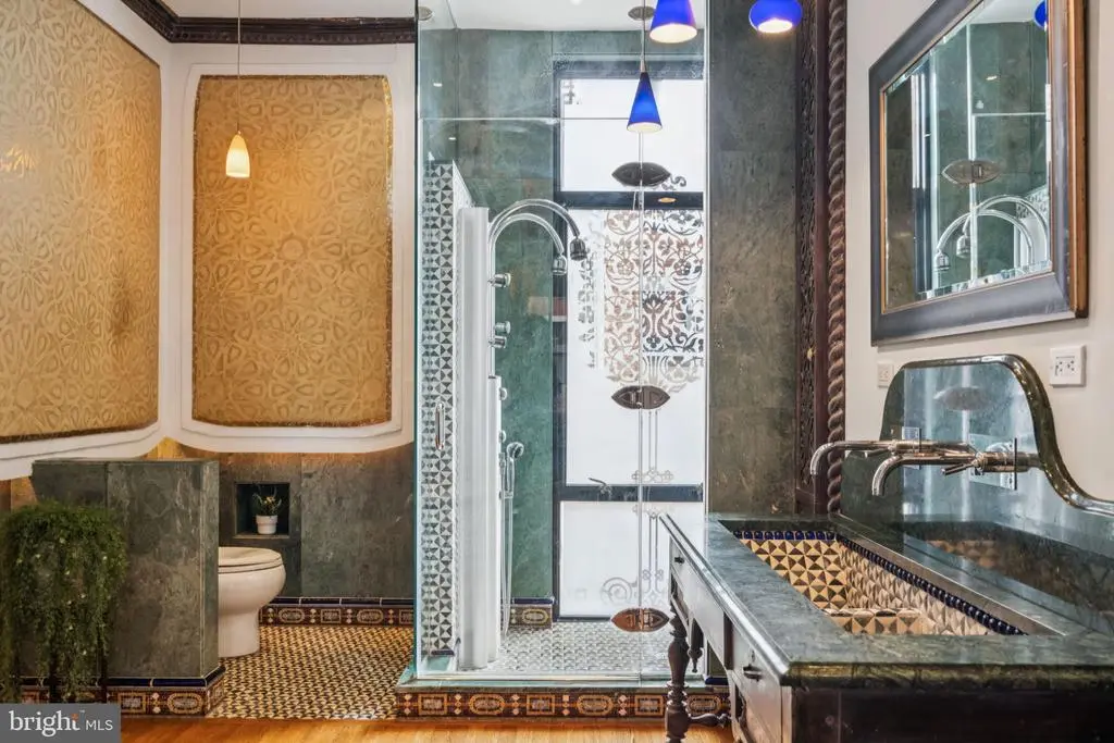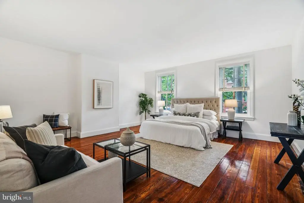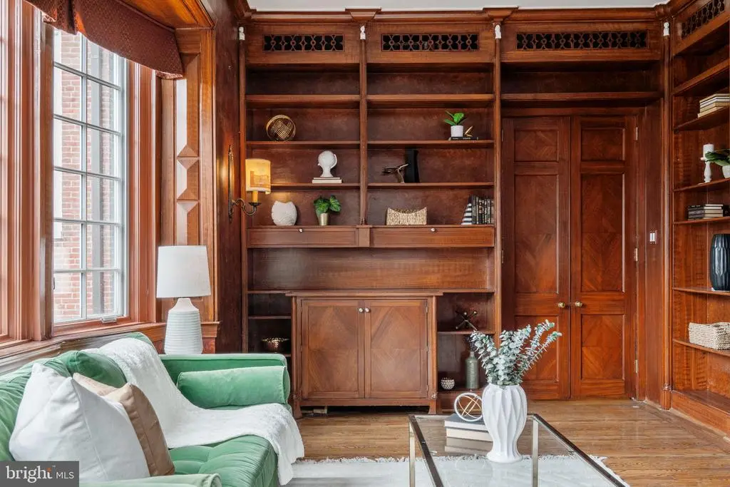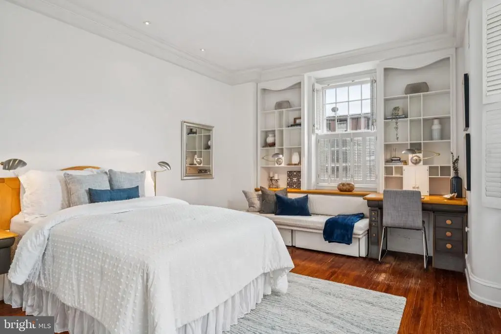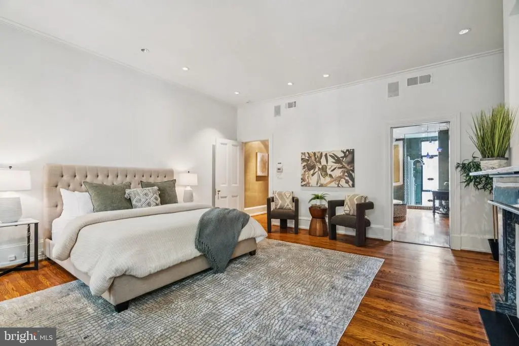 Welcome to 1818 Delancey Place—a magnificent 20-foot-wide historic residence with Garage Parking, nestled on one of Philadelphia’s most iconic and coveted blocks. Just one block from Rittenhouse Square, this elegant Federal-style home offers over 4,300 square feet of sun-drenched, beautifully proportioned living space, blending timeless architectural detail with modern comfort and flexibility. Enter through dual arched foyers and ascend two marble steps into a grand, light-filled formal dining room with soaring 12-foot ceilings, intricate crown moulding, and a stately original fireplace. A decorative niche provides the perfect spot to showcase artwork, creating a striking focal point. Custom inlaid flooring flows gracefully through the main level, visually connecting each space. A large archway leads to the refined living room at the front of the home, where tall windows overlook tree-lined Delancey Place and its distinguished facades, filling the space with natural light. Just off the dining room, French doors open to an intimate deck—also accessible from the spacious eat-in kitchen—perfect for morning coffee or evening cocktails. The expansive kitchen is anchored by a large, south-facing window that floods the space with natural light. With abundant cabinetry and generous proportions, it's ideal for designing your dream chef’s kitchen. A wide hallway connects the kitchen to the dining area and includes a coat closet, powder room, and access to the basement. The second floor features a sunlit, oversized library at the top of the stairs, complete with custom bookshelves, a wood-burning fireplace, and an adjacent wet bar—perfect for reading, relaxing, or entertaining. At the front of the home, the luxurious primary suite features high ceilings, tall windows, recessed lighting, and a decorative marble fireplace. Dual closets—including a walk-in—lead to the spacious en-suite bath, a marble-and-tile retreat with spa-like elegance. On the third floor, you’ll find two generously sized bedrooms with high ceilings, ample closet space, and en-suite baths. The front bedroom includes a private dressing room, while the rear bathroom exudes vintage charm with a clawfoot tub and beautiful tilework. The fourth floor offers a versatile front room with original random-width hardwood floors and a large skylight—perfect for a bedroom, studio, home office, or playroom. This level also includes a half bath, additional closets, and access to a potential roof deck. A bonus room adds flexibility as a gym, creative studio, or luggage room, or even a 6th bedroom. The partially finished basement features a spacious laundry room with double soaking sinks, a temperature-controlled wine cabinet, a half bath, ample storage, and direct access to the one-car garage via a heated driveway on Panama Street. Additional highlights include three working wood-burning fireplaces, three-zone HVAC, and built-in surround sound. With its unparalleled location, rich history, and expansive layout, 1818 Delancey Place is a rare opportunity to own a truly exceptional home on Philadelphia’s most admired street.