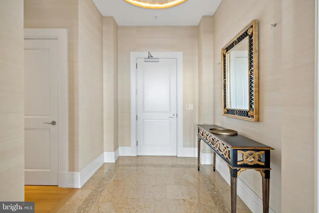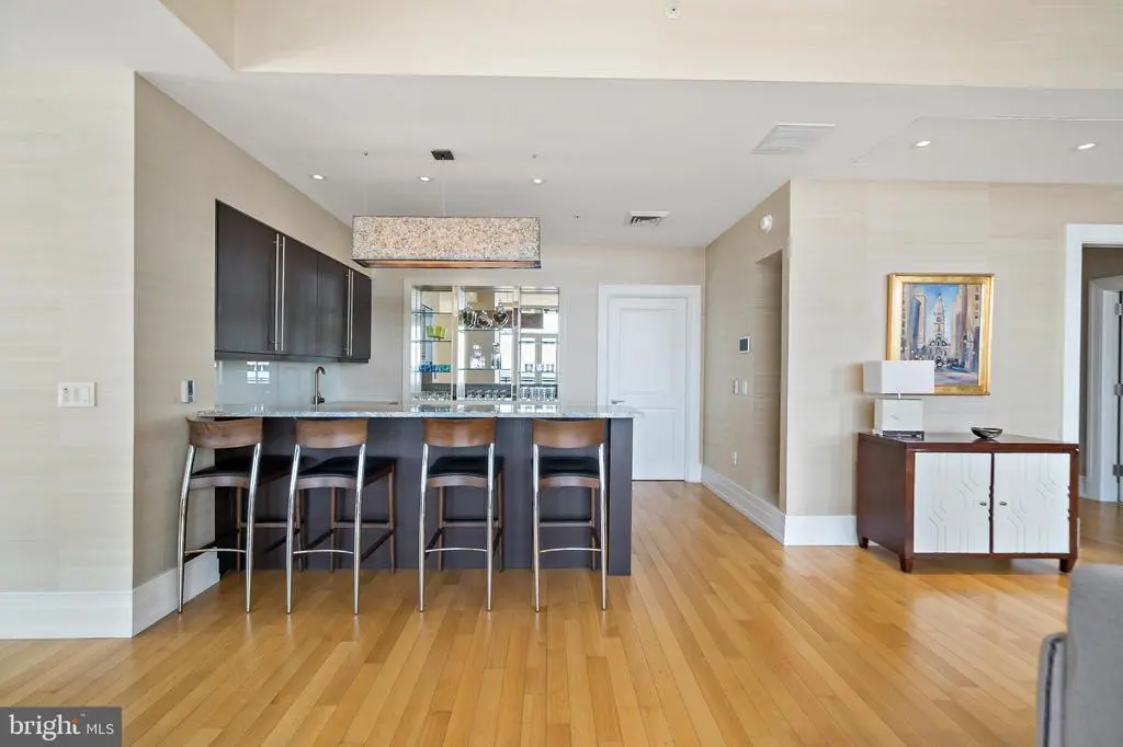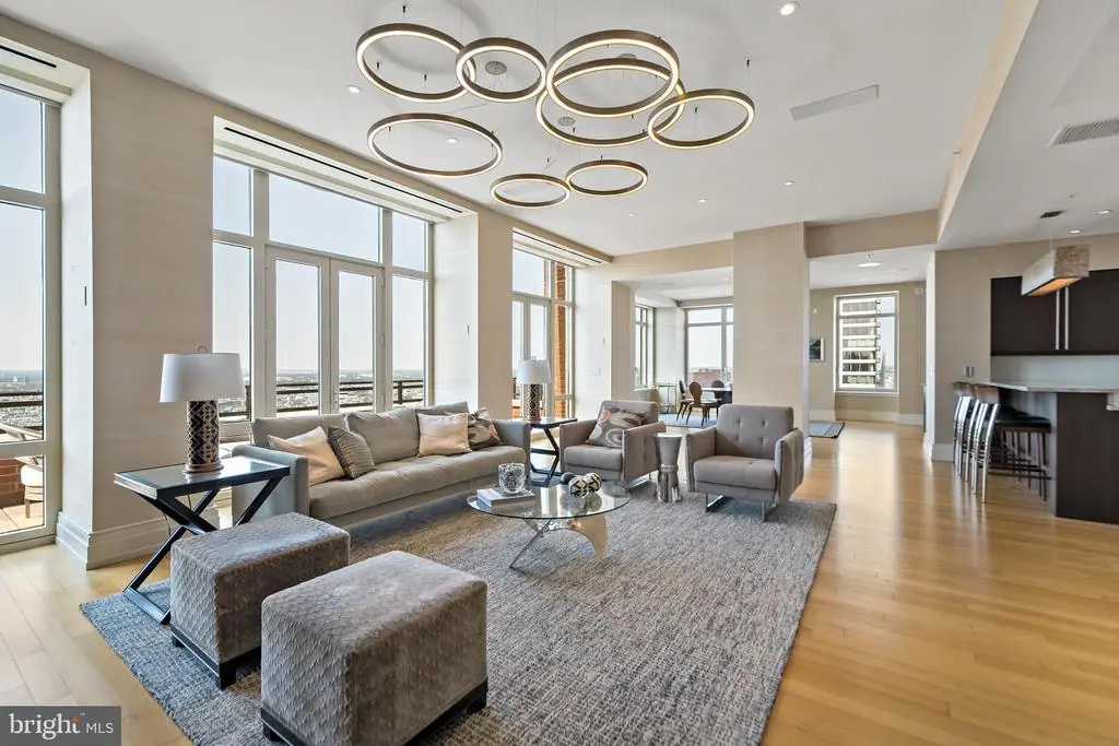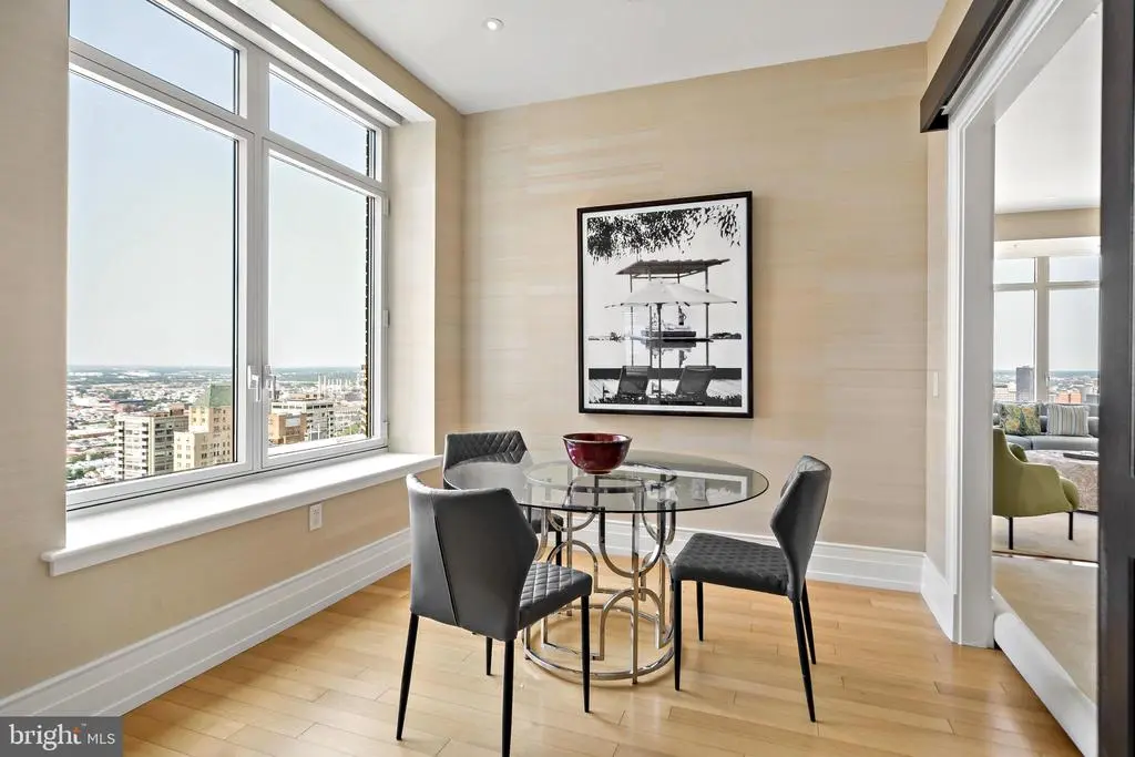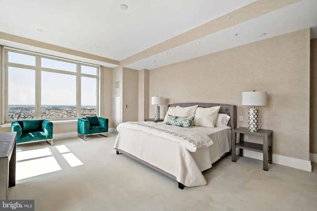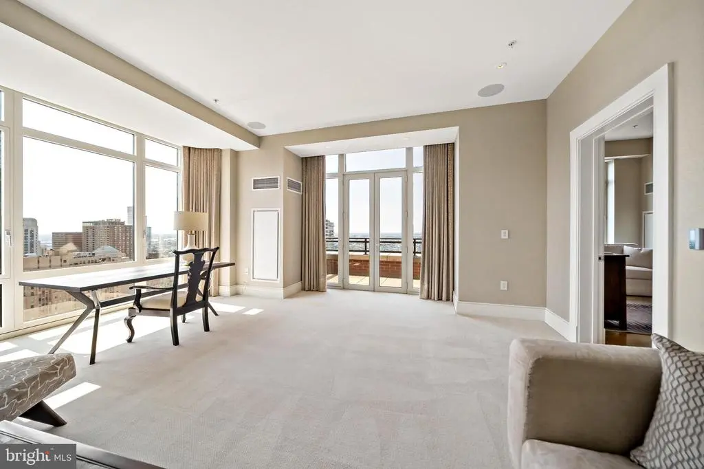 Welcome to Unit 3102 at 10 Rittenhouse, an extraordinary nearly full-floor residence offering approximately 5,400 square feet of refined, light-filled living space high above Rittenhouse Square. This home delivers the scale and comfort of a modern townhome, elevated by the white-glove amenities and prestige of one of Philadelphia’s most iconic buildings. An incredibly rare offering, the unit includes four garage parking spaces—two of which are the ultra-coveted self-park spots located within the building’s garage, along with two additional valet spaces, providing flexibility and convenience that is nearly impossible to find in Center City. Inside, the residence opens to sweeping 270-degree skyline views centered on Rittenhouse Square, visible through floor-to-ceiling glass double doors and three separate balconies. Natural light fills every room, creating a sense of openness and calm that is matched by the clean, contemporary design throughout. The main living and entertaining areas are expansive and welcoming, anchored by a custom-built wall unit that houses a 100" television and includes a hidden door accessing the AV closet. It is complemented by a beautifully designed bar equipped with a wine fridge, ice maker, sink, and a truly massive walk-in pantry that functions as a secondary prep space or staging area for entertaining. The dining area is perfectly positioned just off the kitchen, facing southwest, where you’ll enjoy open, unobstructed corner-window views that stretch toward the skyline and flood the space with golden afternoon light. The flow from kitchen to dining to living is effortless and designed for both large-scale entertaining and intimate daily living. The primary suite is a retreat all its own—thoughtfully laid out and filled with soft natural light. It features three dedicated closets, including two walk-ins and a spectacular L-shaped dressing closet with an east-facing window. The spa-style bathroom includes a separate water closet, a jetted soaking tub with an east-facing window and wall-mounted TV for cozy baths, and two separate vanities. Just beyond the dressing room is a third vanity, ideal for makeup or grooming. The enormous walk-in closet, fully customized by California Closets, feels worthy of a magazine feature. Past the dressing room, a tranquil home office space offers complete privacy, ideal for focused work or quiet reflection, and opens to its own east-facing balcony with morning light and city views. Two additional bedroom suites are located off a den on the west side of the home. Each includes an en-suite bathroom and generous closets, offering flexibility for guests, family, or remote work setups. There are two separate laundry areas—one tucked discreetly into the primary suite and another off the kitchen—adding function and convenience to daily living. The entire residence is equipped with a range of powered sunshades, blackout shades, and draperies, and features a fully customized Lutron lighting system. More than a dozen zoned climate controls ensure year-round comfort, room by room. Living at 10 Rittenhouse includes access to five-star amenities and services, including 24/7 concierge, a state-of-the-art fitness center, indoor pool, hospitality suite, chauffeur-driven house vehicle, and more. The building's discreet entrance on 18th Street places you just steps from the city’s best dining, shopping, and cultural institutions. This is a rare opportunity to own one of the most spacious, private, and refined residences in the city—designed for those who value scale, light, and luxury at the highest level.